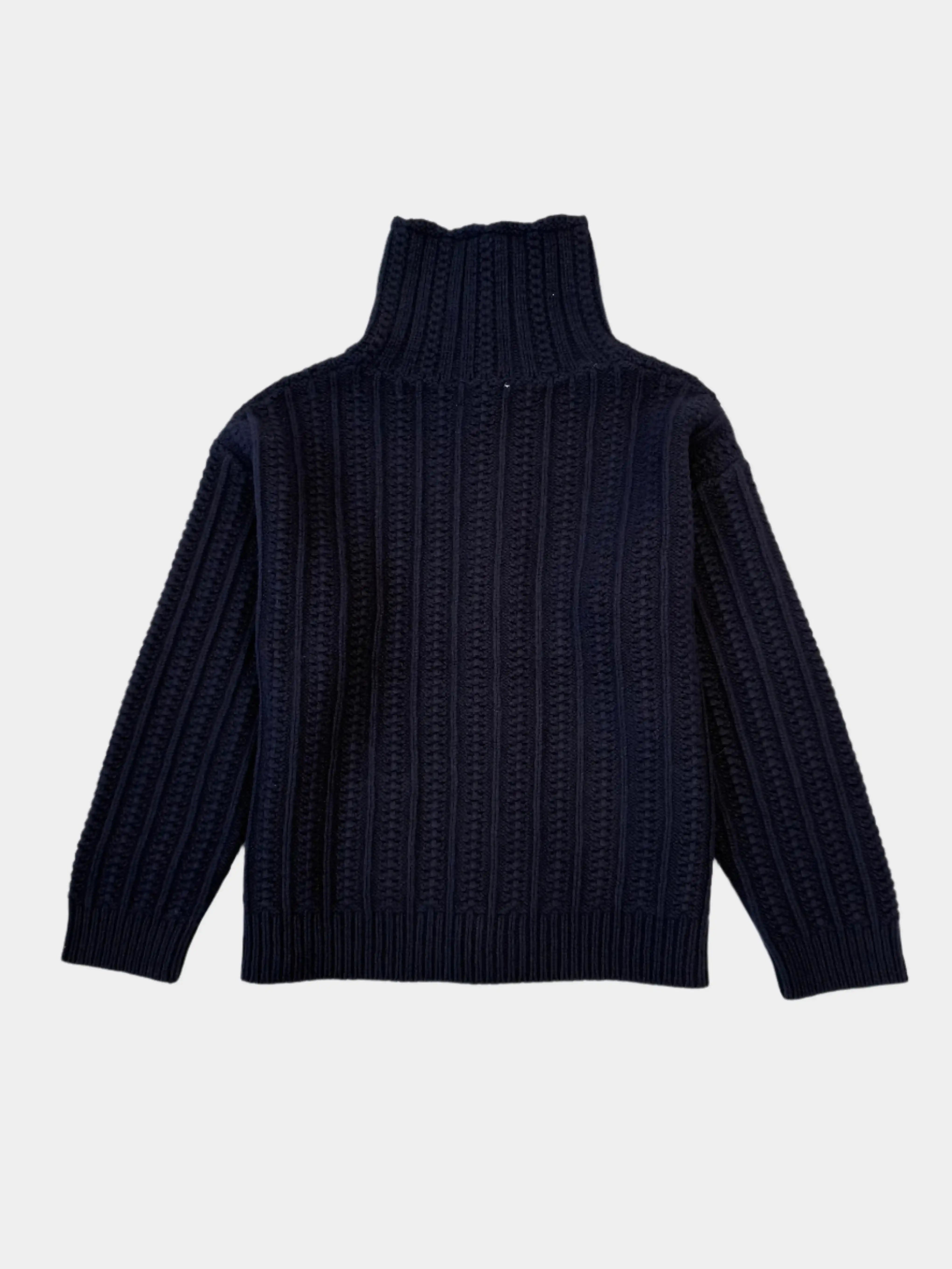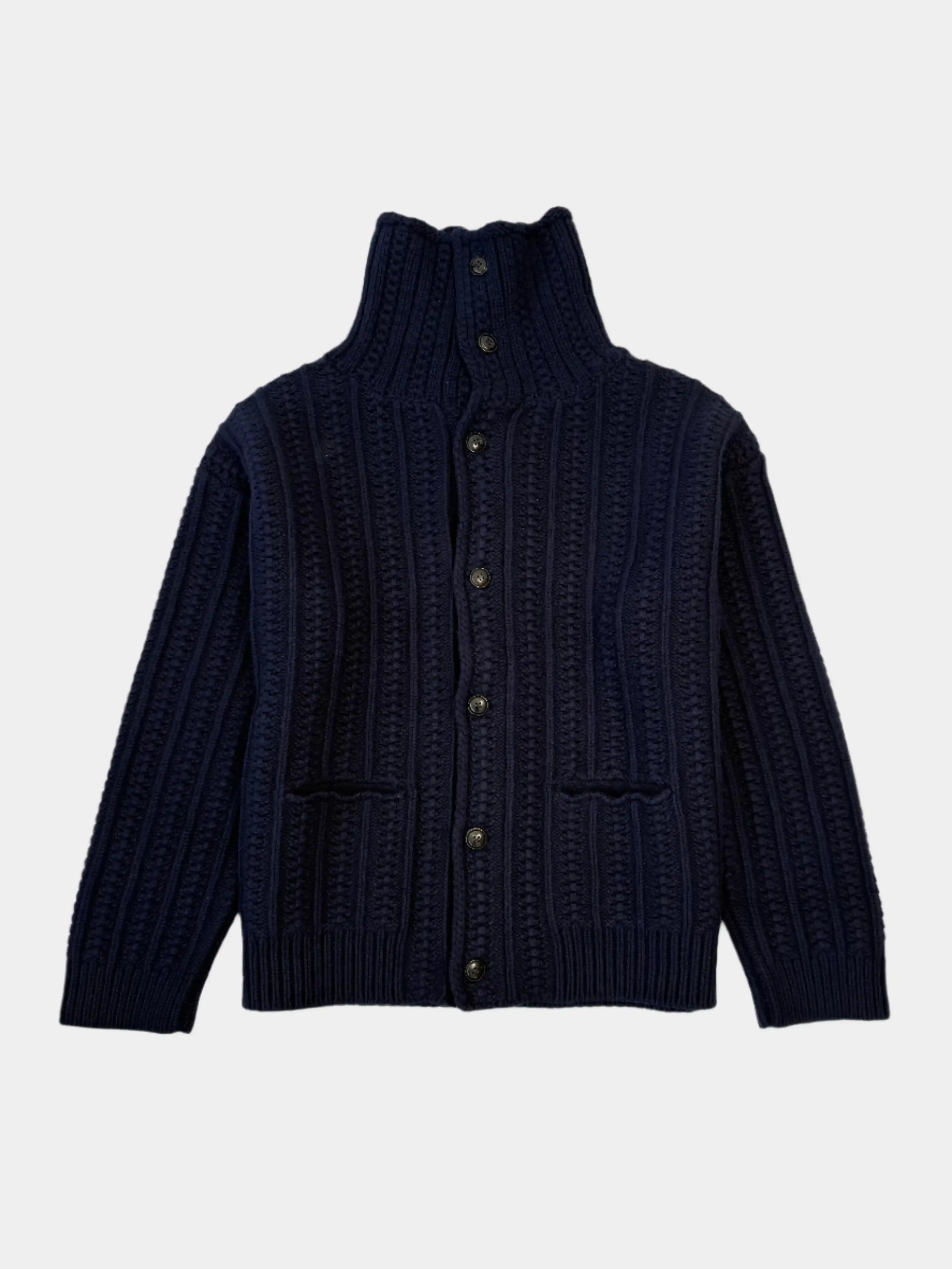 Questa polo in maglia si distingue per la lavorazione strutturata a coste e l’intreccio tridimensionale che dona profondità al capo. Il collo alto e i bottoni frontali la rendono perfetta per completare look eleganti o casual, mantenendo sempre un tocco sofisticato. Realizzata in 100% lana vergine per un comfort termico naturale.