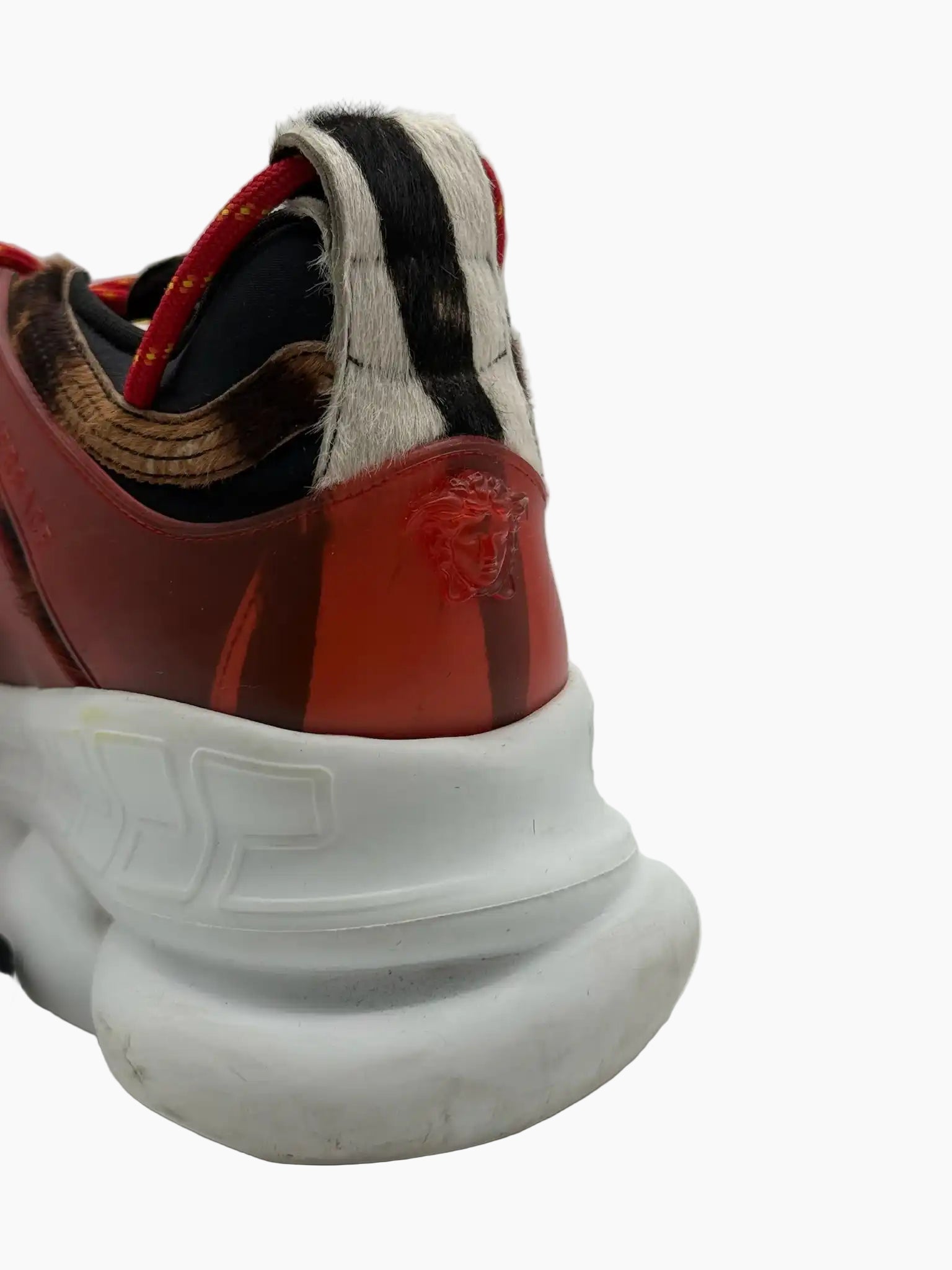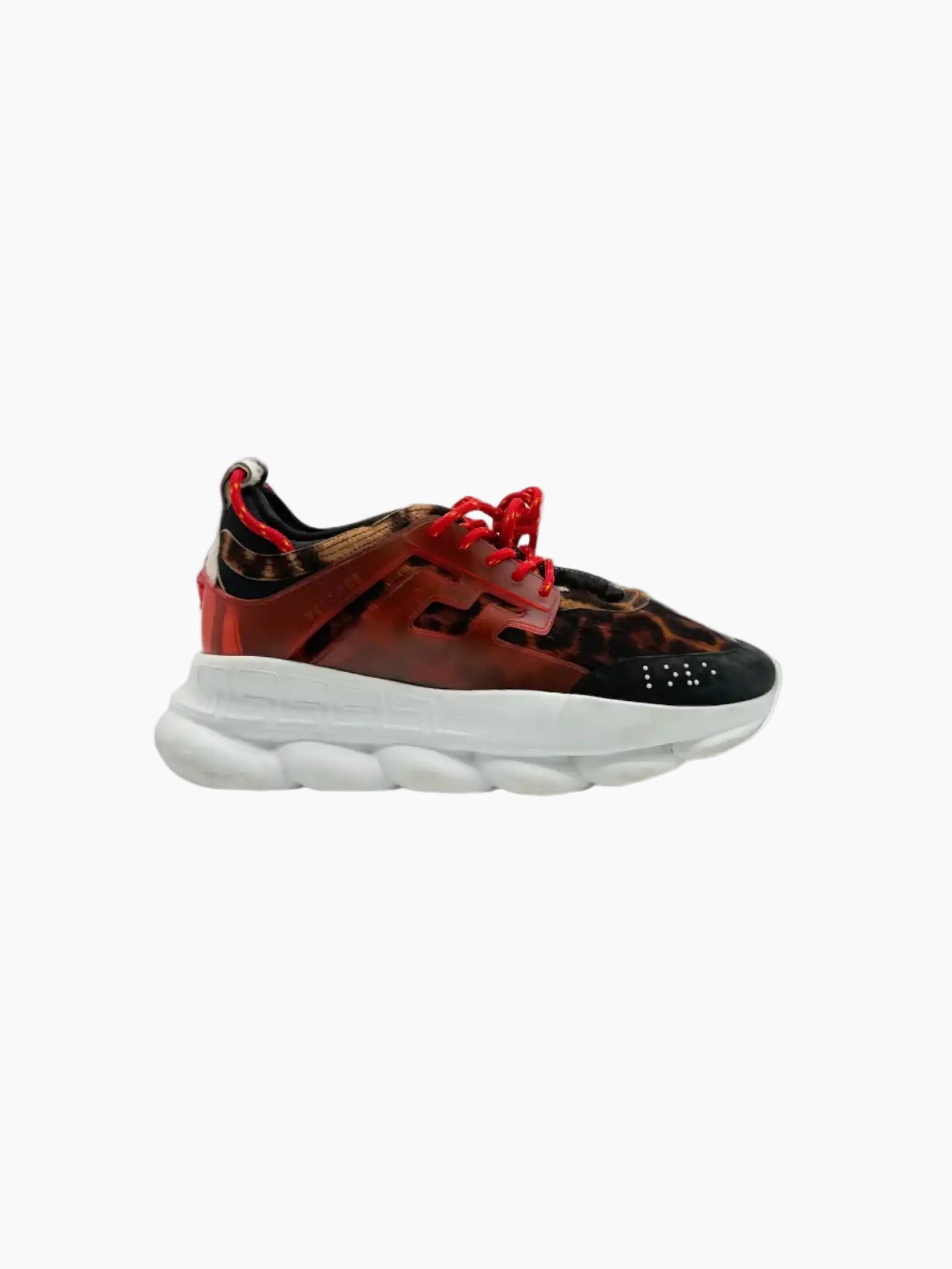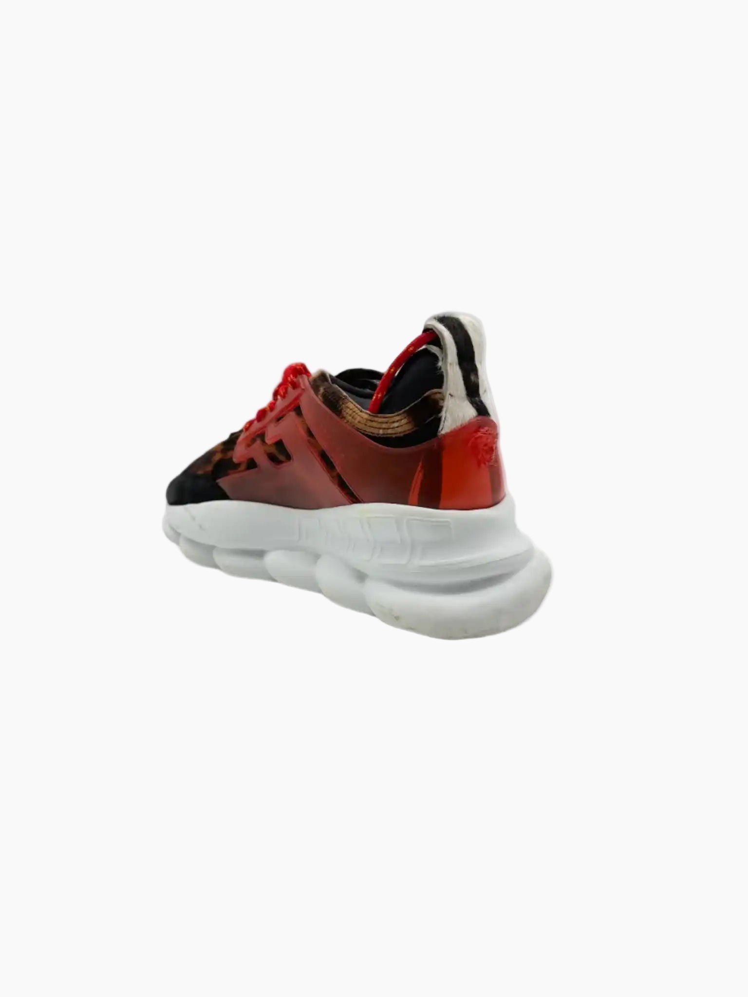 Le sneakers Chain Reaction di Versace sono un'ode allo stile audace e alla sperimentazione estetica. Questo modello presenta una tomaia con pattern animalier e inserti in cavallino effetto zebrato, valorizzata da dettagli in pelle lucida rossa e una suola chunky in gomma bianca che richiama l’iconico motivo Greca. I lacci tono su tono e il branding Versace completano un design che fonde grinta e lusso contemporaneo.