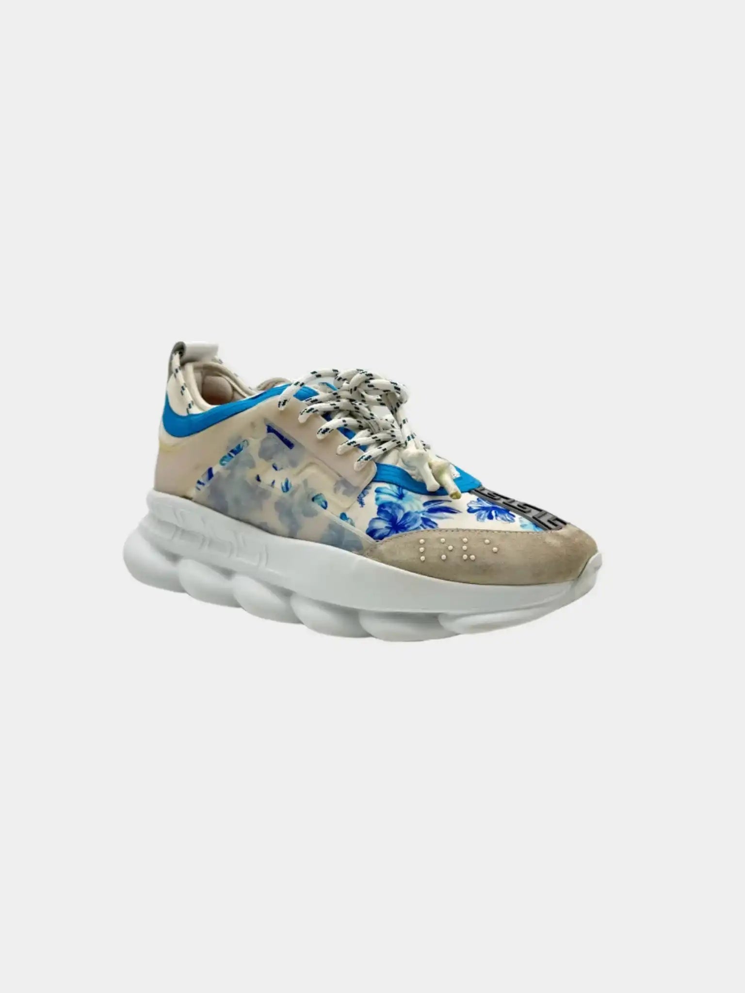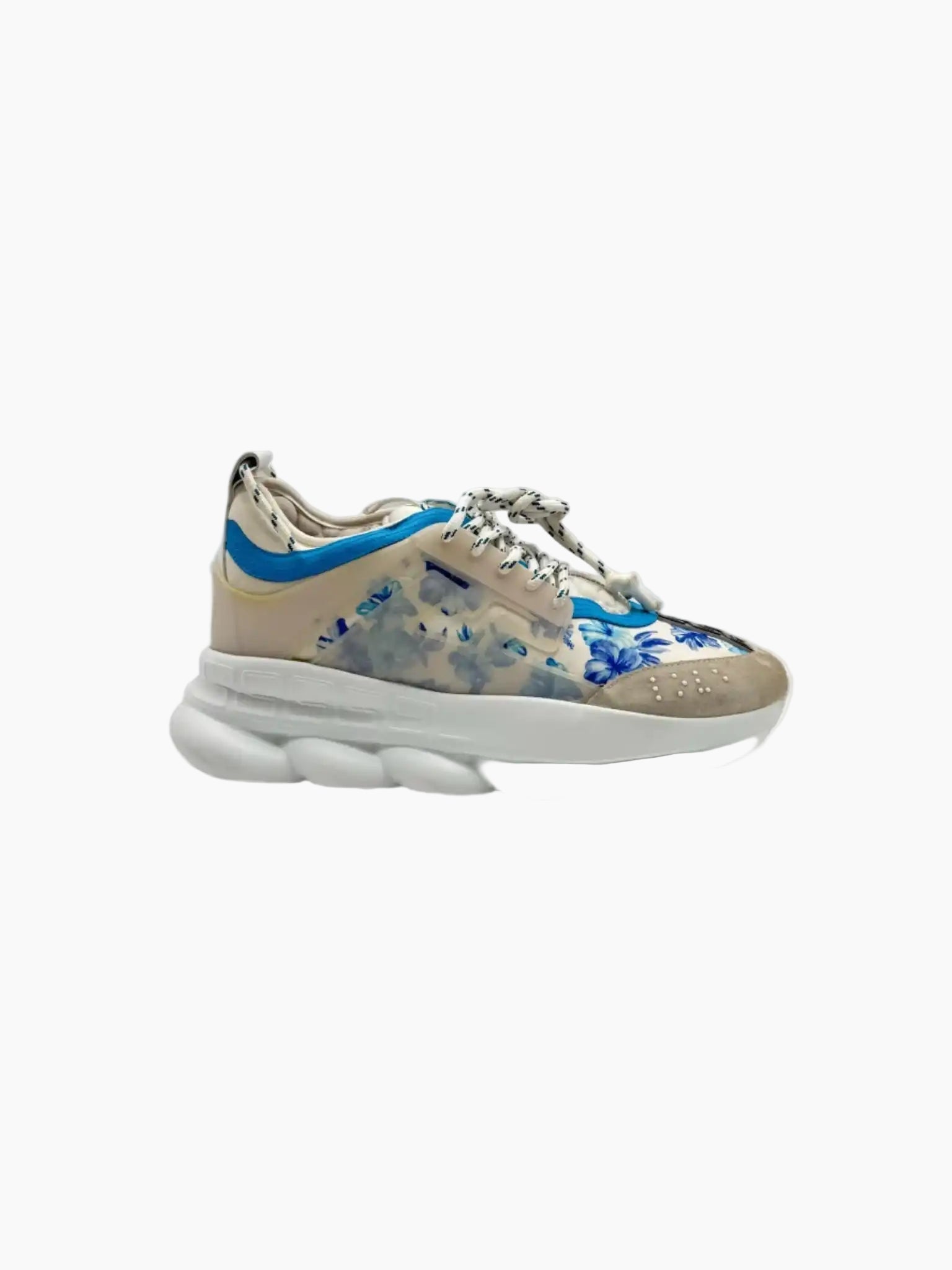 Le sneakers Versace Chain Reaction combinano un'estetica d'impatto con un comfort elevato, distinguendosi per il loro design audace e ricercato. Questa versione presenta una tomaia con stampa floreale nei toni dell’azzurro e blu, inserti in suede beige e finiture in pelle bianca. Il look è completato dall'iconica suola chunky in gomma bianca, ispirata al motivo della catena. I dettagli in blu acceso e le stringhe bianche con pattern nero conferiscono alla scarpa un tocco contemporaneo e sofisticato.