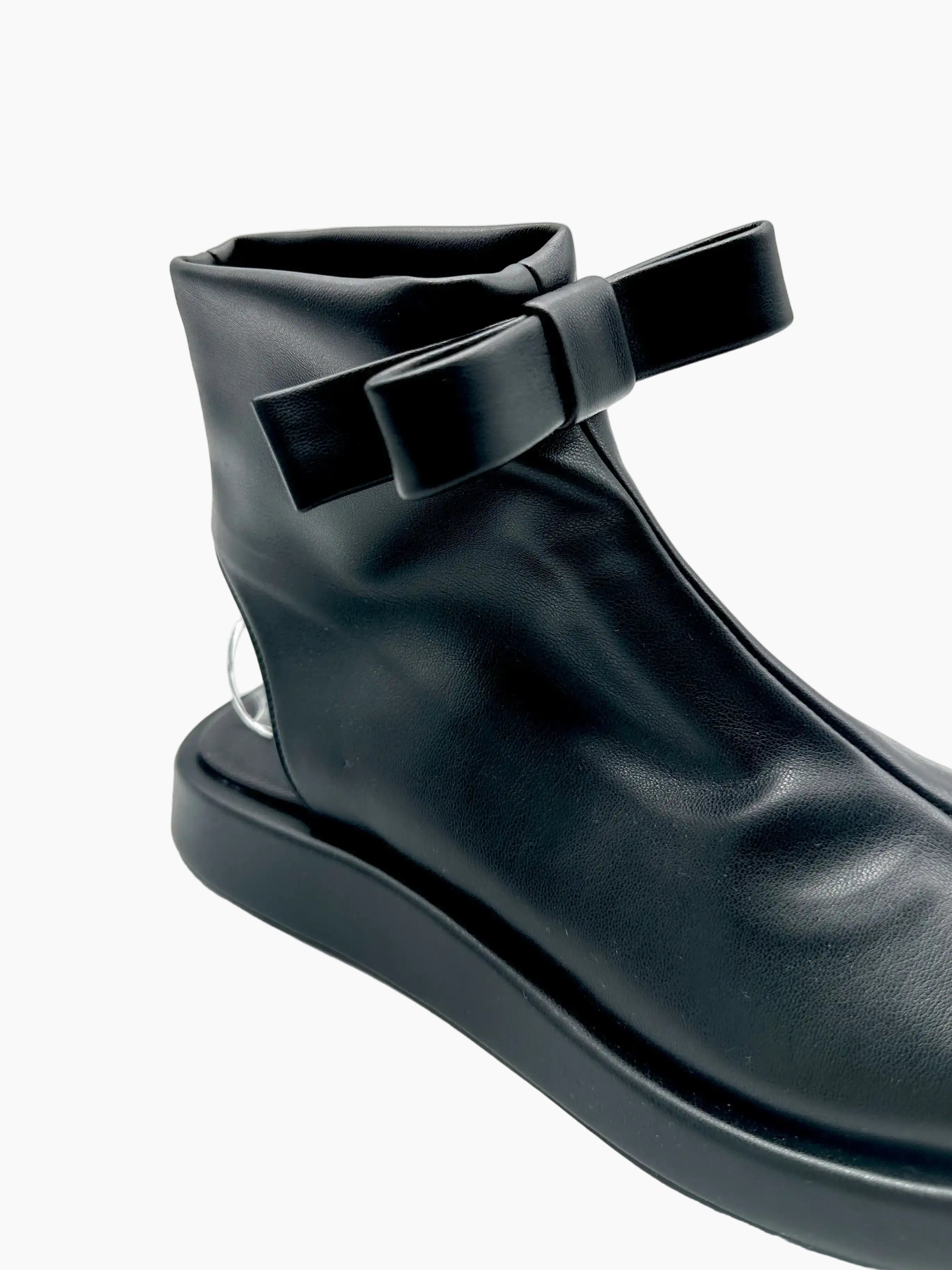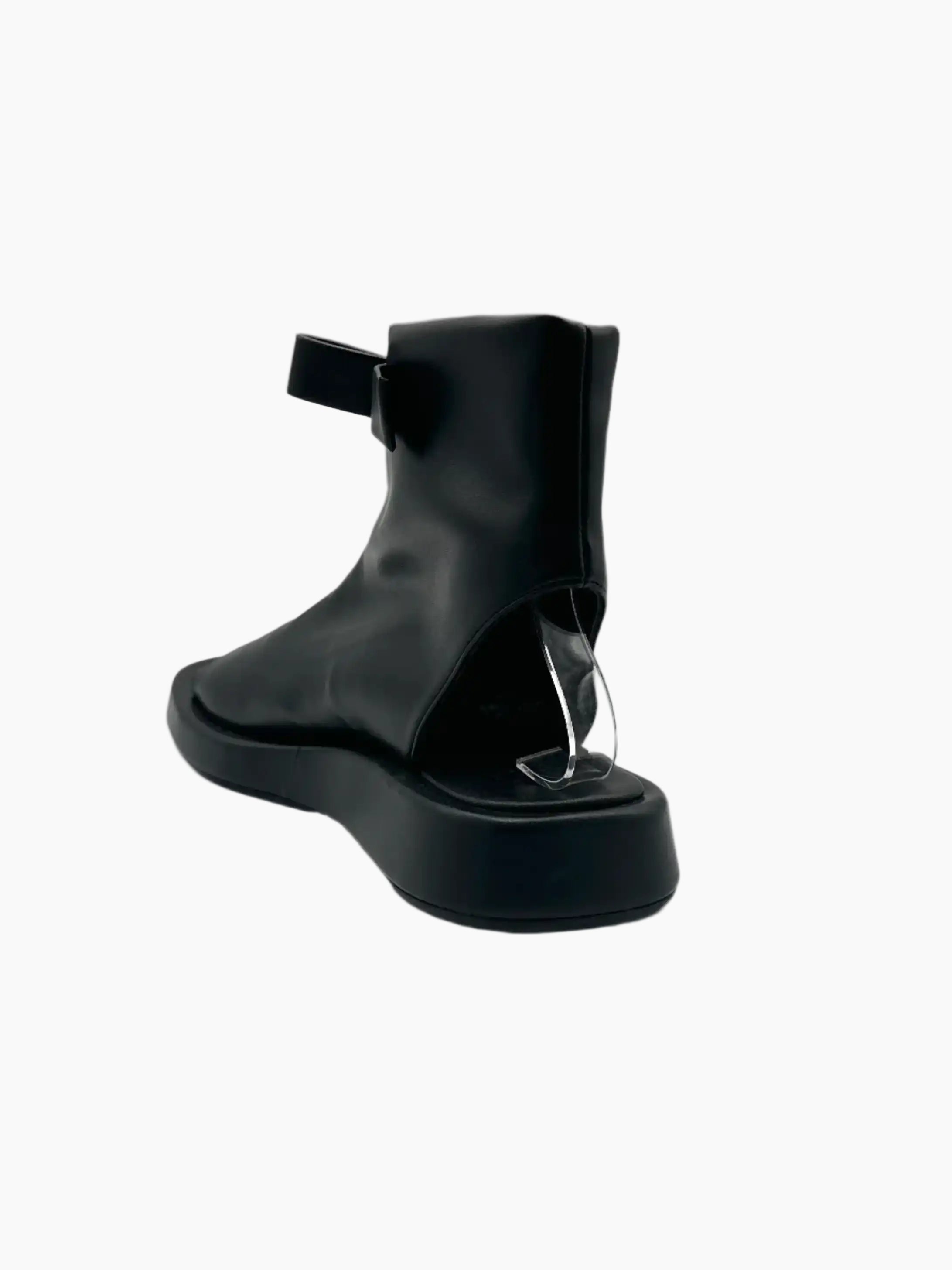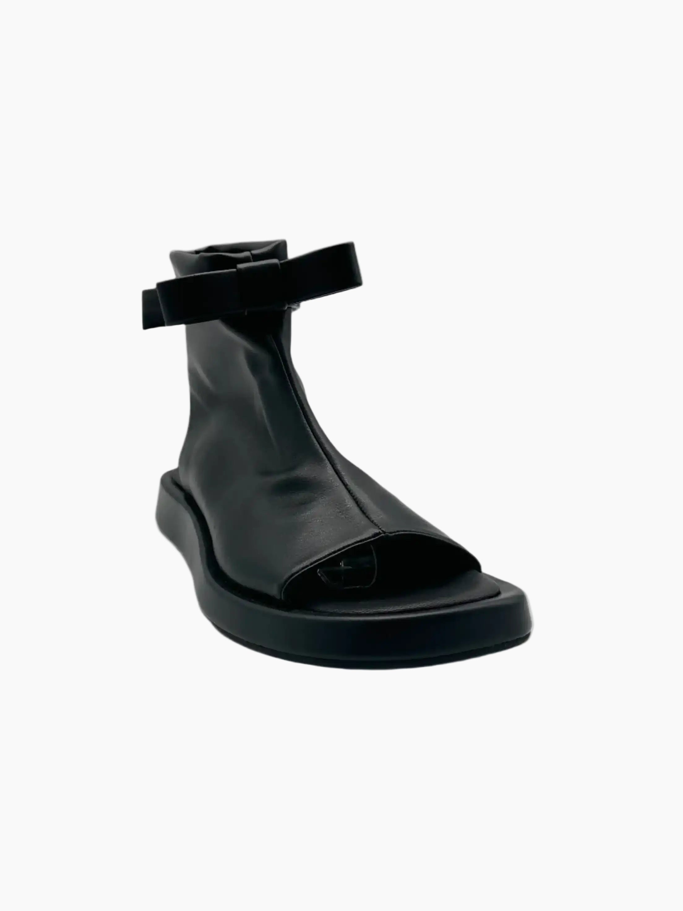 Questi sandali neri firmati Gia Borghini reinterpretano lo stile estivo con una silhouette essenziale e contemporanea. Realizzati in morbida pelle, avvolgono il piede con un design chiuso sul collo e un’apertura sulla punta, garantendo comfort e stile. Il dettaglio del cinturino alla caviglia con fiocco aggiunge un tocco distintivo e sofisticato. Ideali per accompagnare look casual o outfit più ricercati nelle giornate più calde.