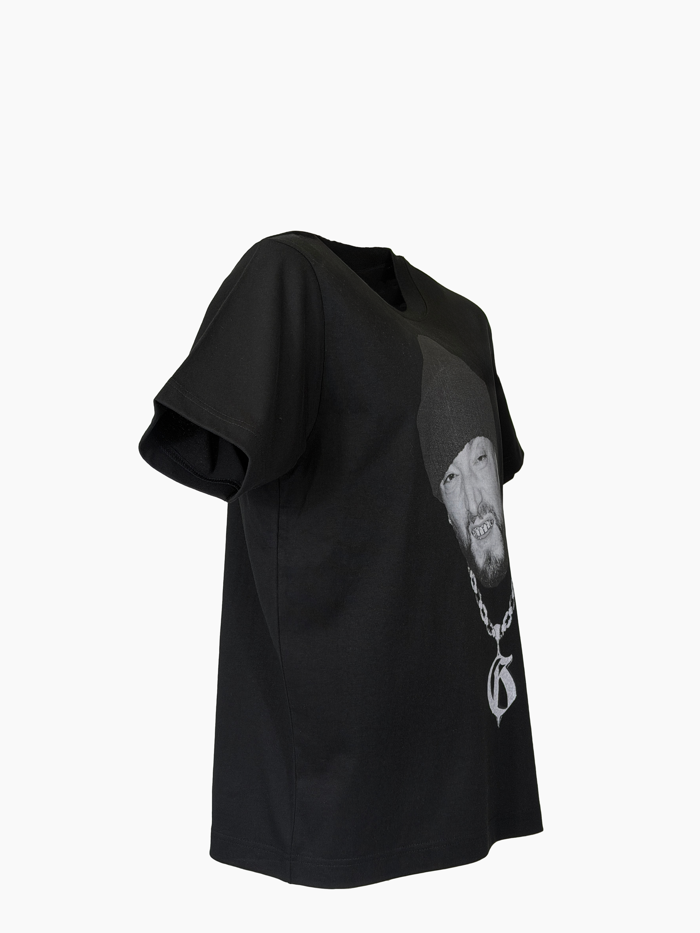 Sul fronte, il ritratto iconico in bianco e nero del rapper con catena e grillz; sul retro, il monogramma "G" oversize in stile gotico.
