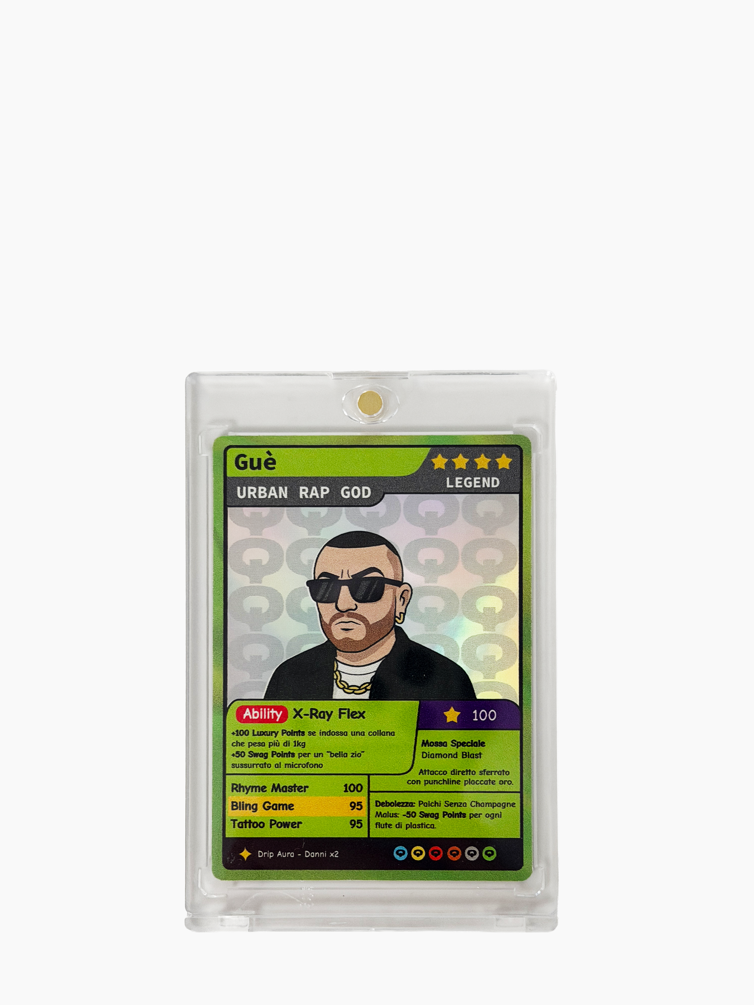 Ogni t-shirt include la Guè Card collezionabile esclusiva, con stats e dettagli ispirati al mondo delle trading cards.