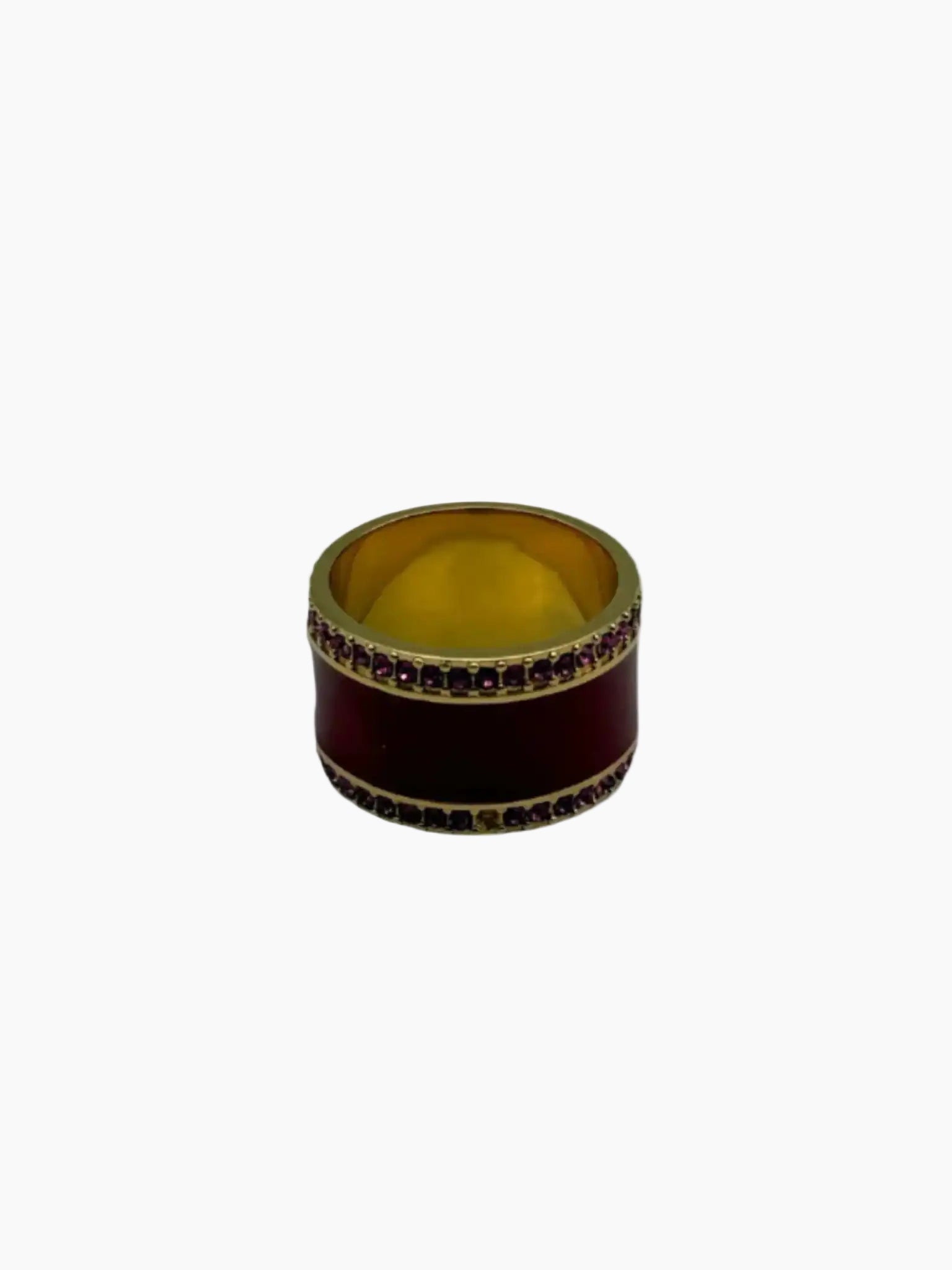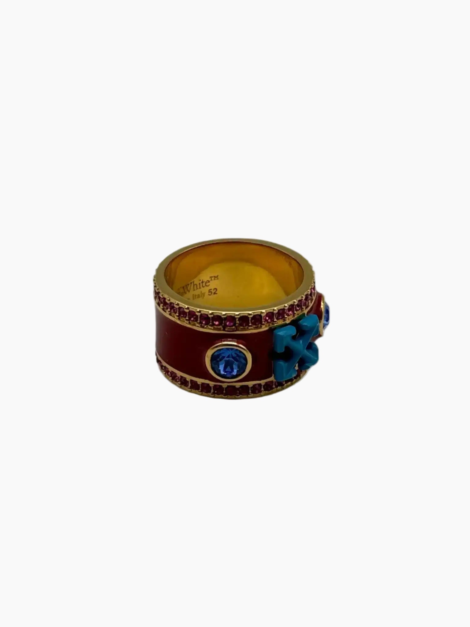 Anello in metallo dorato con fascia smaltata rossa, strass a contrasto rosa e cristallo turchese al centro con logo freccia. Design audace e decorativo, ideale per un accessorio statement d'effetto.