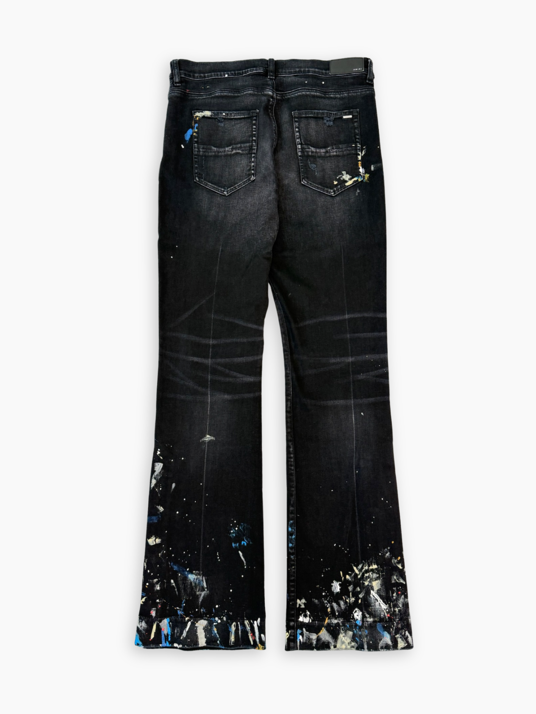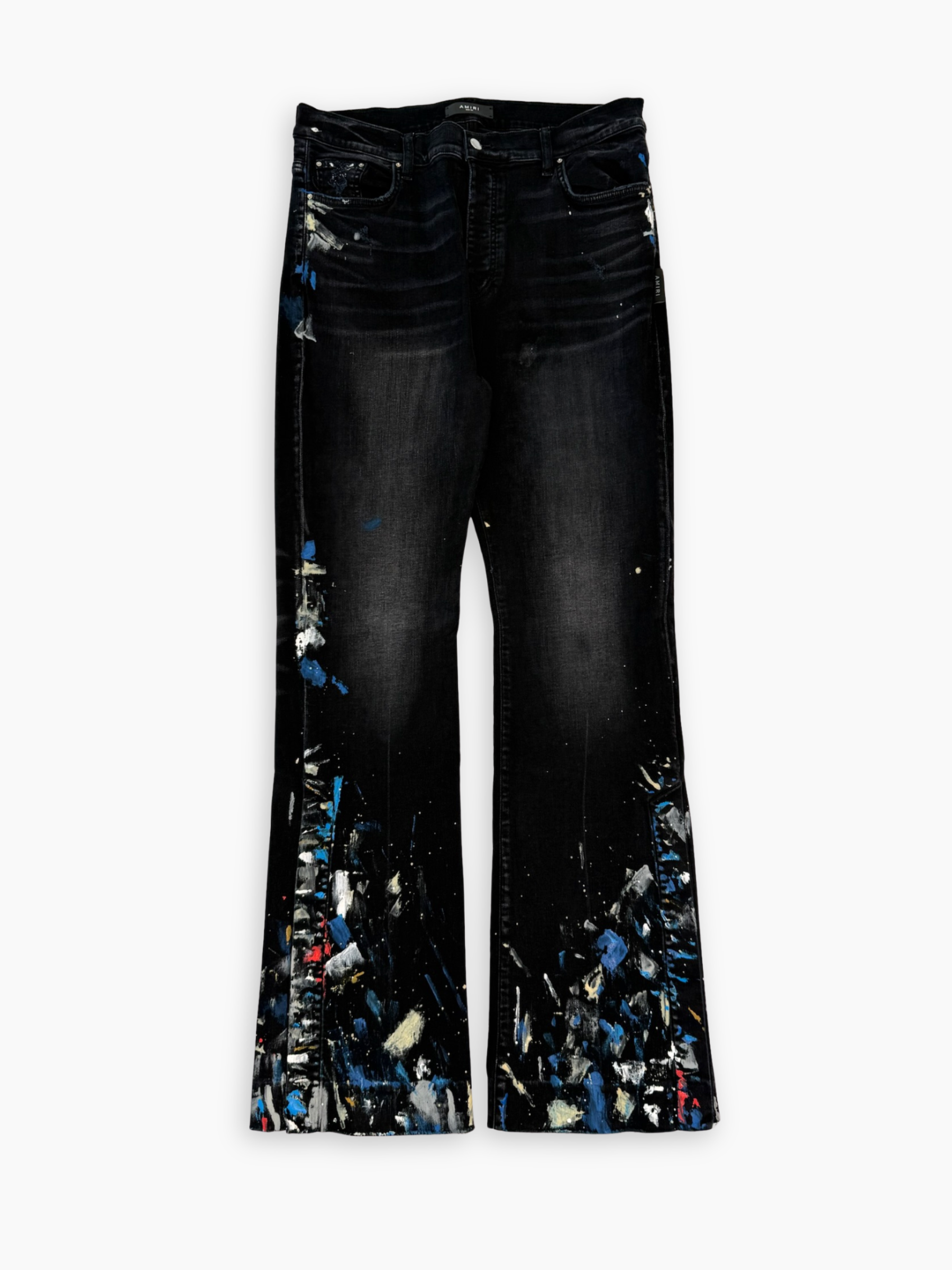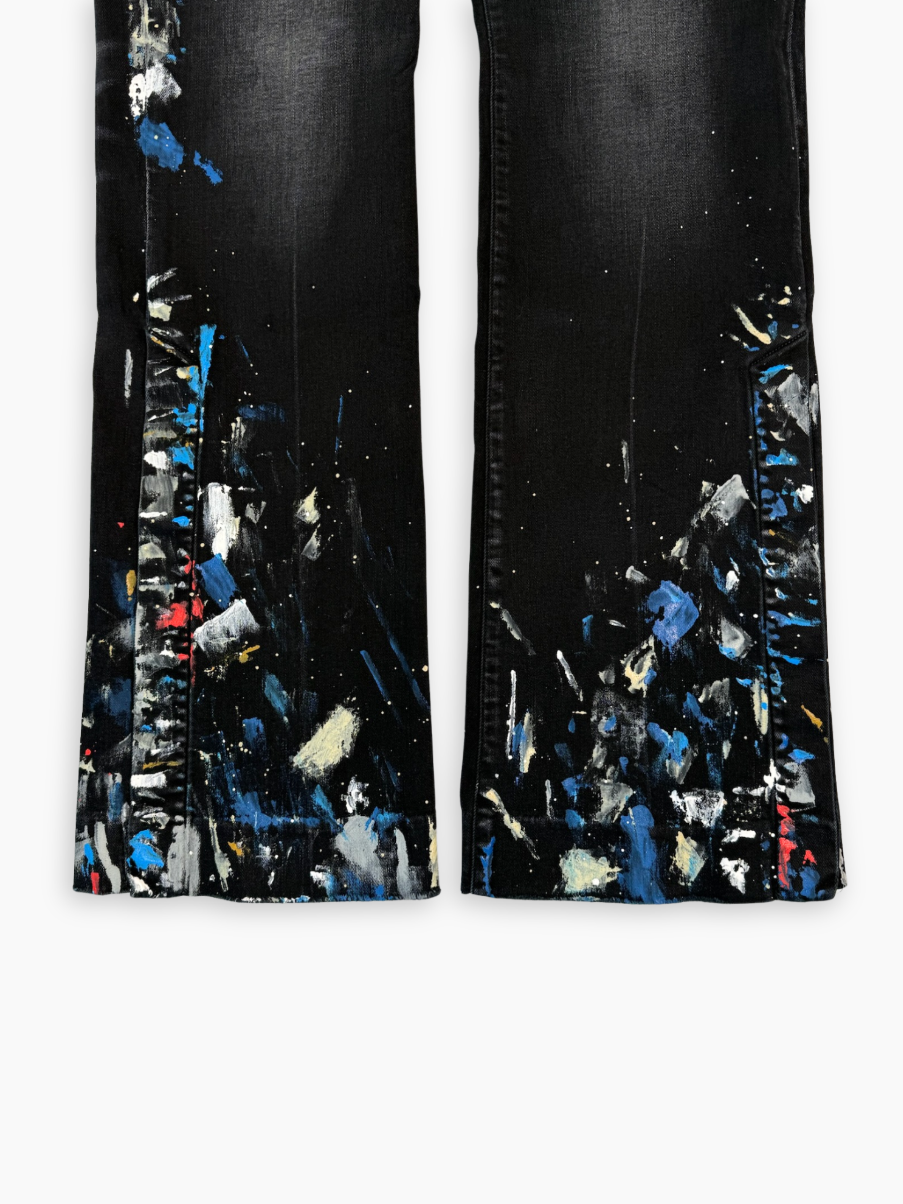 Jeans a zampa neri con effetto paint splatter multicolor, dal carattere deciso e creativo. Realizzati in denim stretch, presentano una base nera con sfumature effetto used e schizzi di vernice blu, bianca e rossa lungo le gambe e il fondo. Il taglio svasato aggiunge un tocco rétro rivisitato in chiave contemporanea, ideale per look urban e d’impatto.