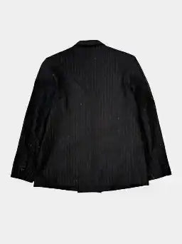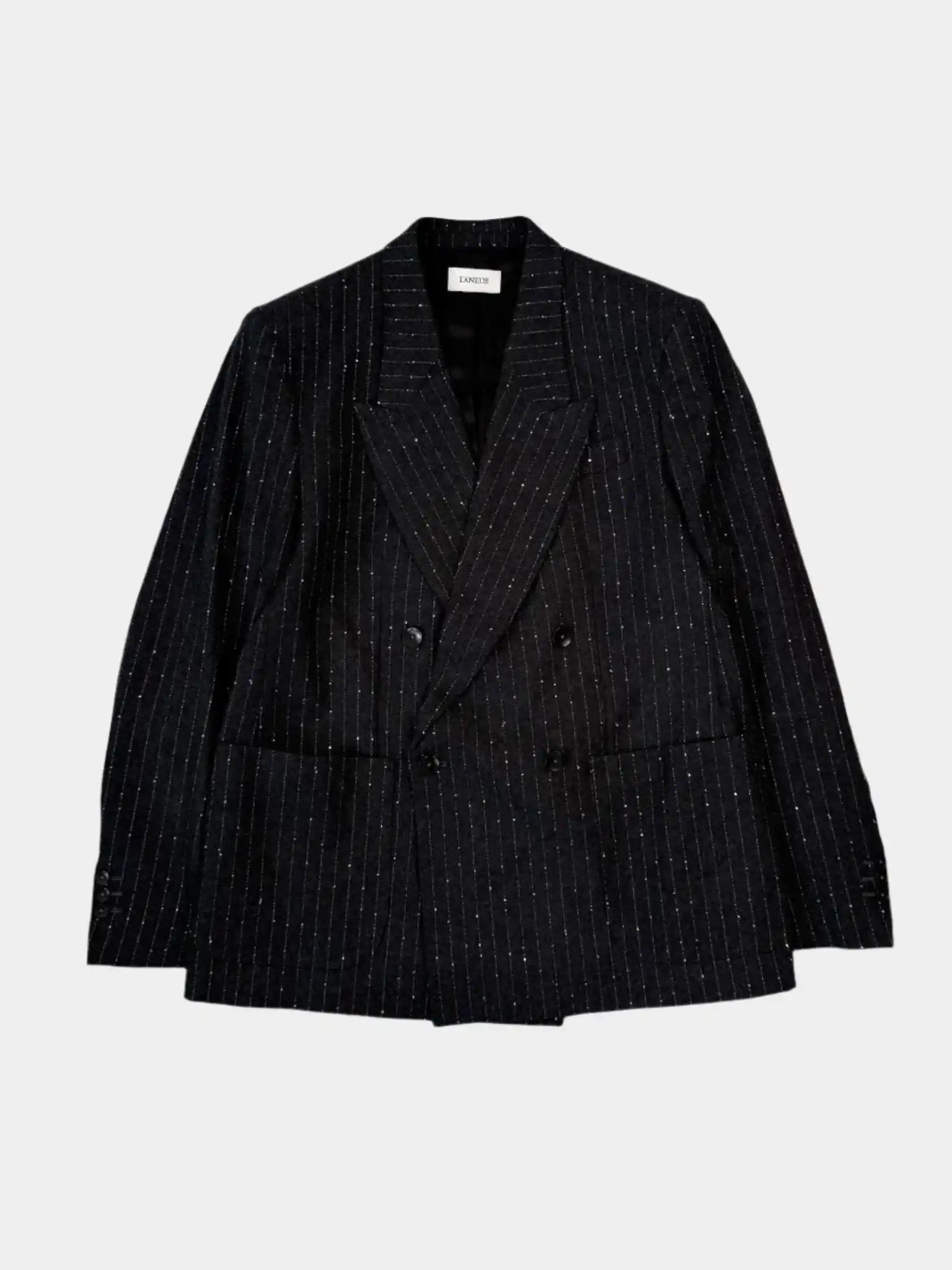 Questo blazer doppiopetto firmato Laneus unisce l'eleganza del taglio sartoriale alle finiture moderne. Il tessuto in lana vergine con filato brillante dona un tocco di luce alla fantasia gessata grigia. Il design strutturato, con revers a lancia e chiusura frontale a due bottoni, rende questo capo perfetto per outfit formali con un twist contemporaneo.