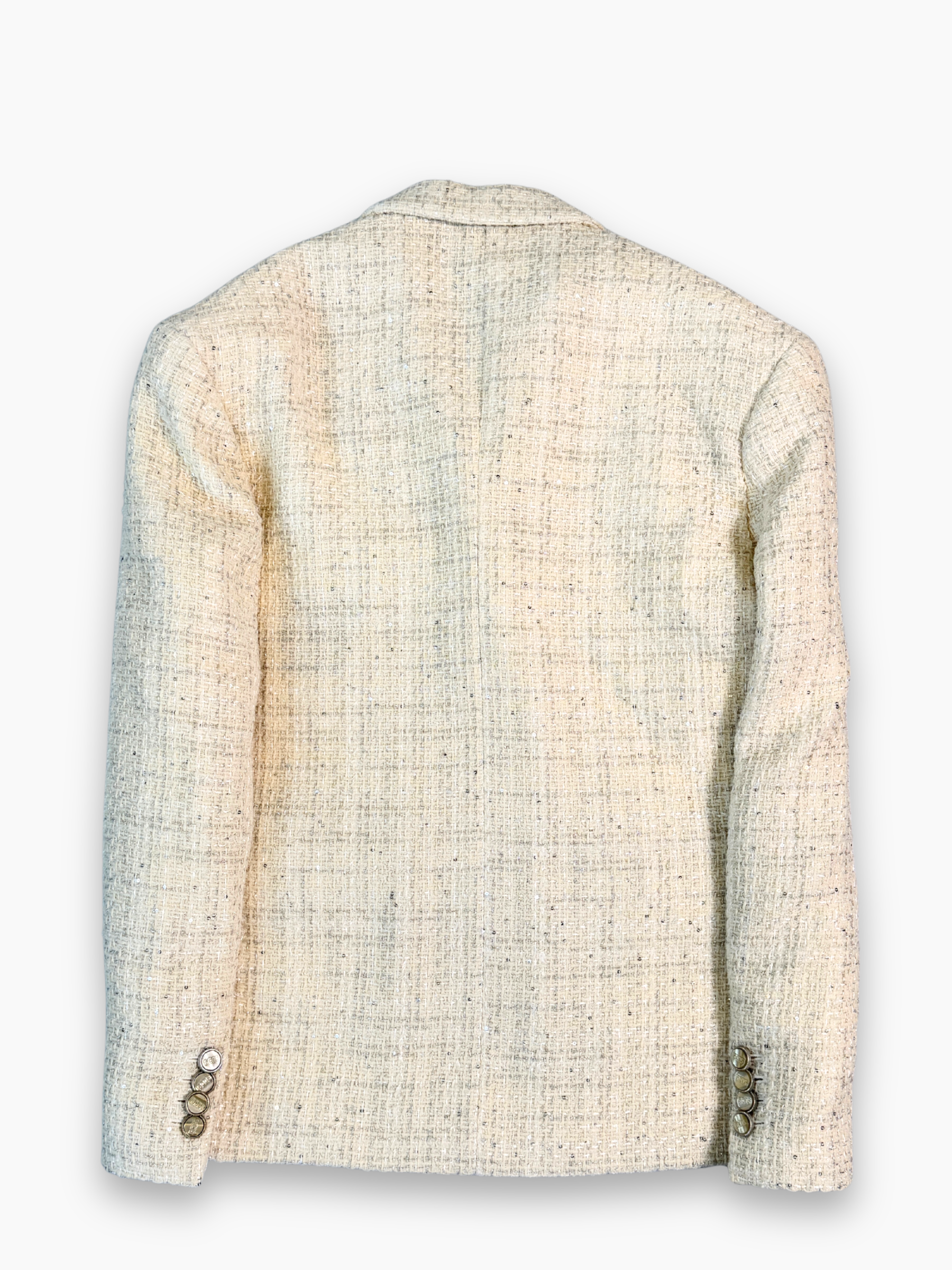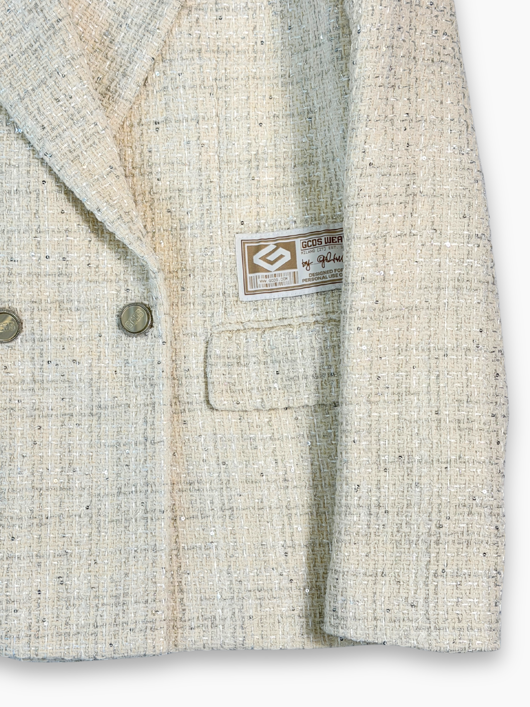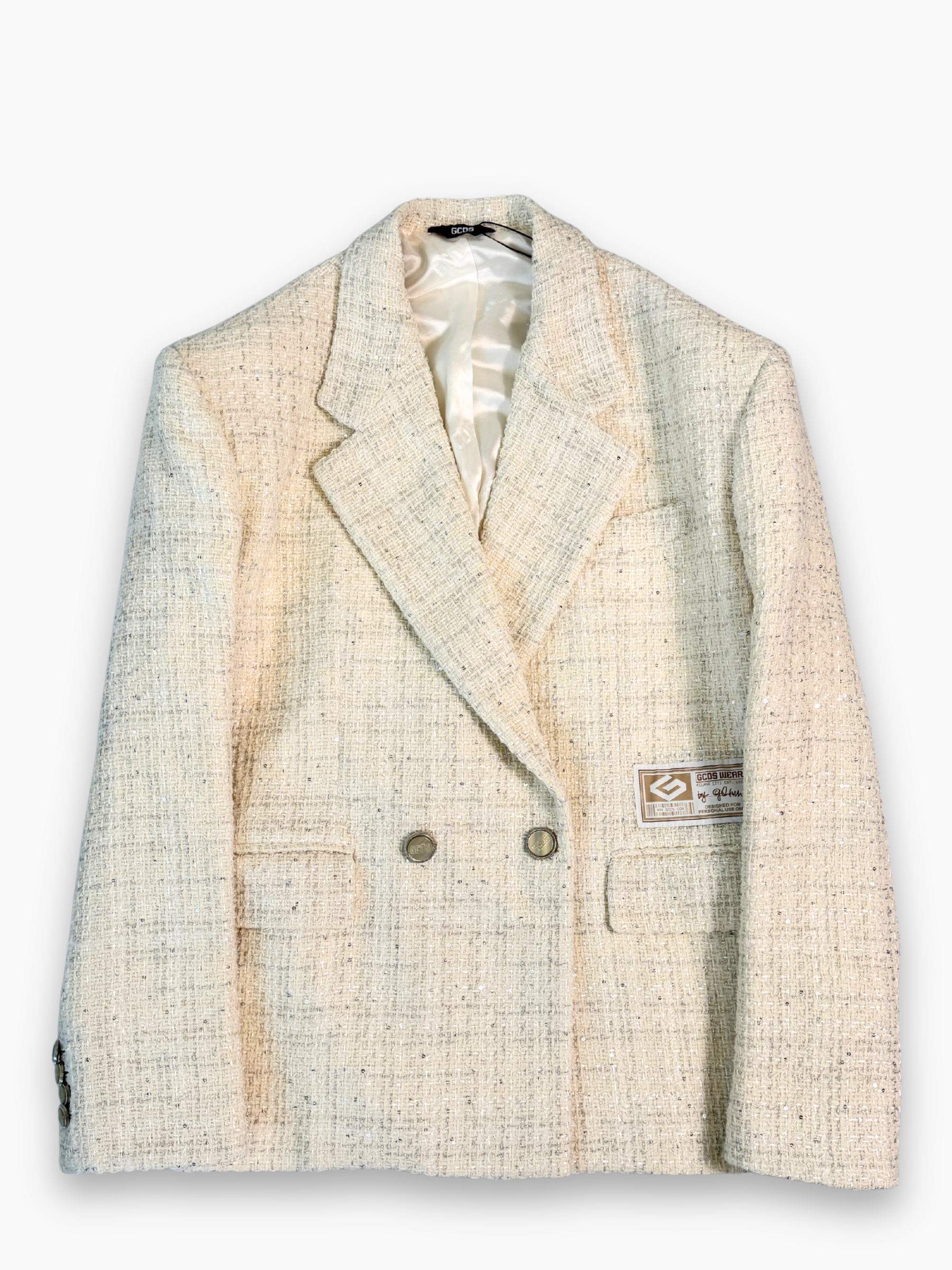 Blazer beige in tweed con trama luminosa e costruzione doppiopetto. Il taglio strutturato e il dettaglio del taschino applicato con label GCDS donano un tocco moderno a un capo d’ispirazione classica. I bottoni metallici completano il design conferendo un carattere elegante e distintivo.