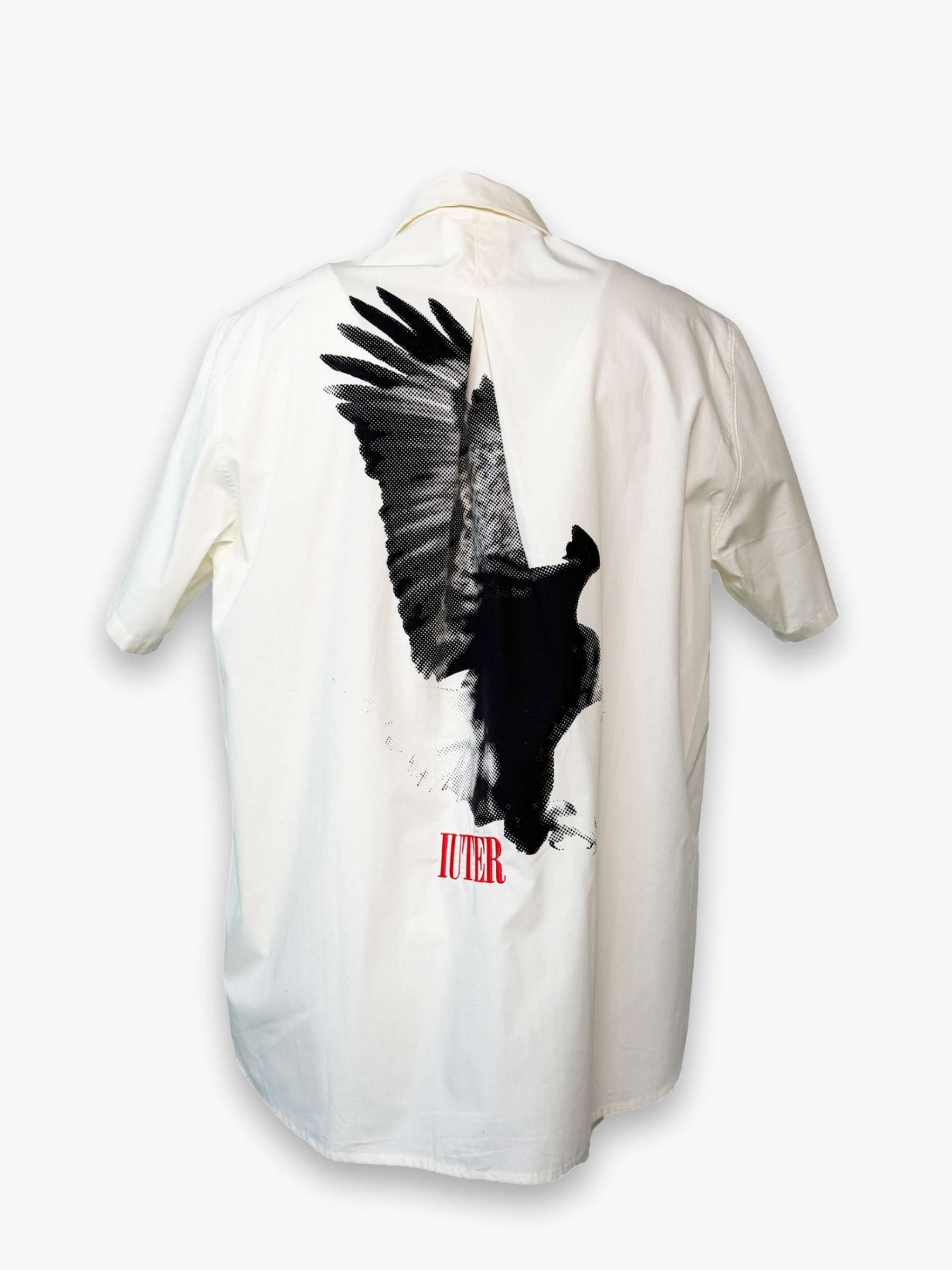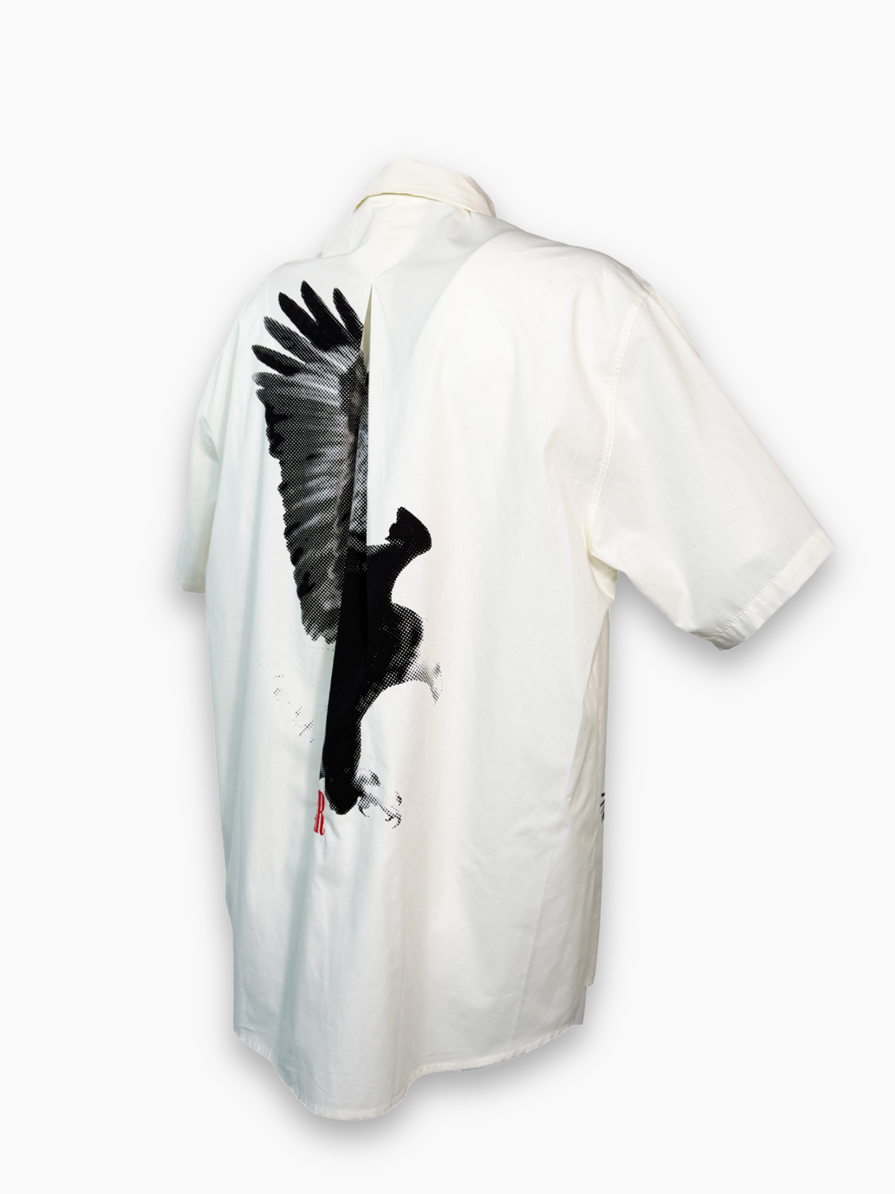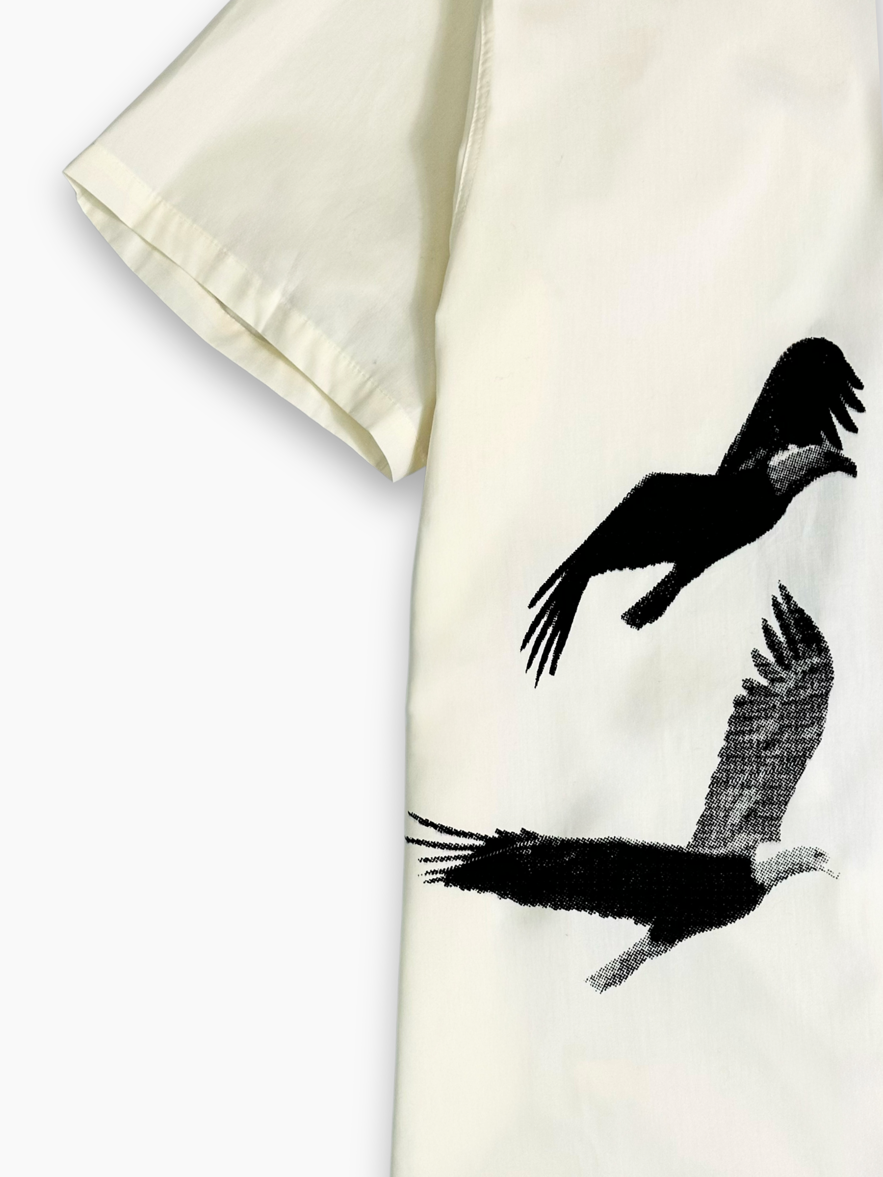 Camicia a maniche corte in tessuto ecru con stampa frontale di tre aquile in volo, realizzata con effetto pixellato che dona un’estetica artistica e contemporanea. Il fit è morbido e leggero, con colletto bowling e chiusura a bottoni nascosta che rende il design pulito ed essenziale. Ideale per look estivi ricercati con un tocco grafico distintivo.