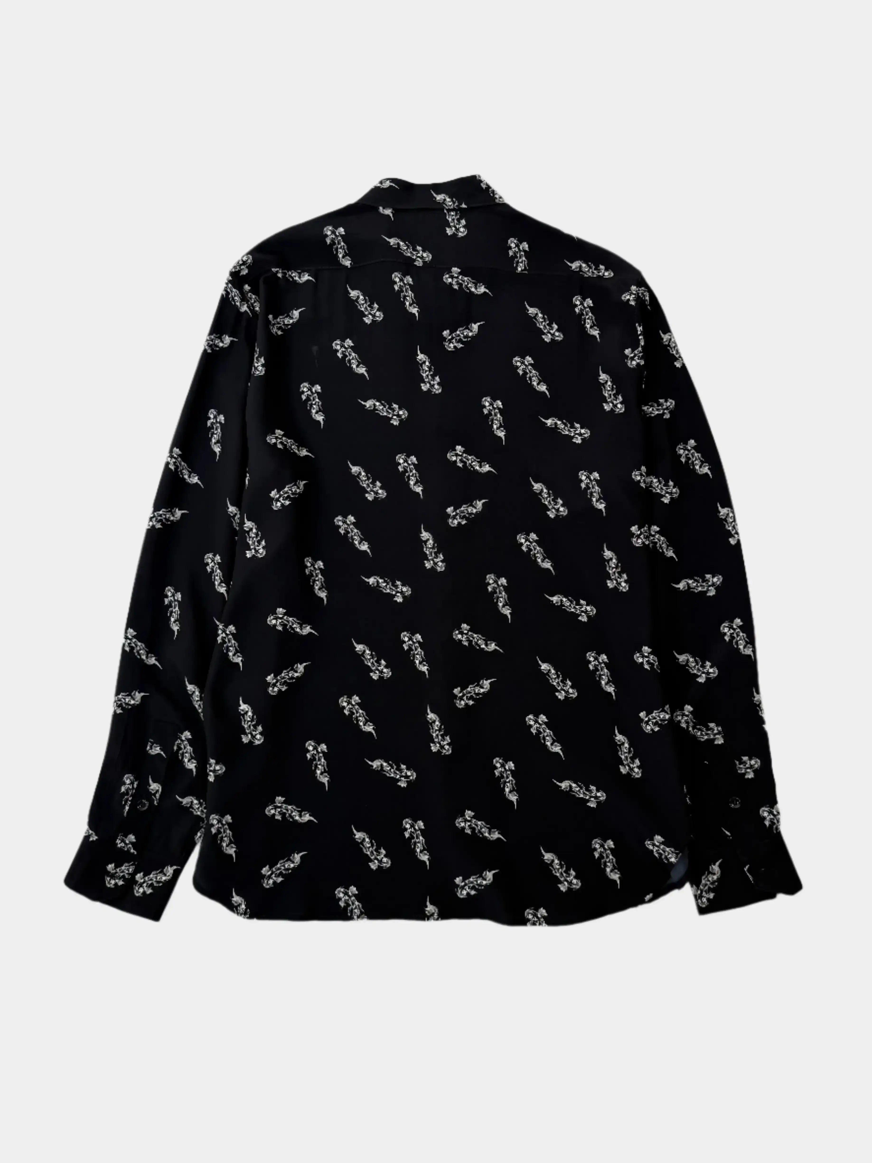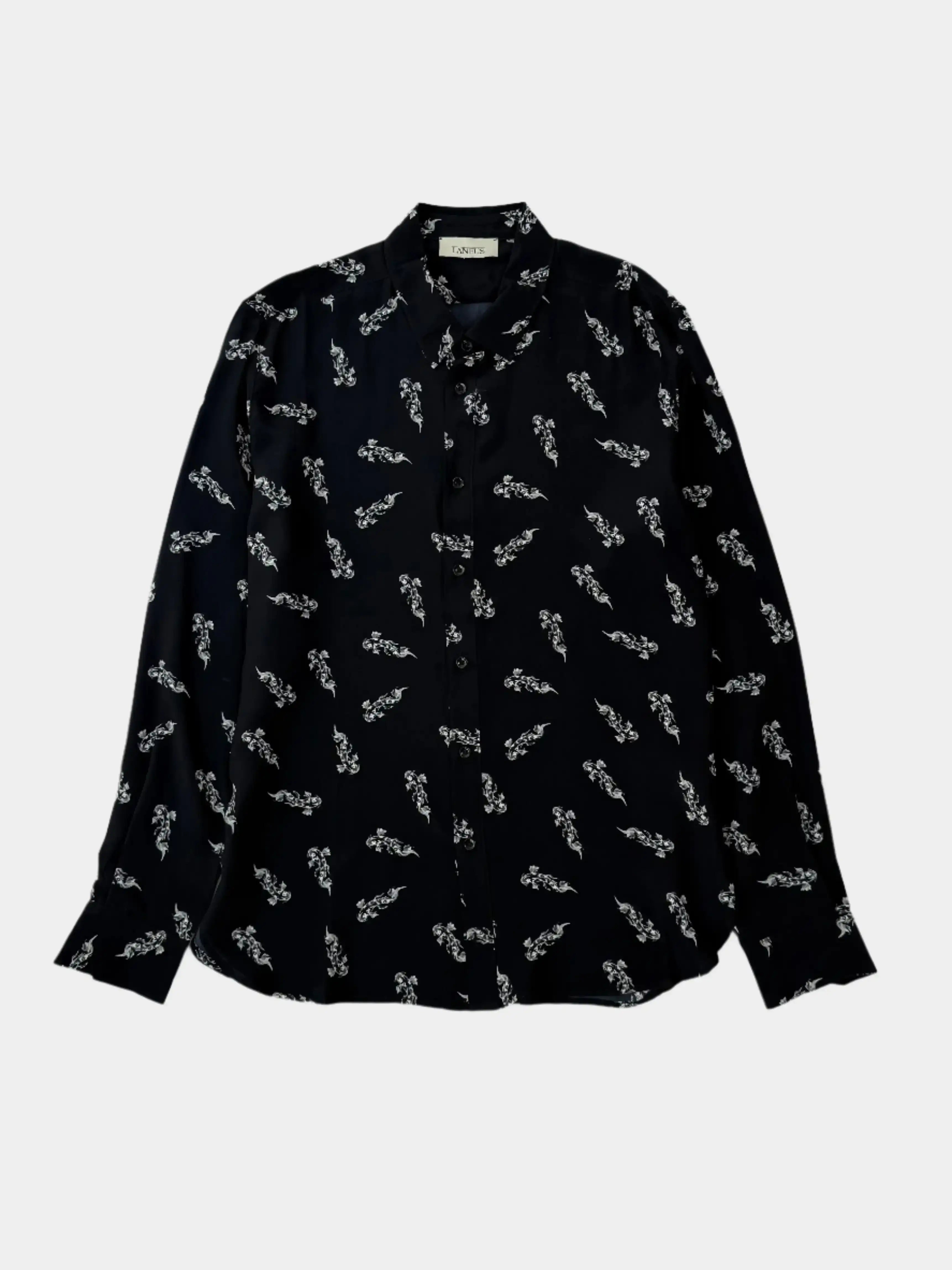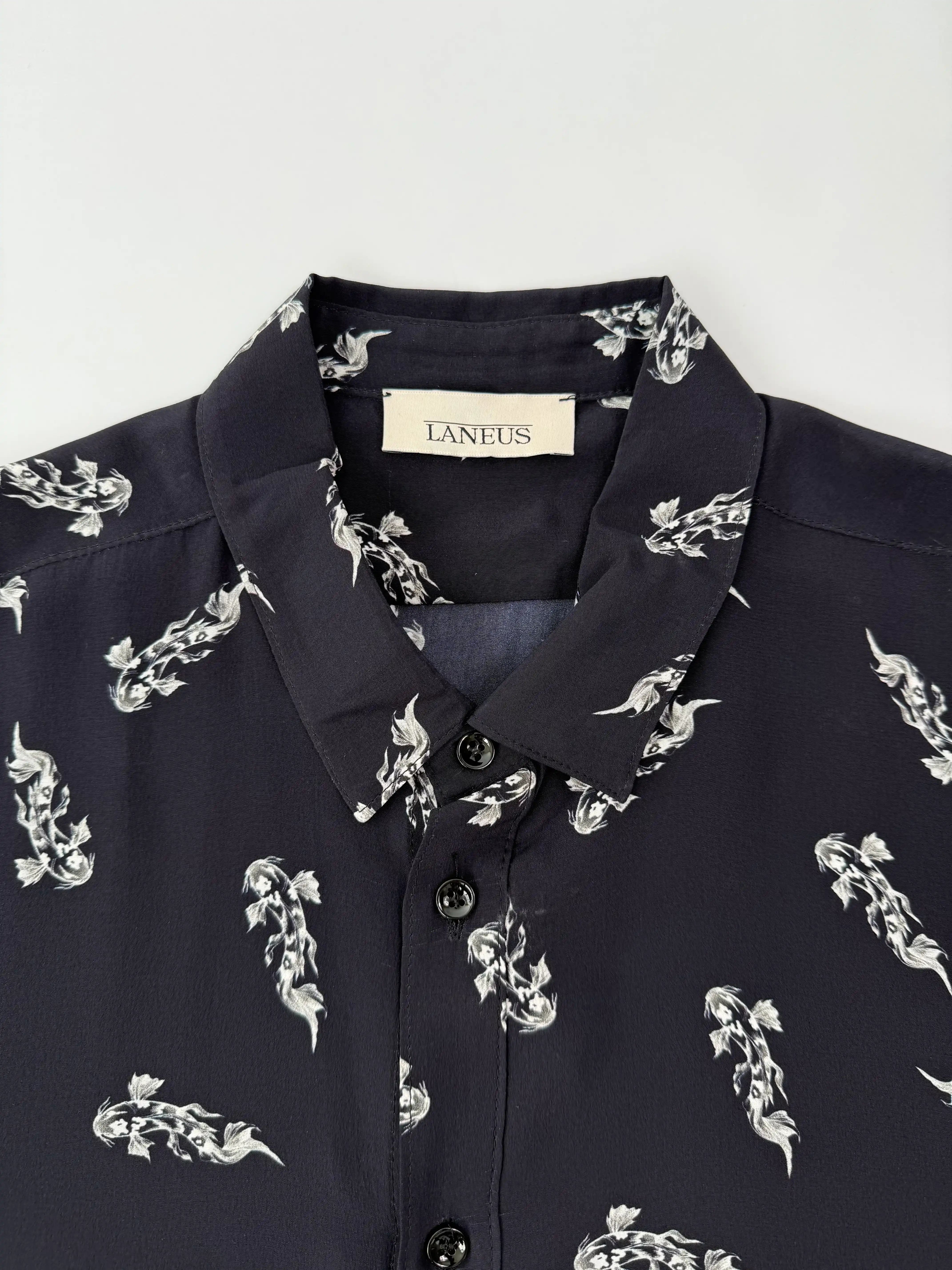 Questa camicia Laneus in pura seta nera è decorata da una suggestiva stampa di piccoli pesci bianchi, creando un contrasto elegante e originale. Leggera e fluida al tatto, è pensata per chi cerca uno stile sofisticato con un tocco distintivo, perfetta per occasioni sia informali che più ricercate.