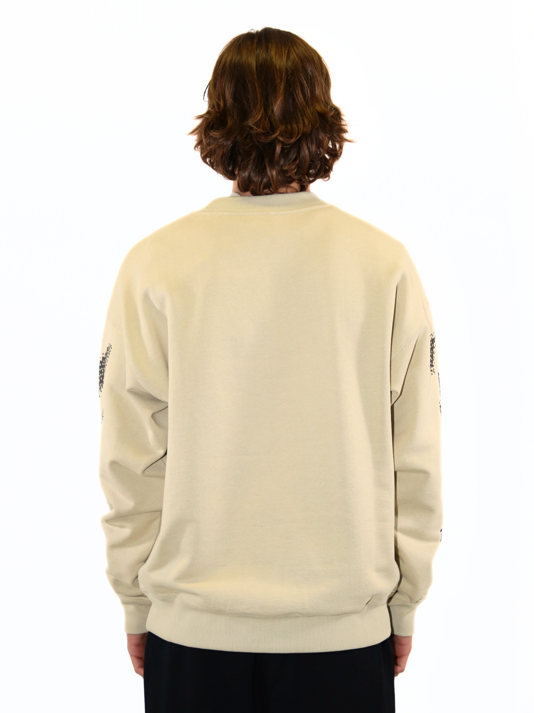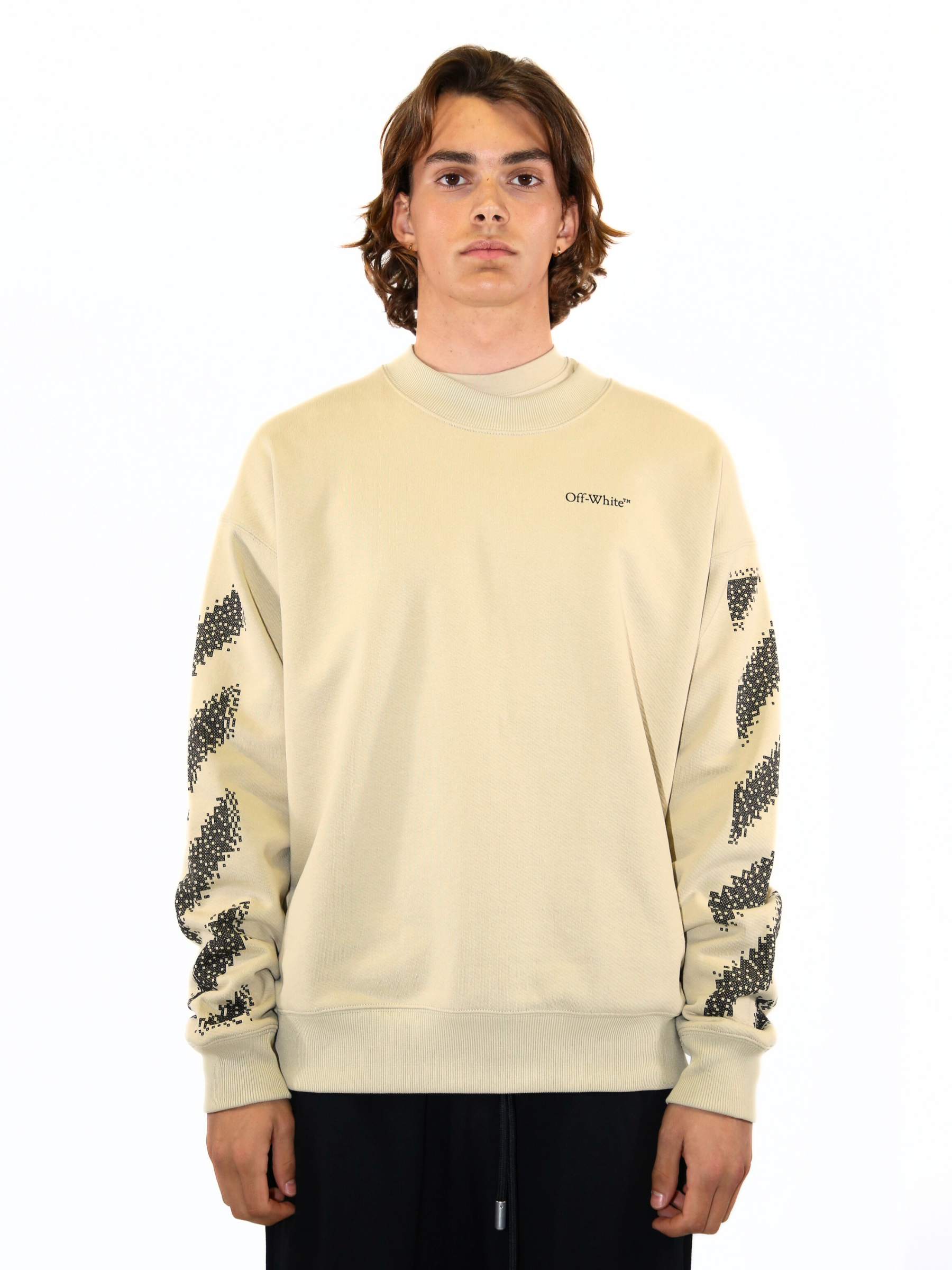 Felpa beige firmata Off-White, realizzata in morbido cotone premium. Il modello presenta girocollo, logo “OFF-WHITE™” stampato sul petto e iconiche bande diagonali nere sulle maniche. Un capo casual e contemporaneo, ideale per aggiungere un tocco streetwear raffinato ai tuoi outfit quotidiani.