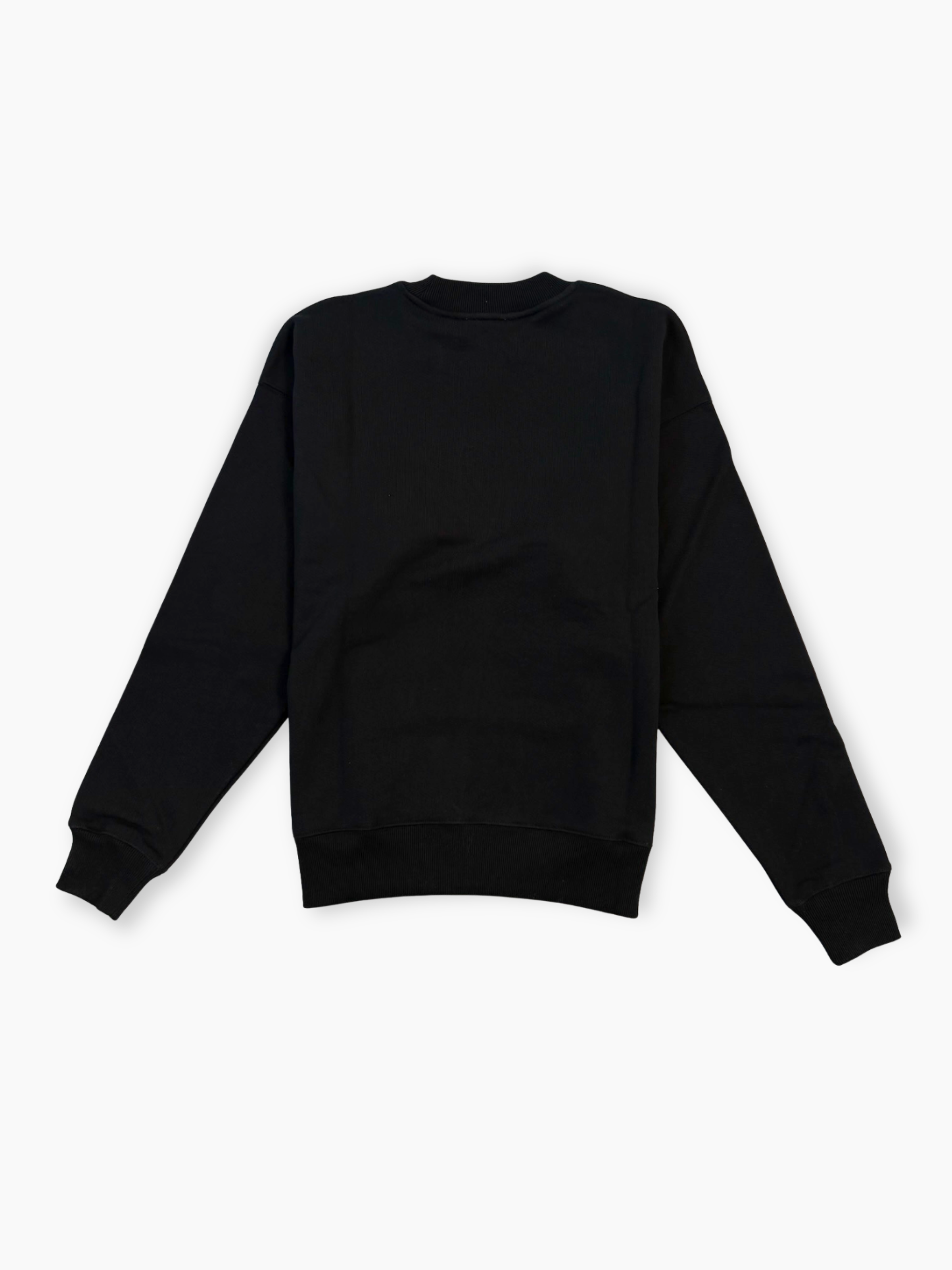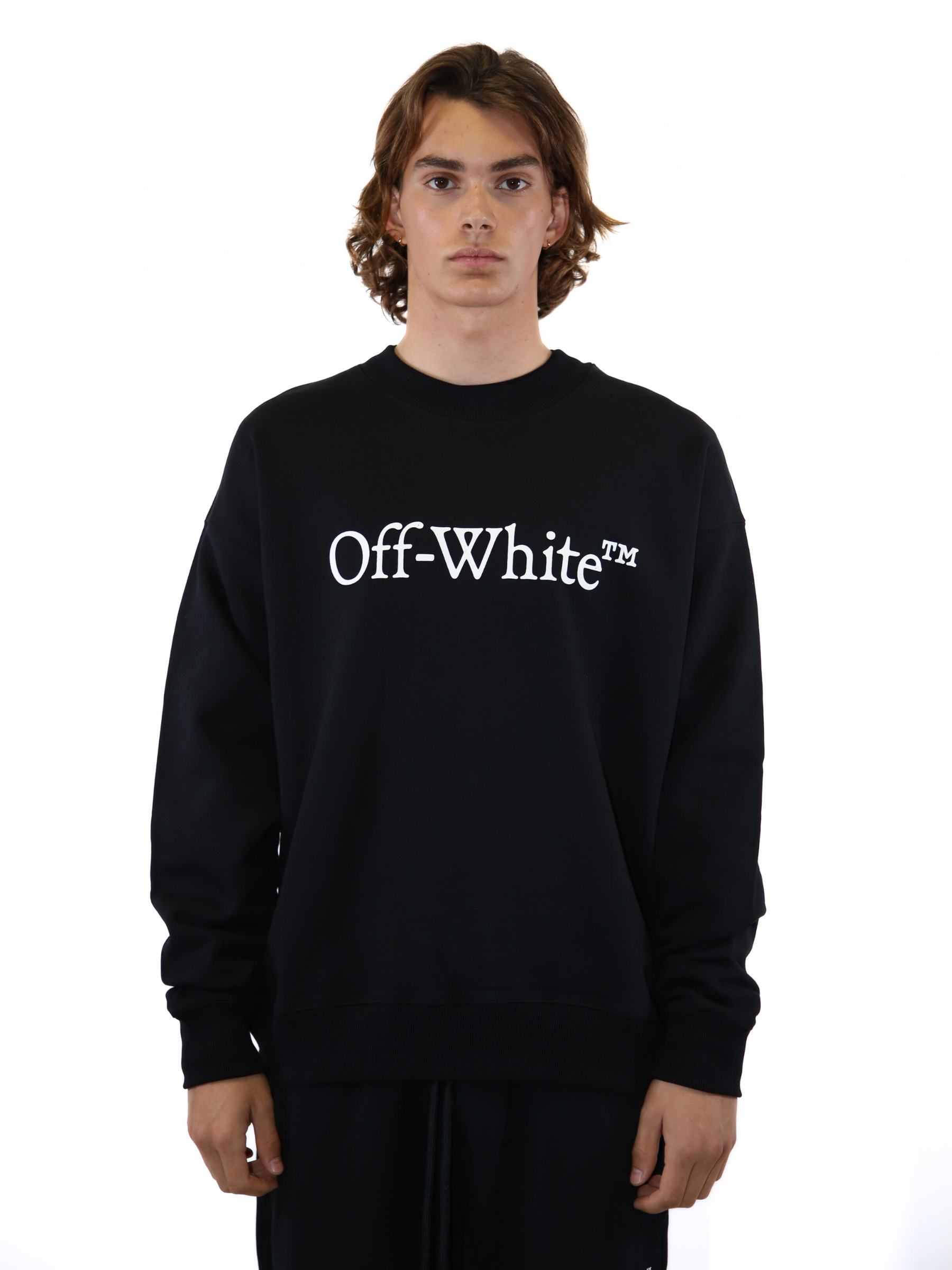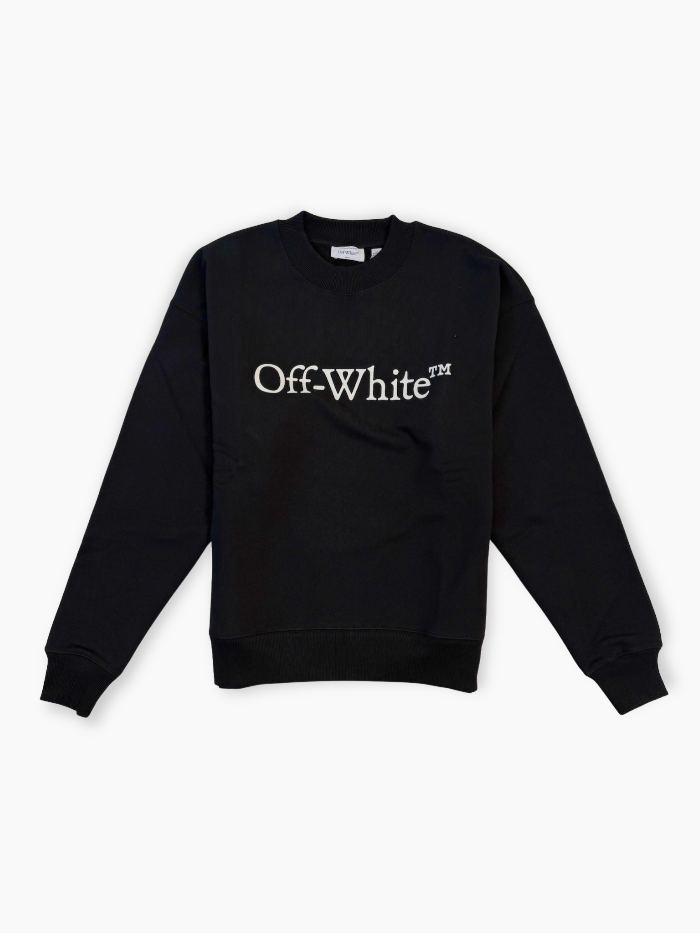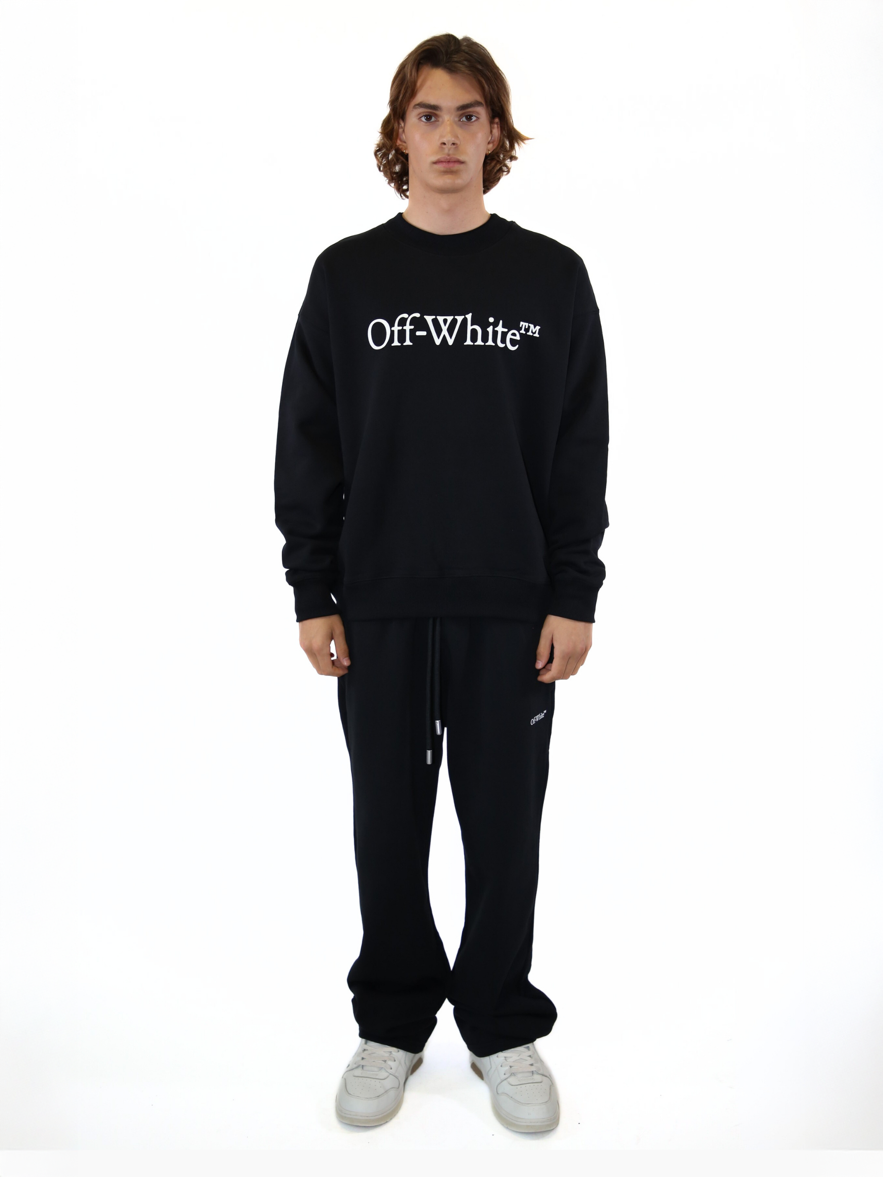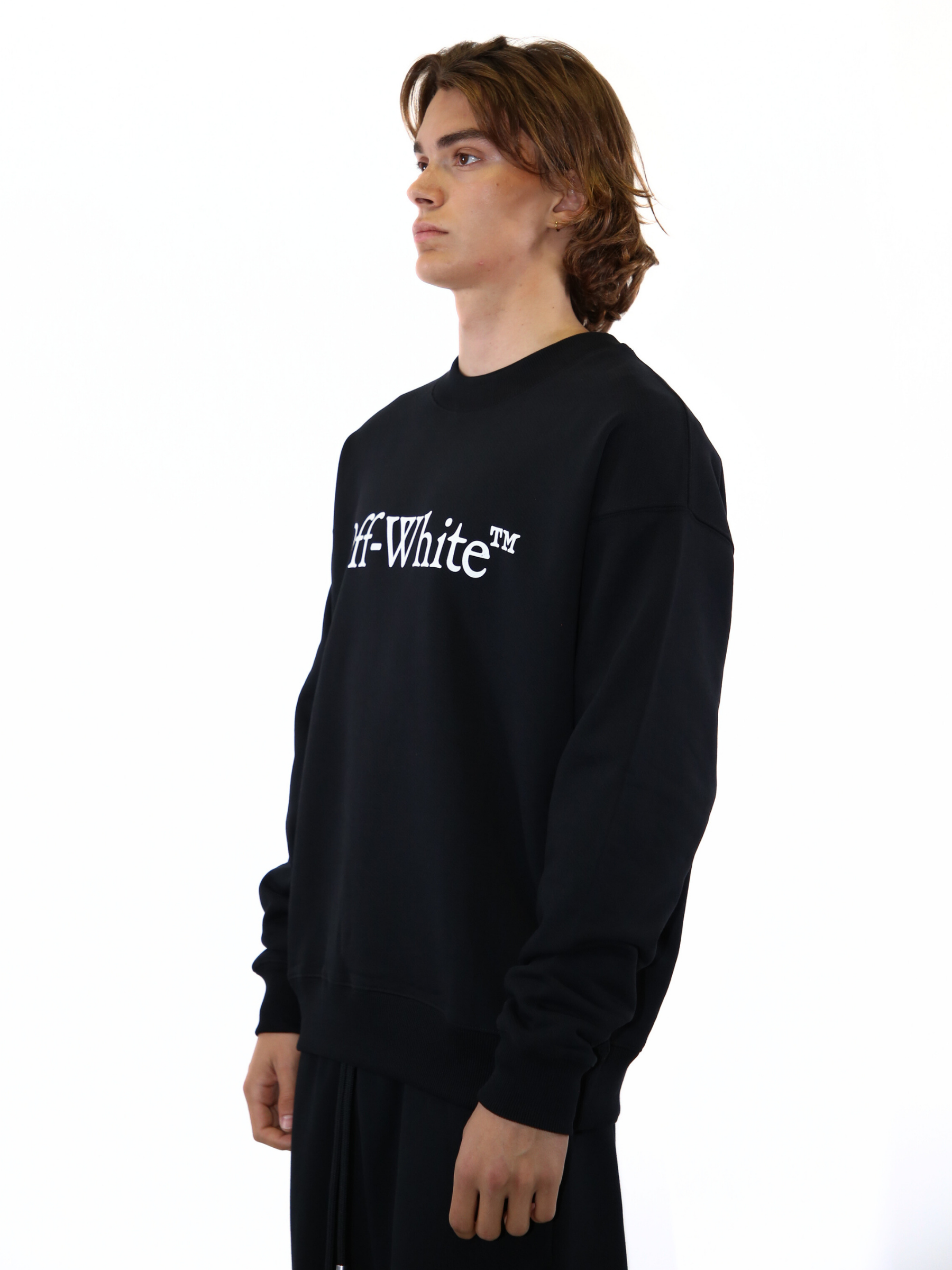 Felpa nera firmata Off-White, realizzata in morbido cotone. Il modello presenta una linea regolare con collo tondo, polsini e fondo a costine, e stampa del logo “Off-White™” in bianco sul petto. Un capo essenziale ma dallo stile distintivo, ideale per aggiungere un tocco contemporaneo ai look casual.