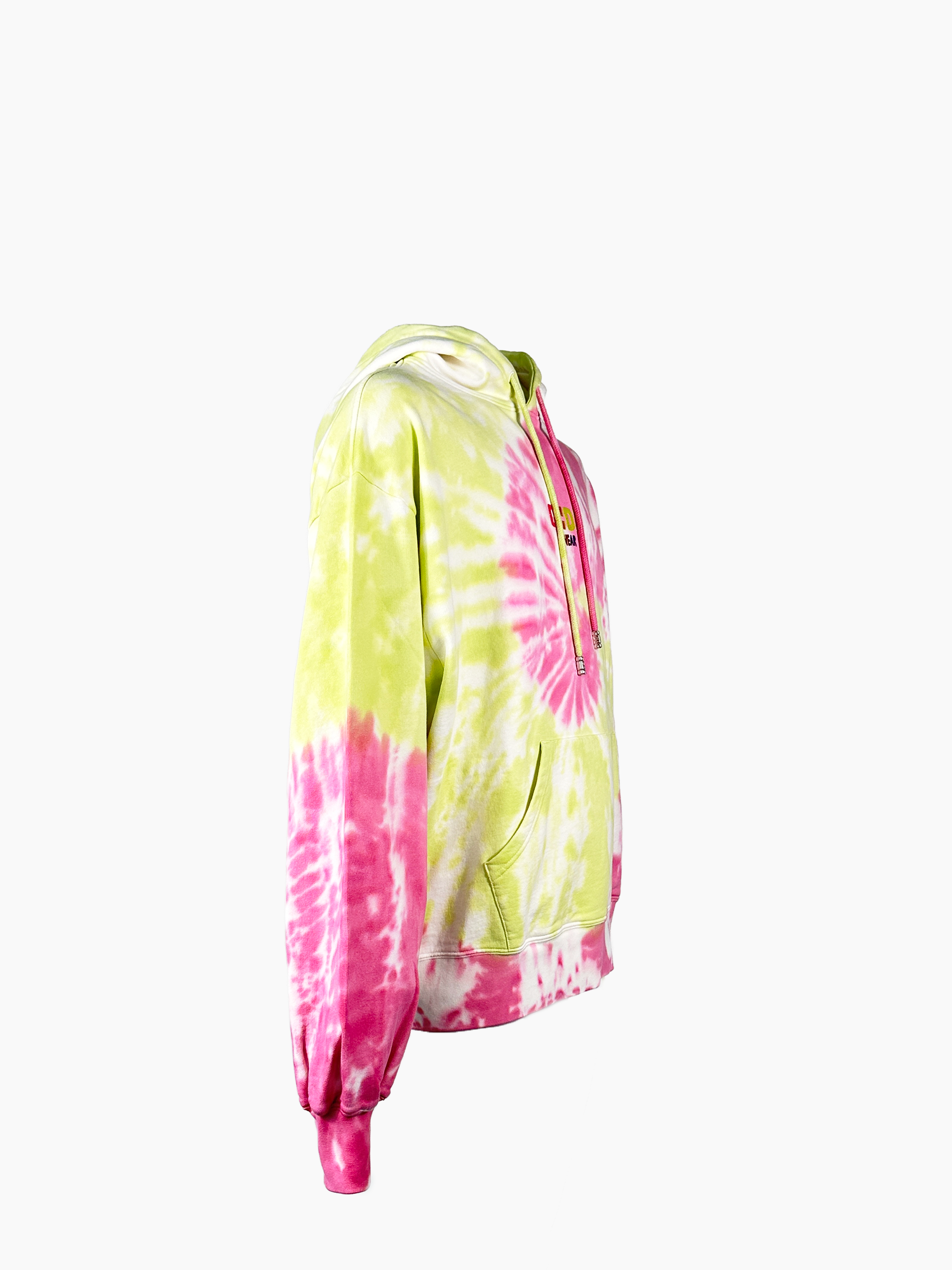 Felpa tie dye con cappuccio dal carattere vivace e street, caratterizzata da un'esplosione di rosa e giallo pastello che rende ogni capo unico. Il logo GCDS ricamato sul petto aggiunge un dettaglio brillante e distintivo, mentre il fit morbido assicura il massimo comfort. Un modello perfetto per look casual e outfit a forte identità visiva.