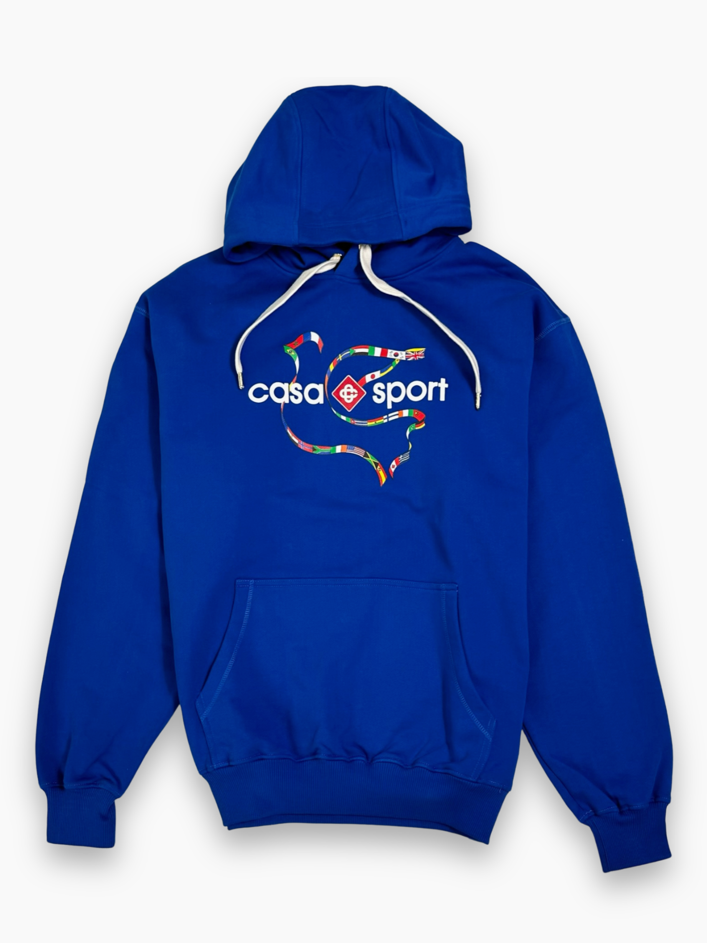 Felpa con cappuccio in cotone loopback di colore blu intenso, caratterizzata dal logo Casablanca Sport sul petto con grafica multibandiera. Un modello iconico, confortevole e d’impatto, ideale per aggiungere un tocco sportivo e distintivo al tuo look quotidiano.