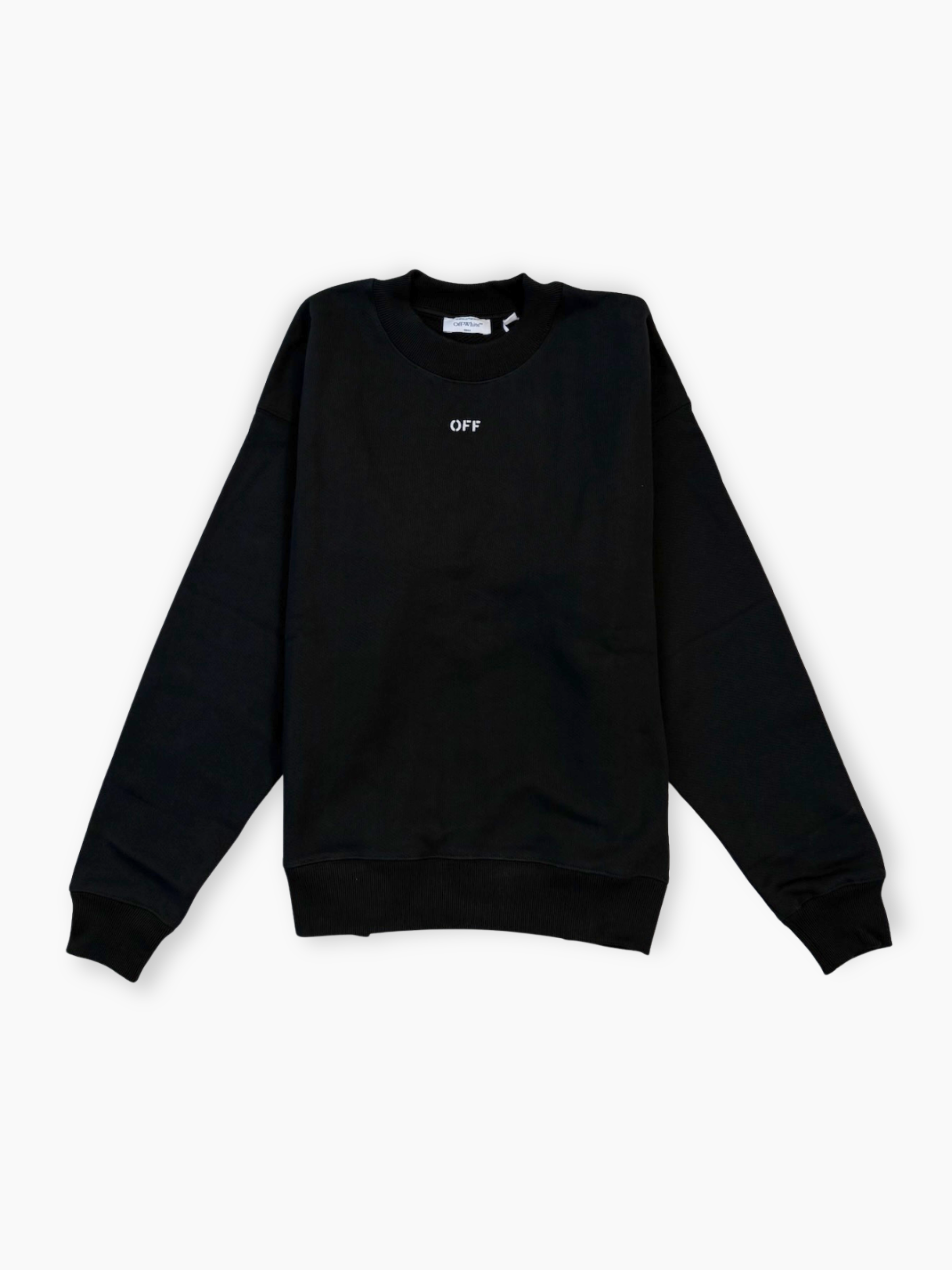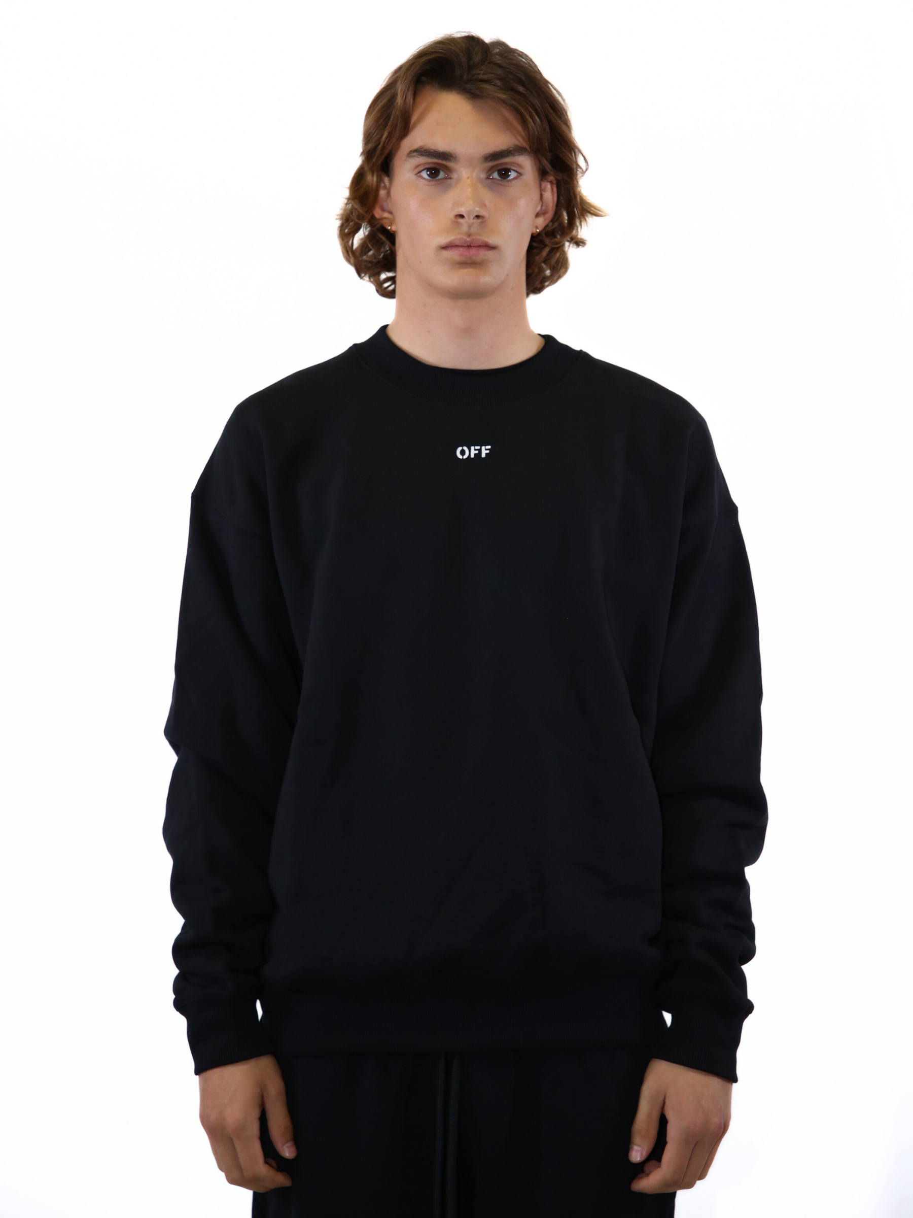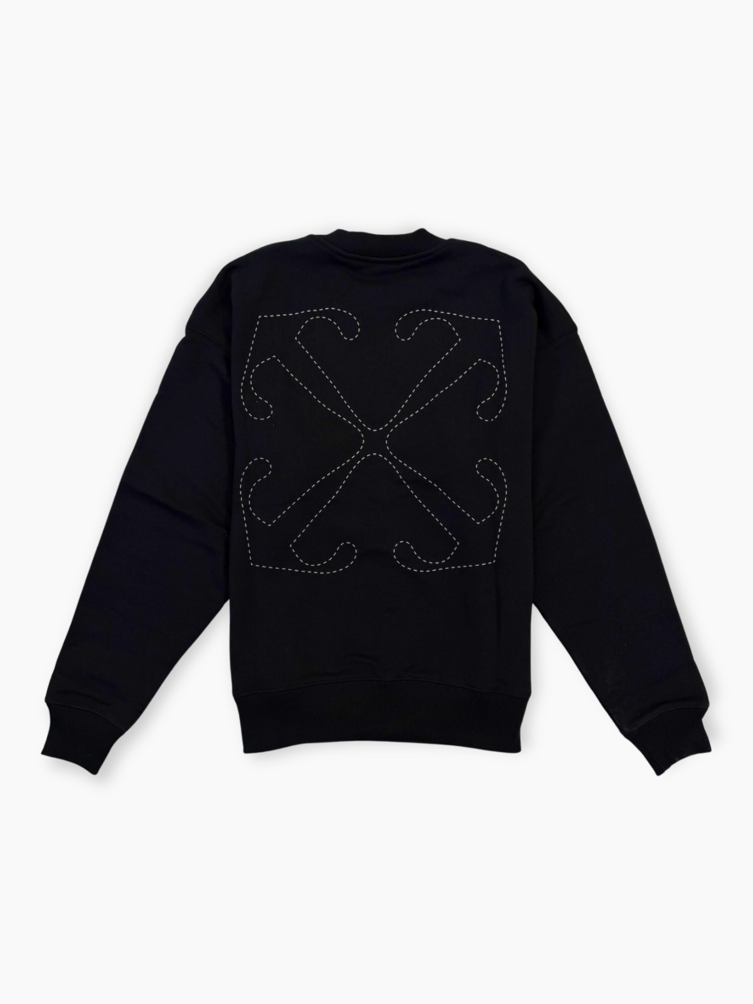 Felpa nera a girocollo firmata Off-White, realizzata in cotone di alta qualità. Il modello presenta piccola stampa “OFF” sul petto e maxi motivo Arrow ricamato sul retro. Un capo iconico del brand, dal design essenziale e dallo stile contemporaneo, perfetto per look street e casual.