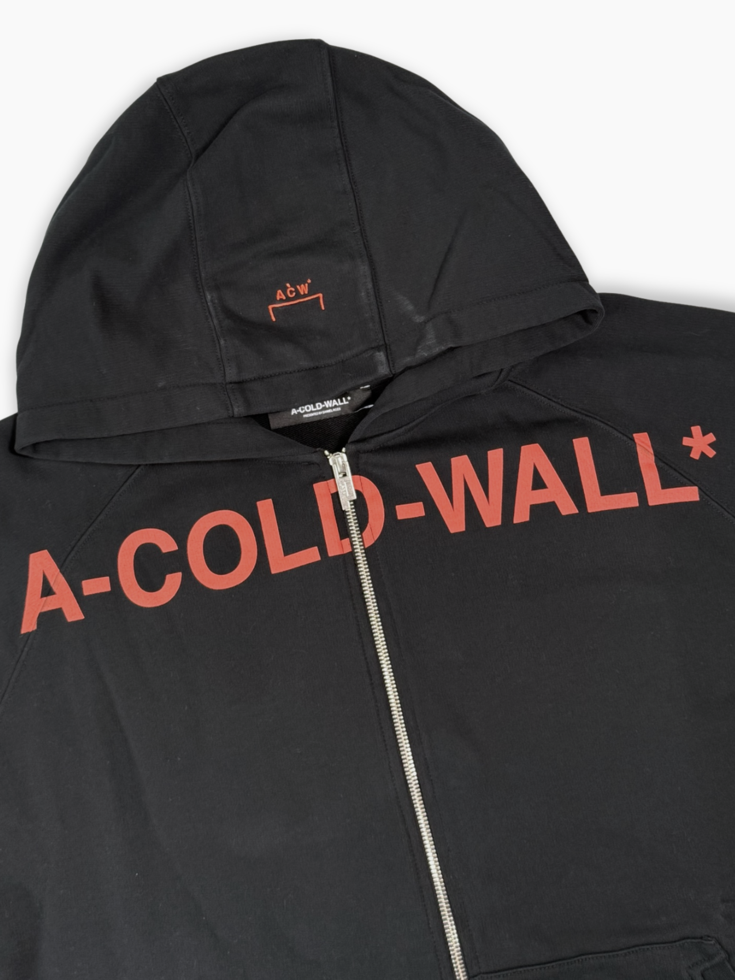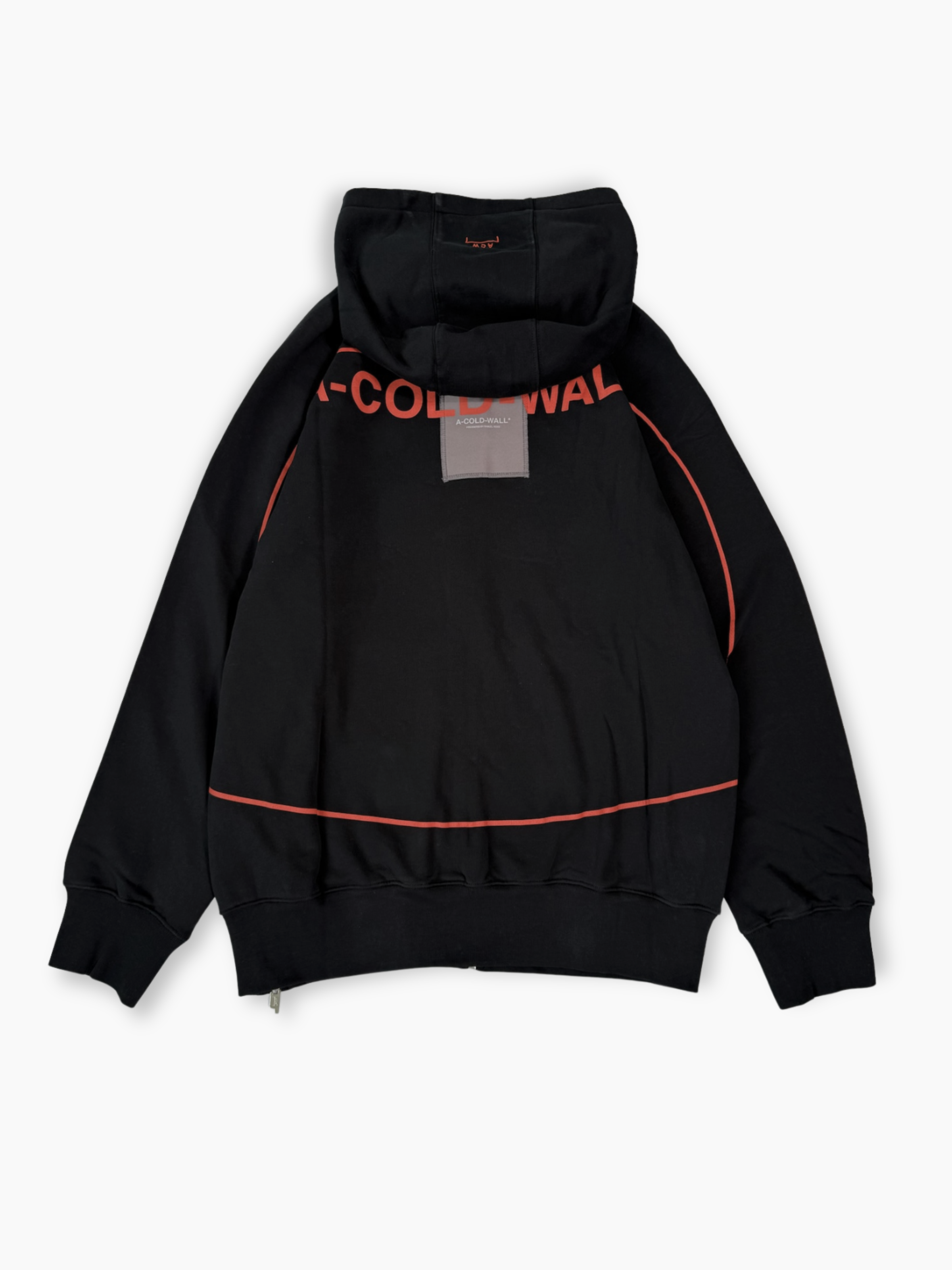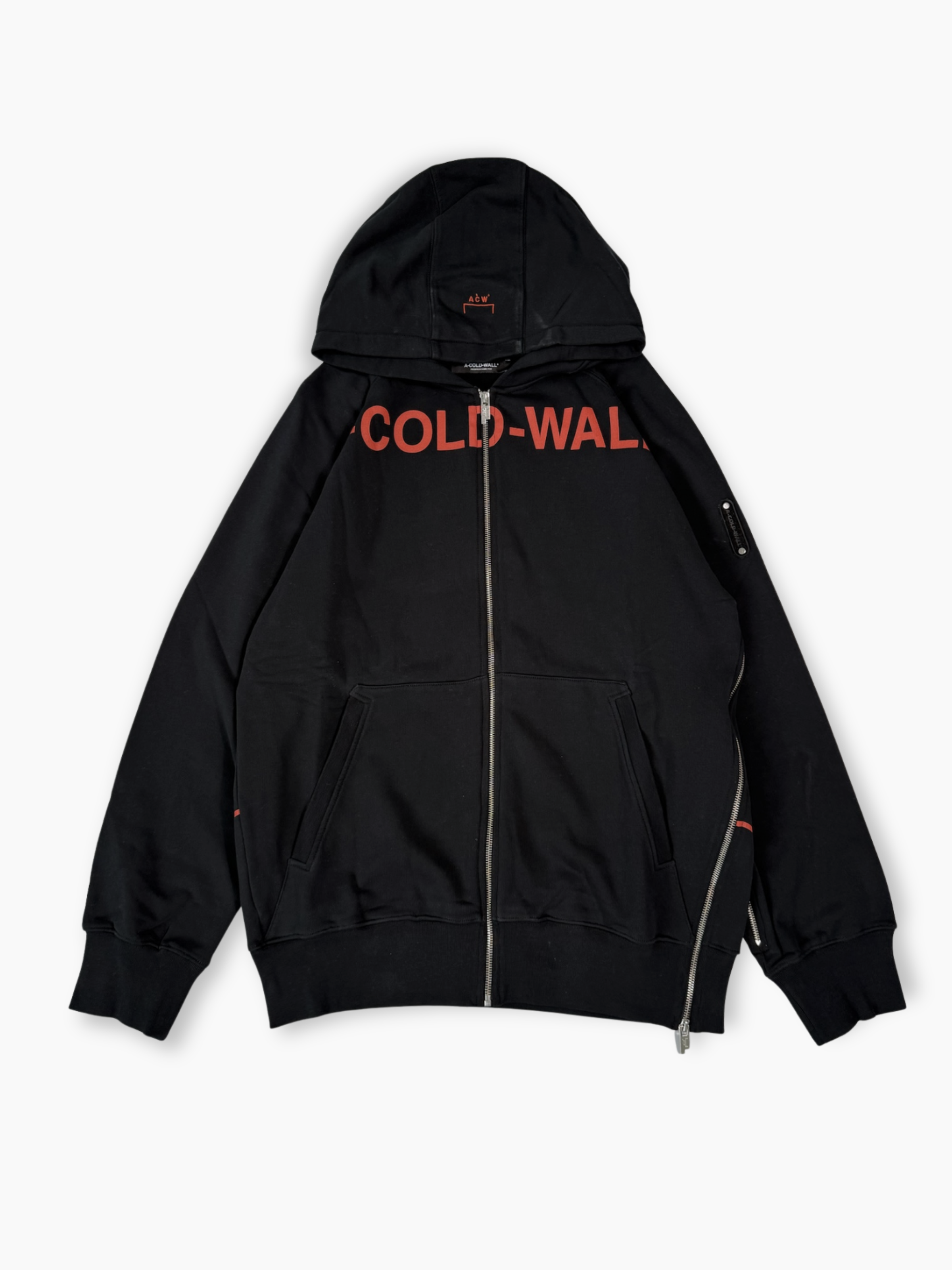 Felpa nera in cotone con cappuccio e zip frontale a tutta lunghezza. Il logo COLD-WALL in rosso acceso stampato sul petto aggiunge un tocco bold e distintivo, mentre la zip laterale dona un dettaglio urban e funzionale.