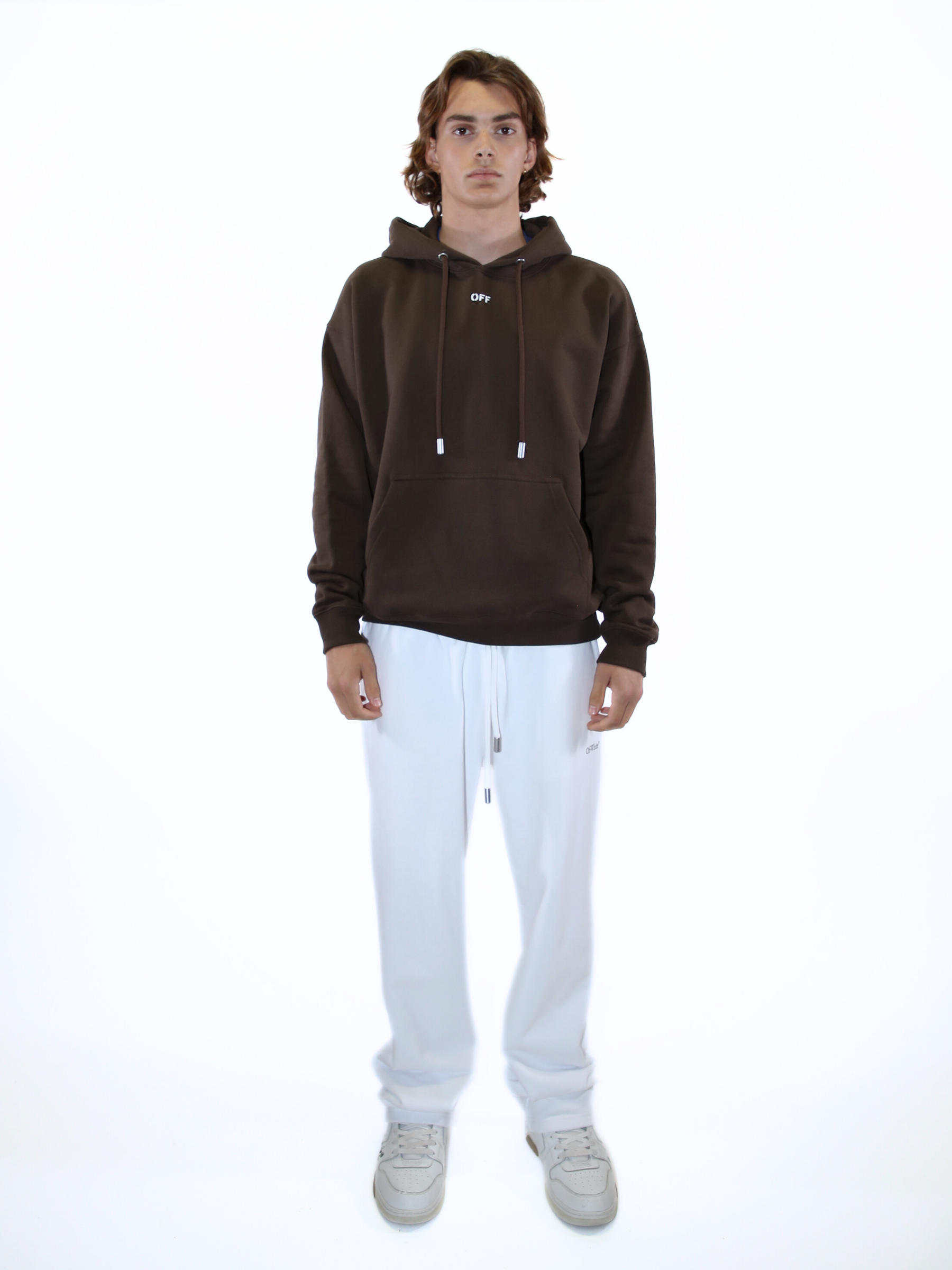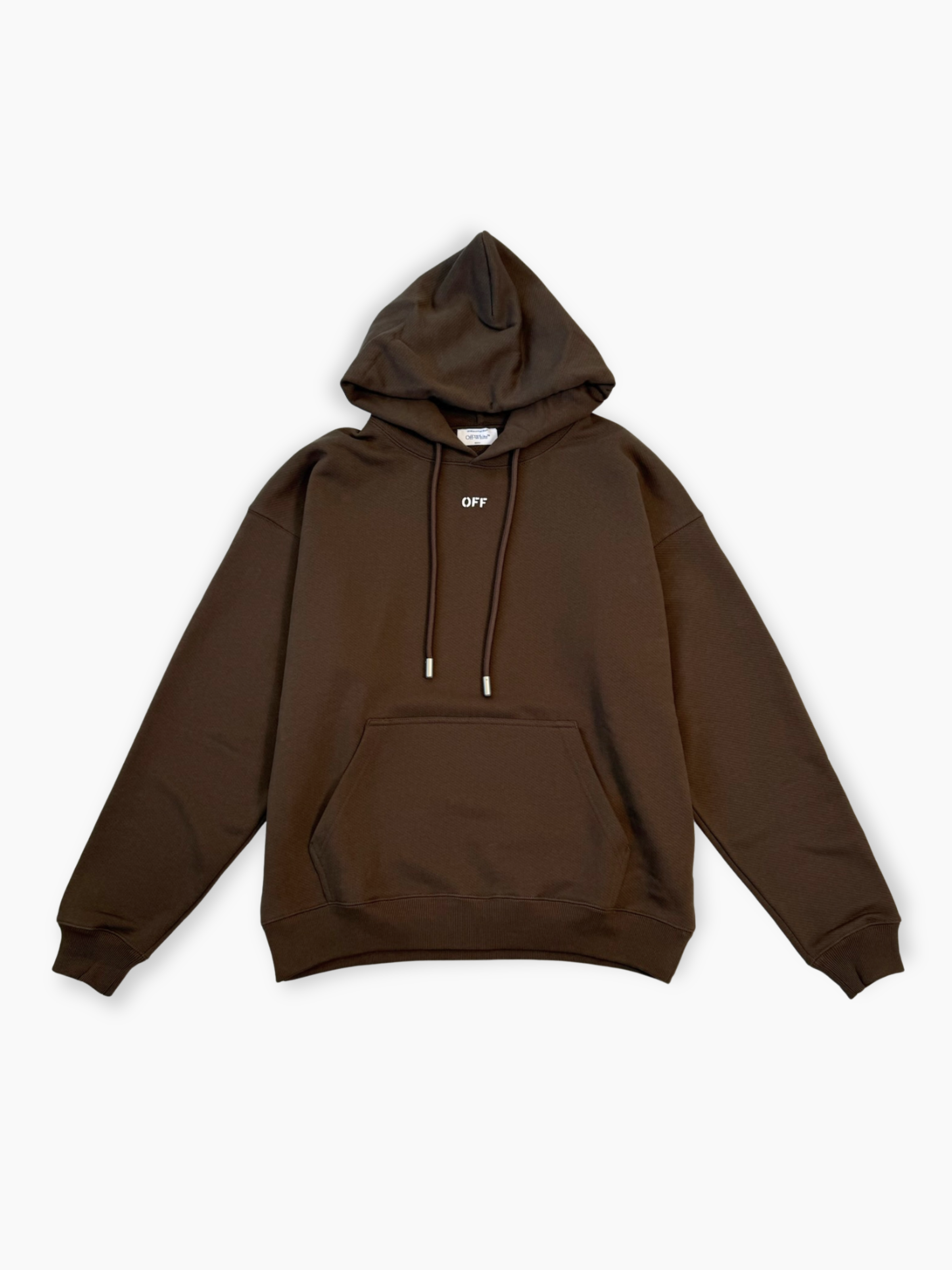 Felpa marrone Off-White realizzata in morbido cotone. Il modello presenta cappuccio regolabile con coulisse, tasca frontale a marsupio e piccolo logo “OFF” bianco stampato sul petto. Un capo essenziale e contemporaneo, perfetto per look casual dallo stile raffinato e minimal.