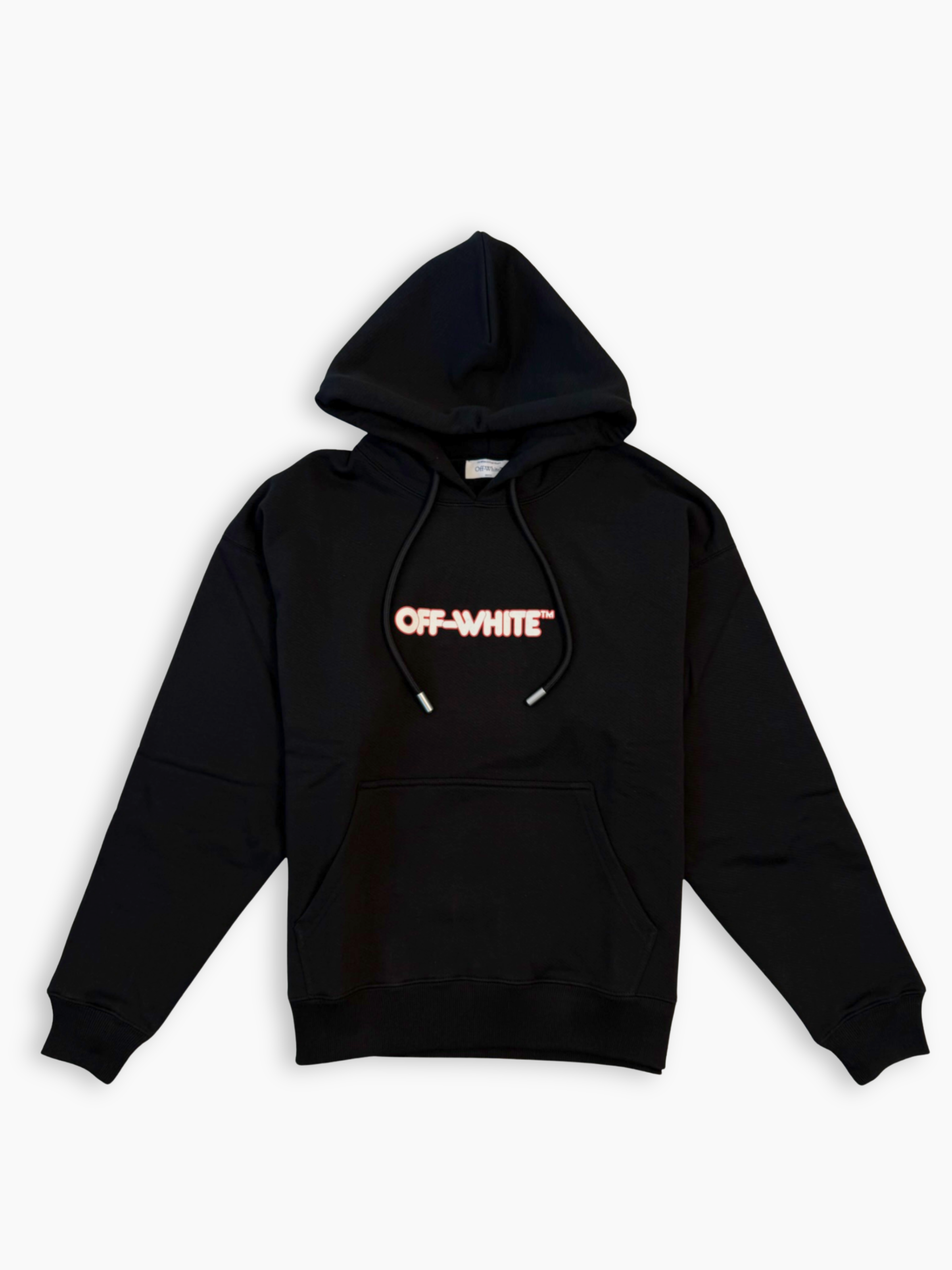 Felpa nera con cappuccio firmata Off-White, realizzata in morbido cotone. Il modello presenta cappuccio regolabile con coulisse, tasca a marsupio frontale e logo “Off-White™” stampato in rosa a contrasto sul petto. Sul retro è presente una piccola stampa logo tono su tono. Un capo iconico che unisce comfort e stile urbano.
