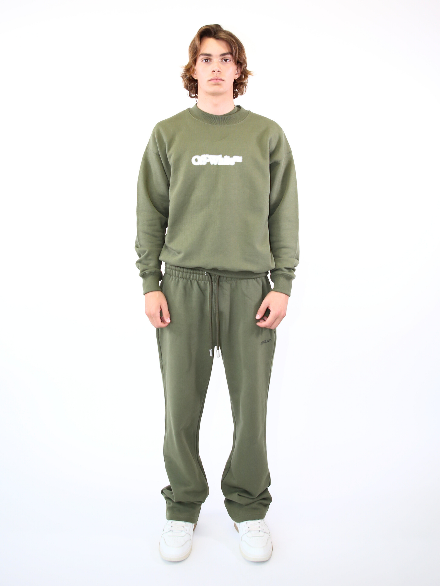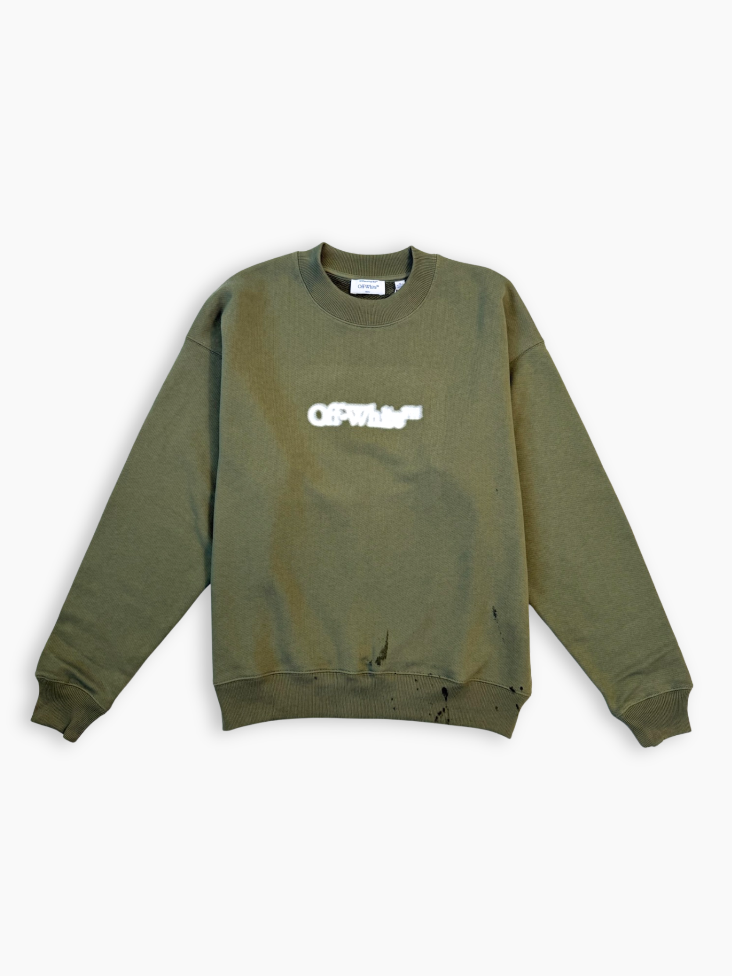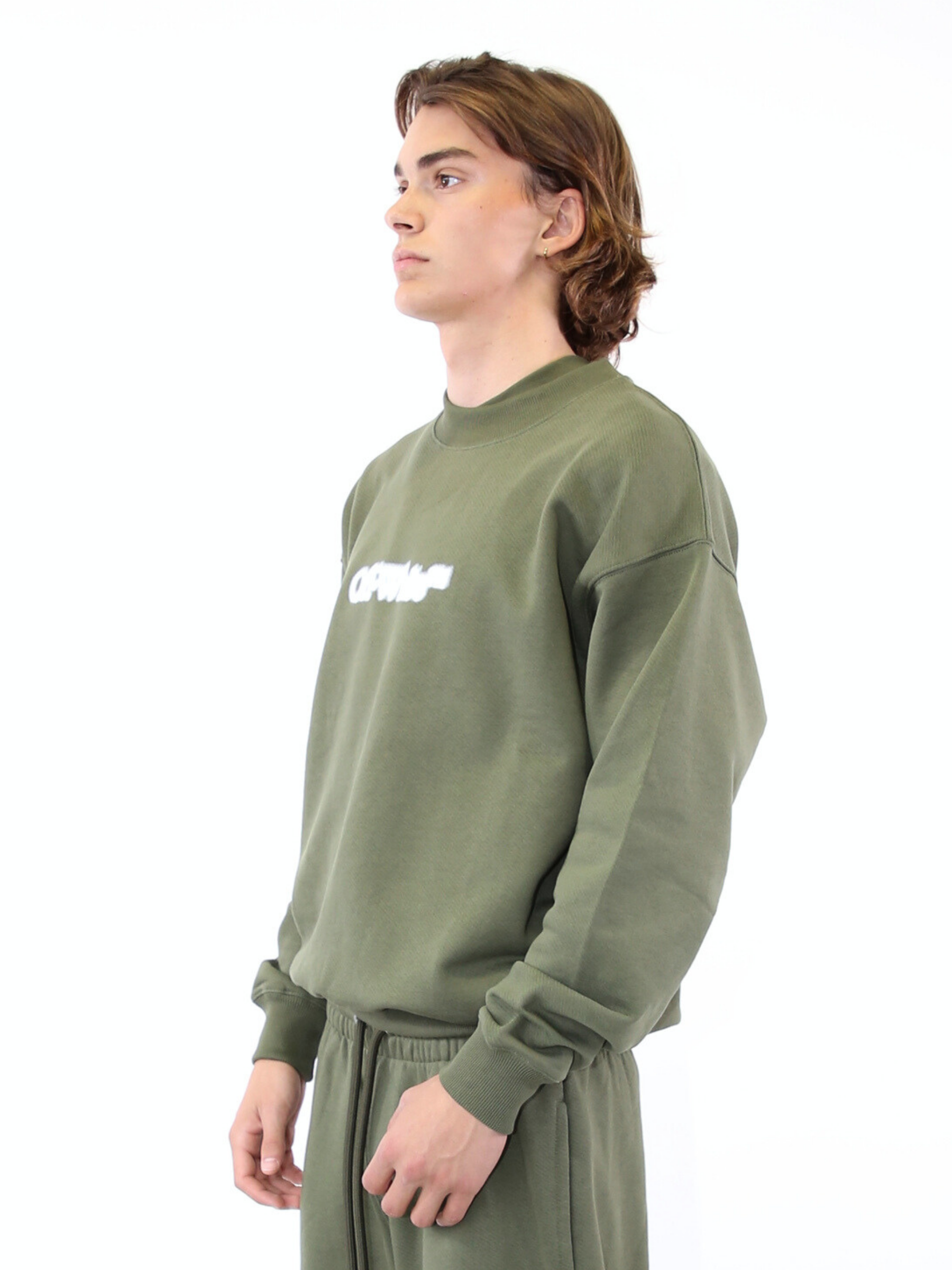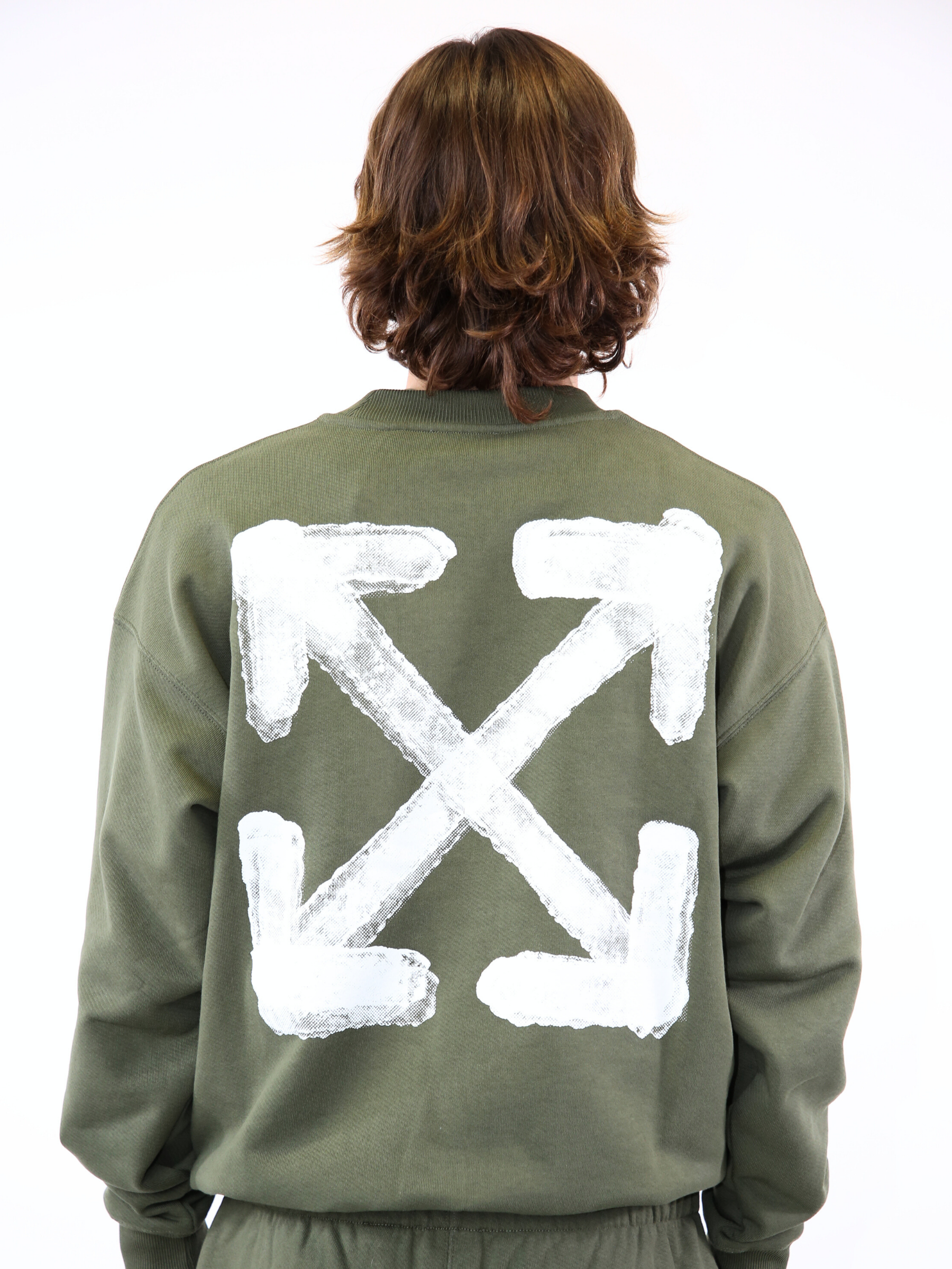 Felpa verde militare firmata Off-White, realizzata in morbido cotone. Il modello presenta logo “OFF-WHITE™” stampato sul petto e iconica grafica Arrow bianca effetto consumato sul retro. Un capo dallo stile urbano e distintivo, ideale per look casual dal carattere deciso.