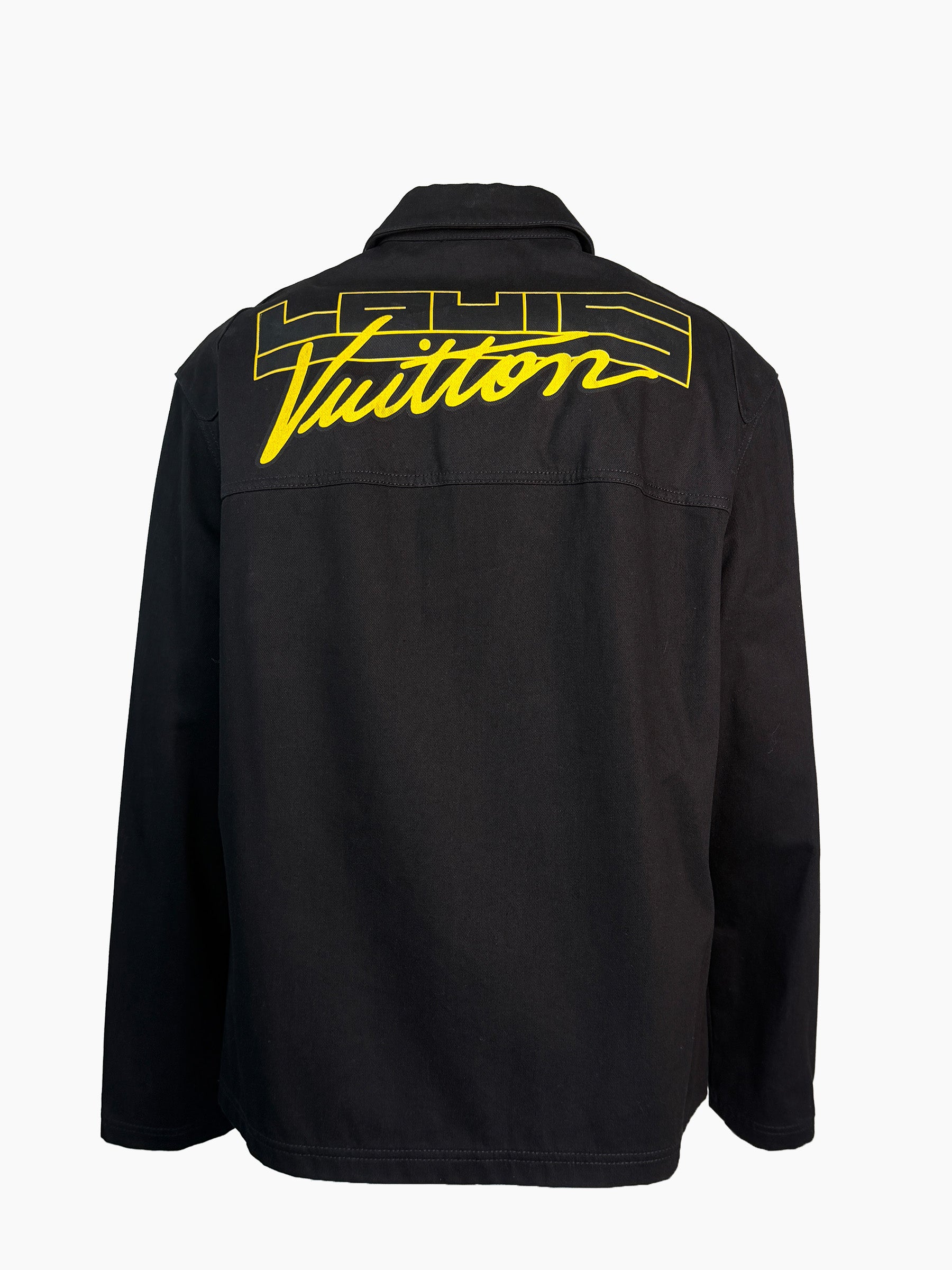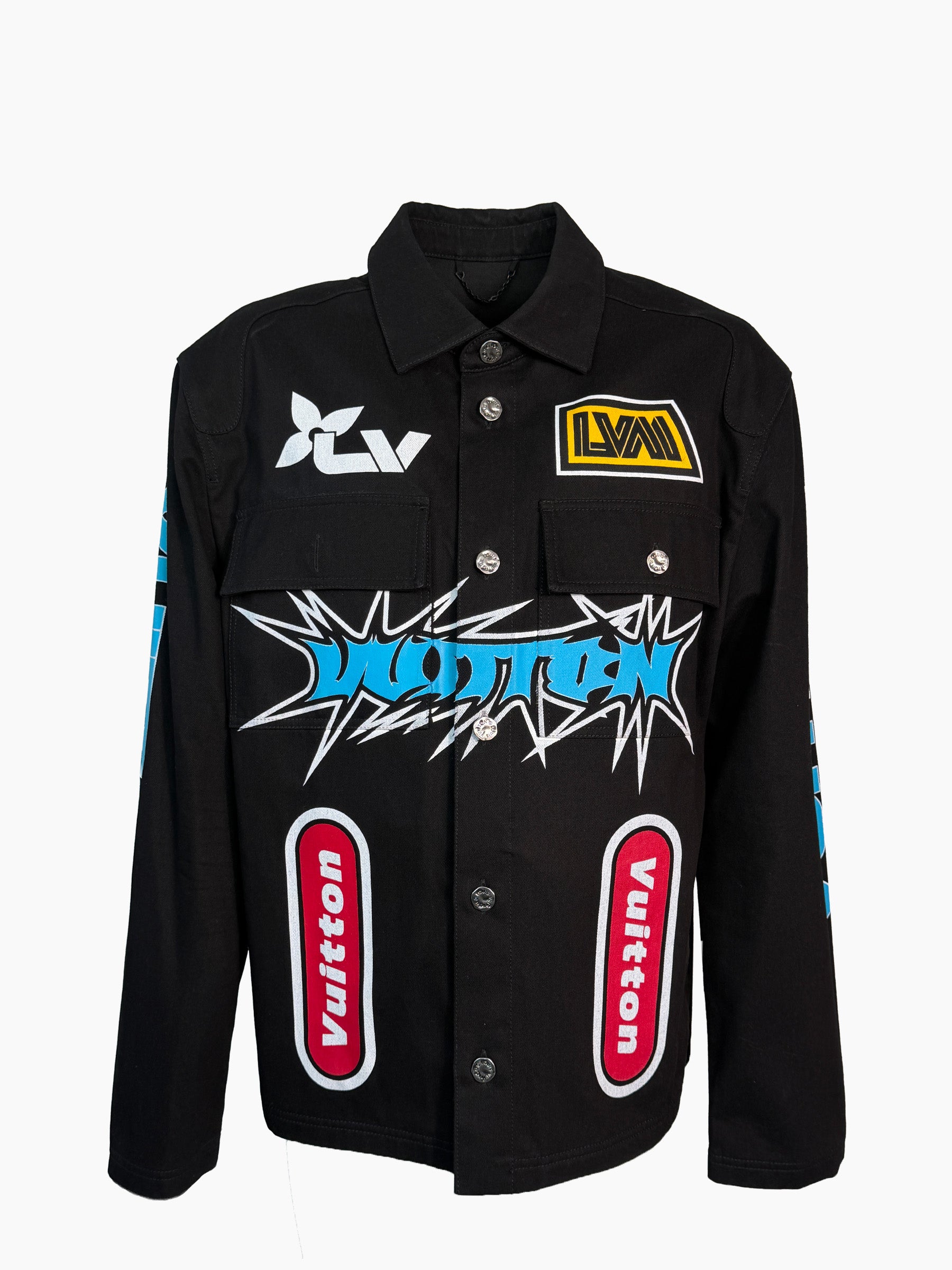 Giacca nera in cotone con patch multicolor in stile motorsport, tipiche delle collezioni creative Louis Vuitton. Il modello presenta tasche frontali con patta, chiusura a bottoni e un design grintoso grazie alle applicazioni grafiche su petto, maniche e parte inferiore. Un capo statement dal carattere urbano, perfetto per look streetwear premium.