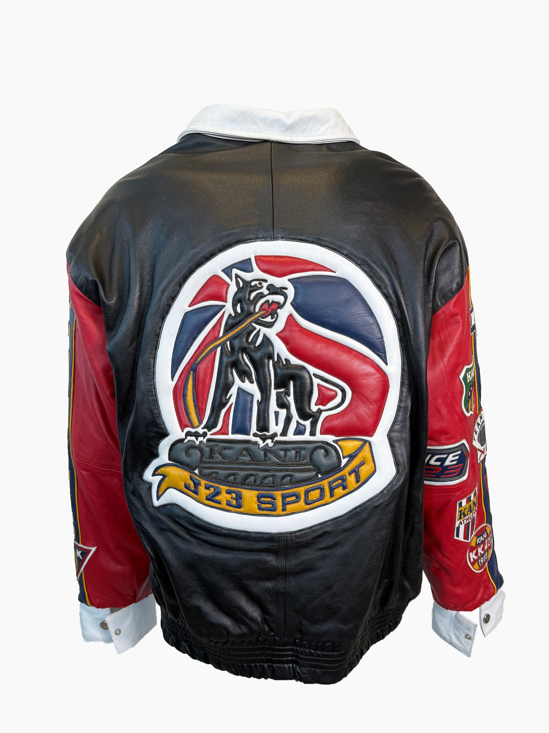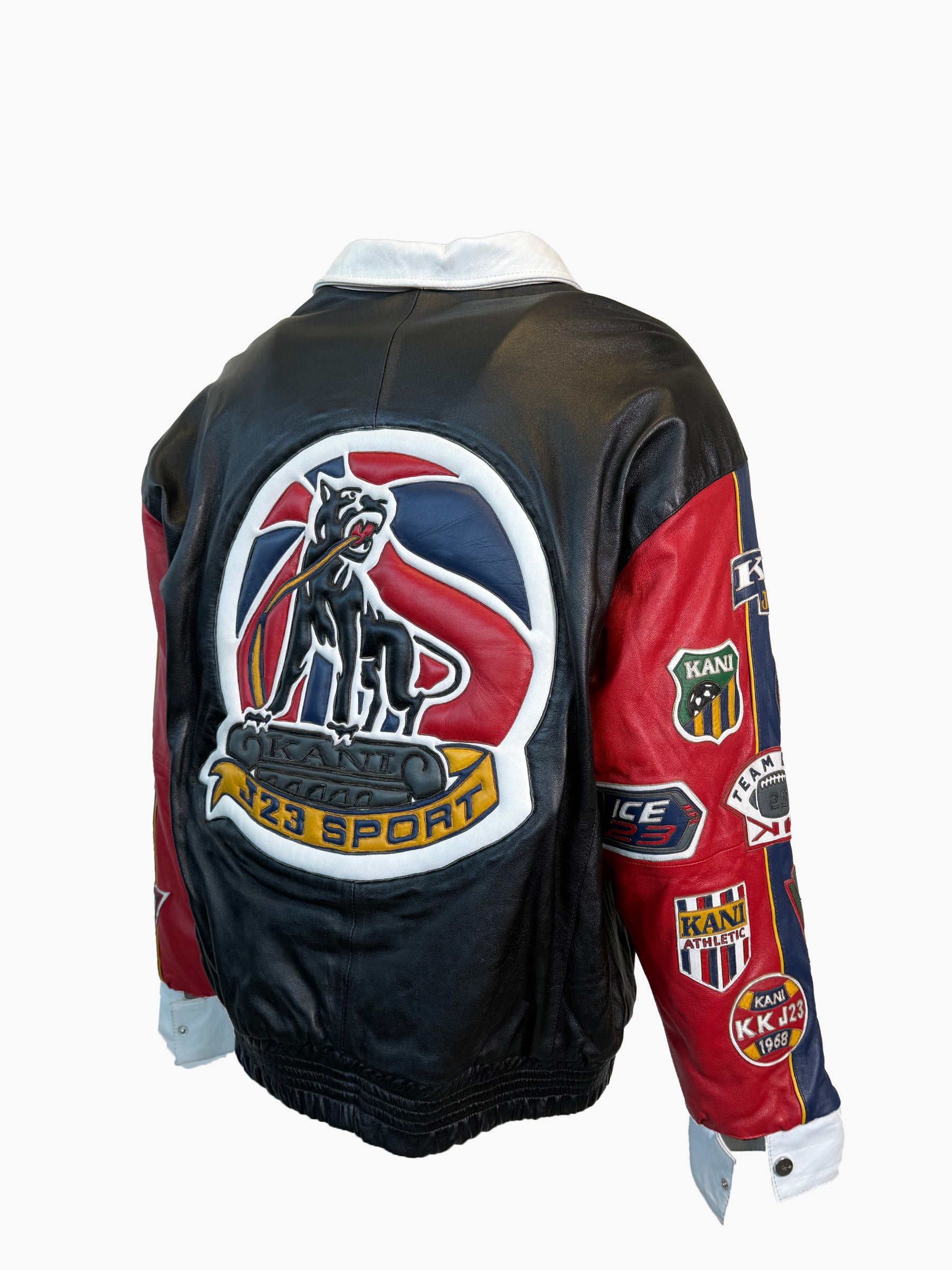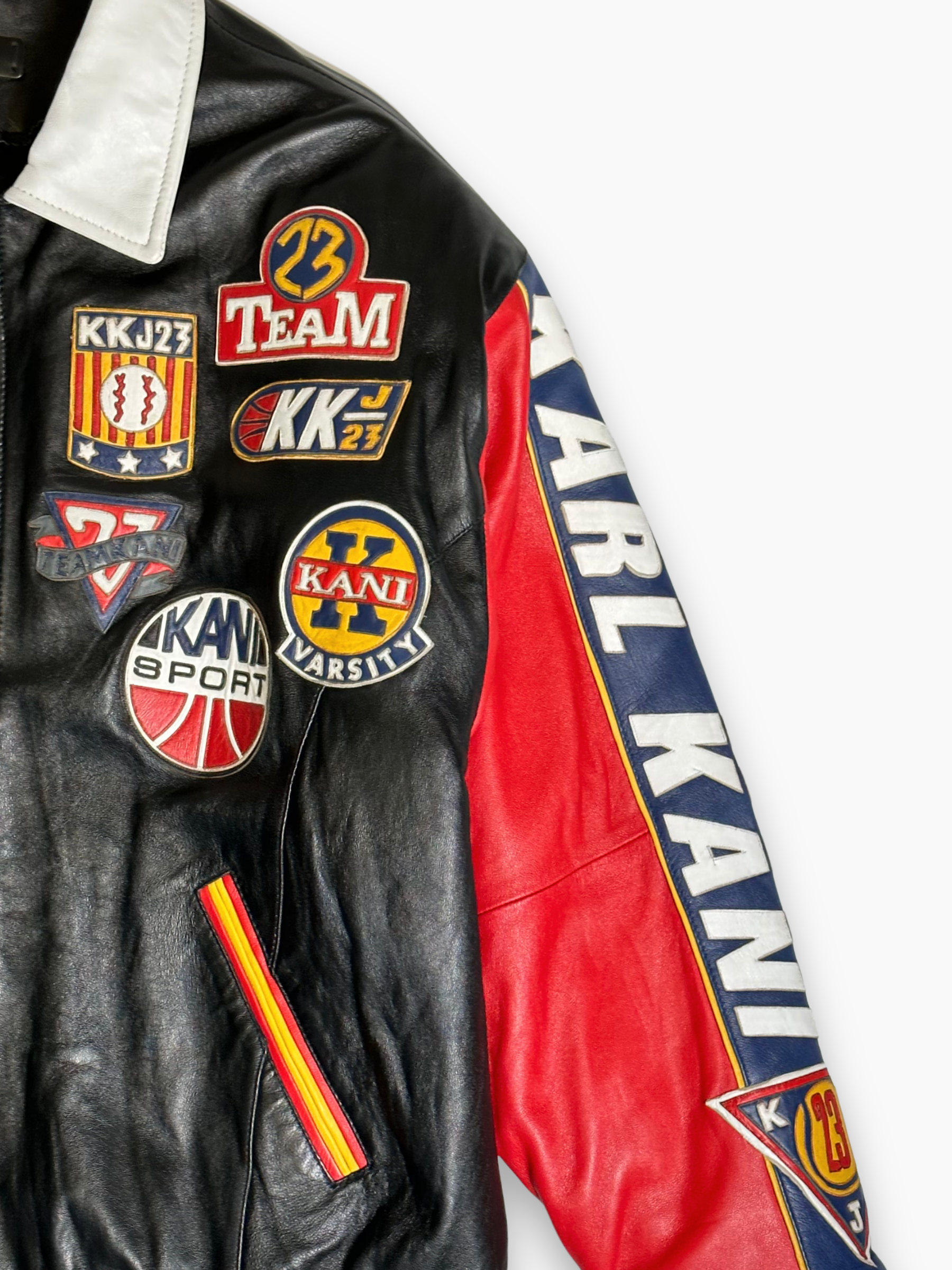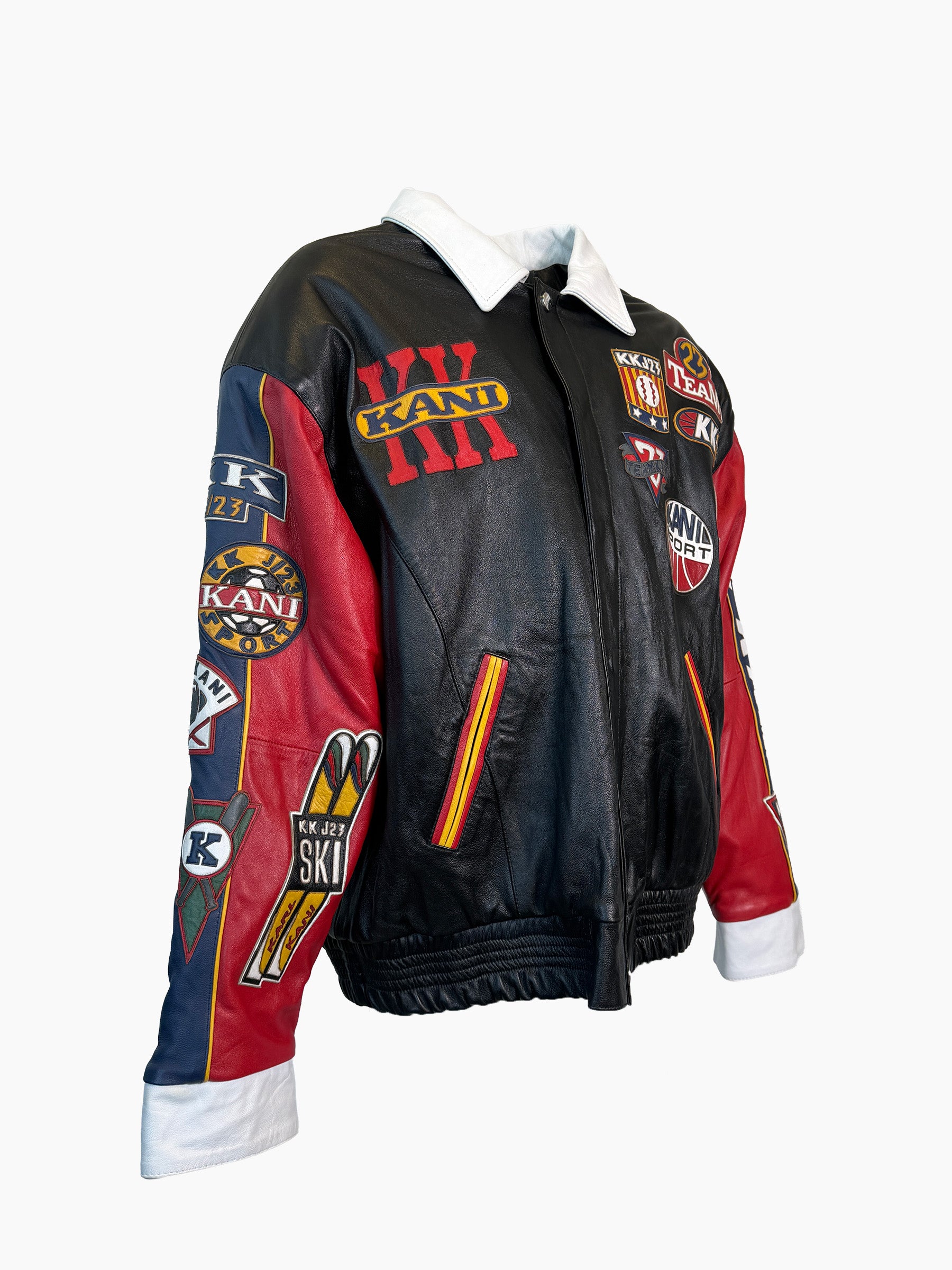 Giacca in pelle nera dallo stile varsity ispirato all’estetica street anni ’90, caratterizzata da numerose patch ricamate multicolore sul petto e sulle maniche. Presenta maniche a contrasto, colletto in pelle bianca, tasche laterali con dettaglio a righe e chiusura frontale con bottoni a pressione. Un capo iconico e deciso, perfetto per look urban dal carattere forte.