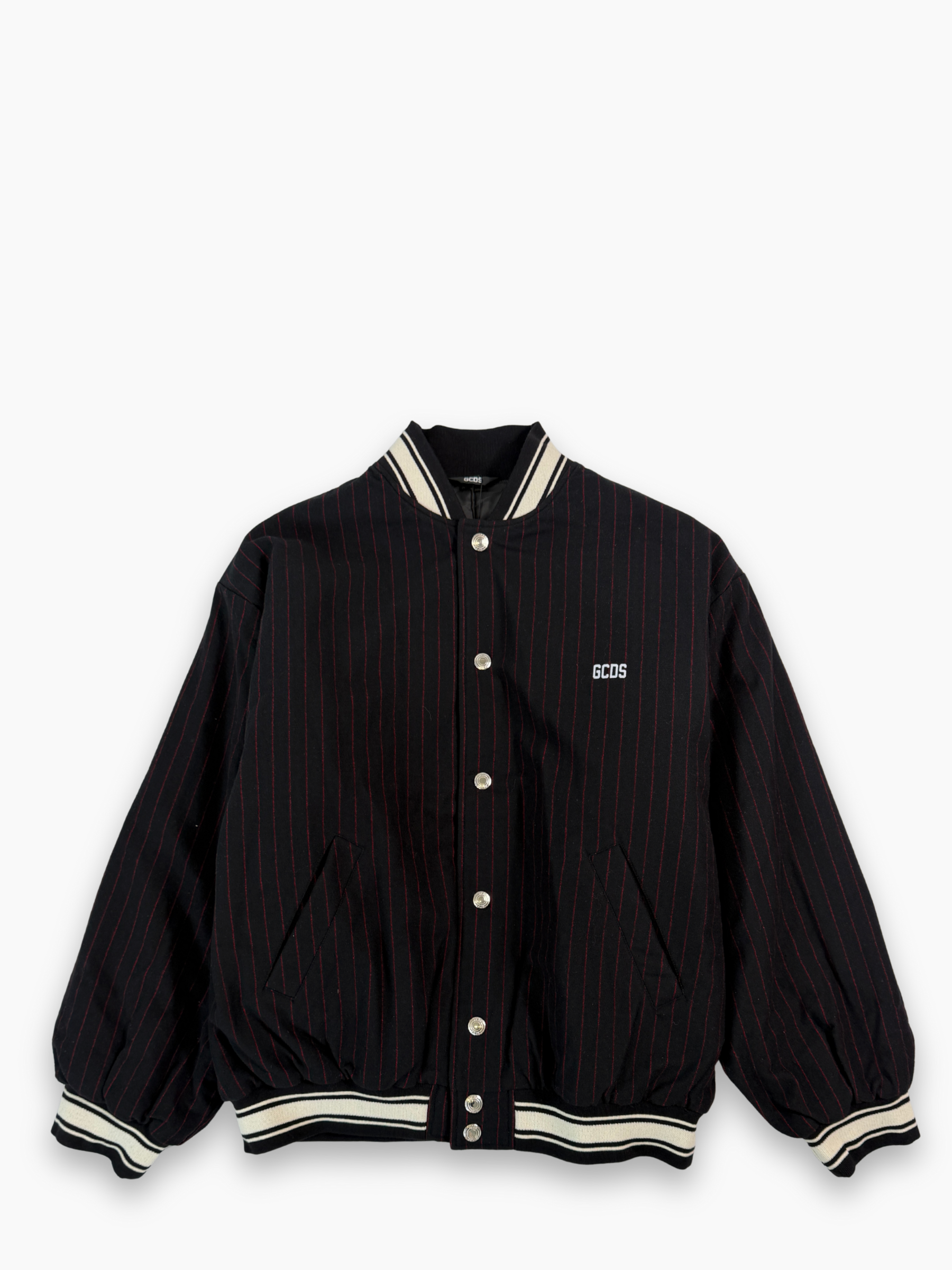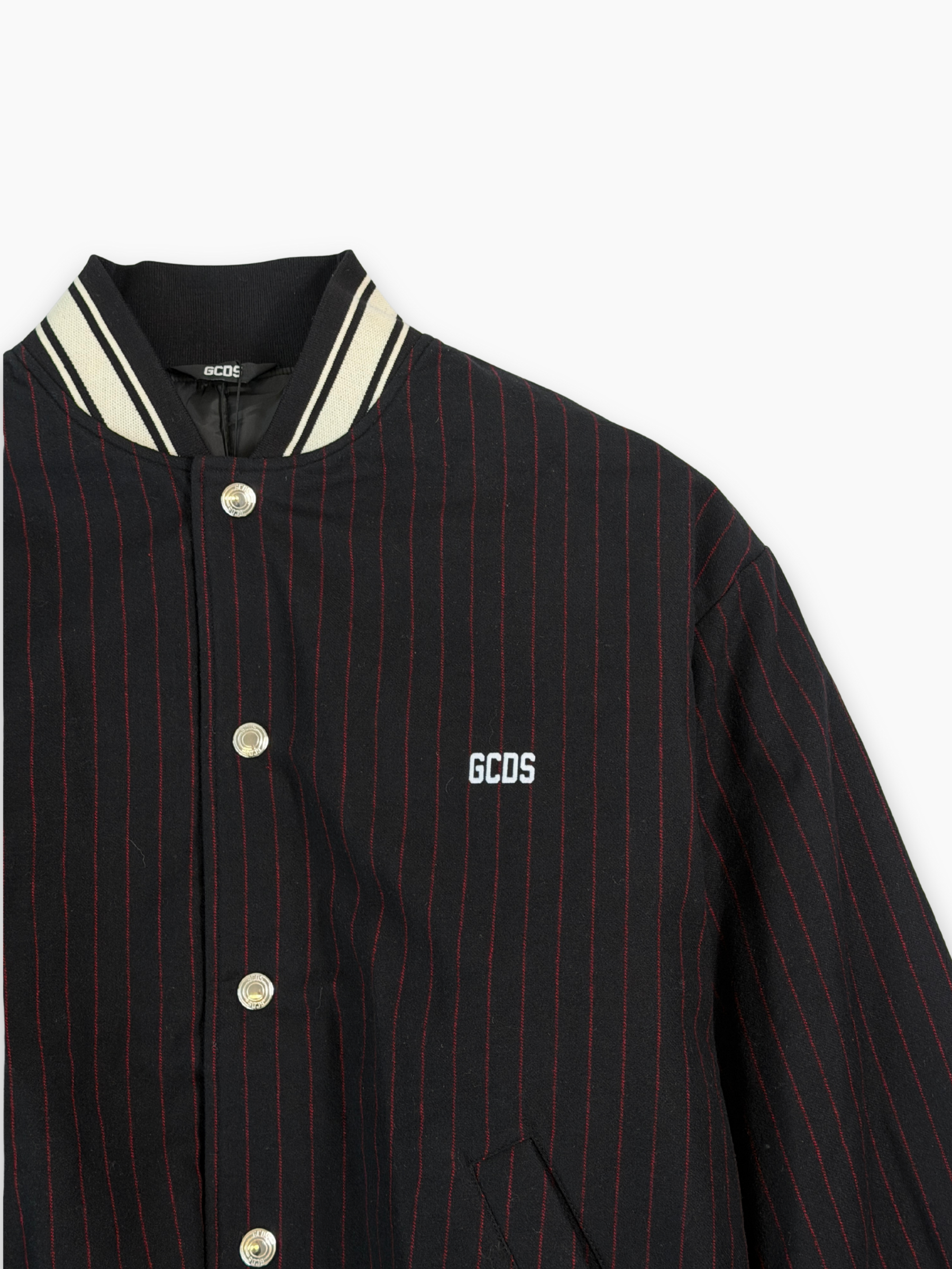 Bomber nero a righe sottili rosse con chiusura a bottoni e profili a contrasto. La struttura leggera è pensata per un fit comodo e contemporaneo, mentre il logo GCDS ricamato dona un accento iconico. Ideale per outfit streetwear e casual.