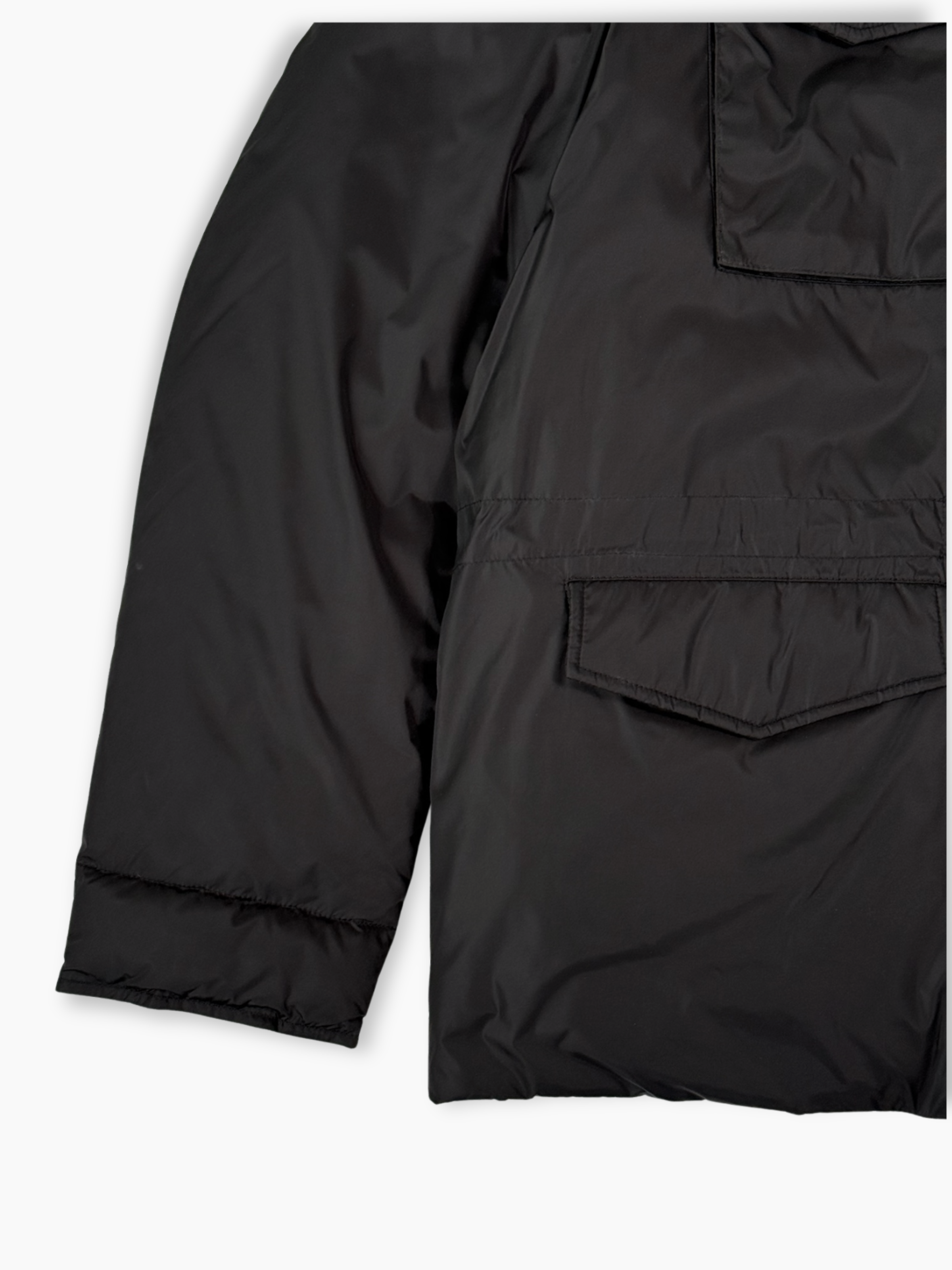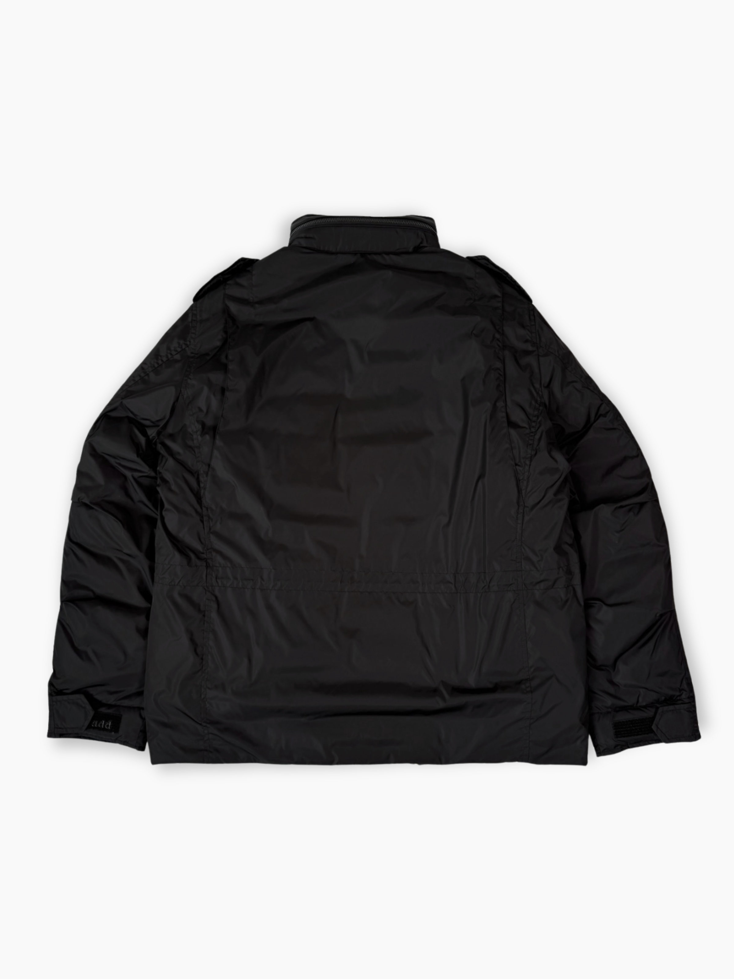 Giubbotto imbottito ADD in tessuto tecnico nero con linea decisa e stile funzionale. Presenta quattro tasche applicate con patta, chiusura frontale con zip coperta da pattina e colletto alto regolabile. Un capo pratico e urban, perfetto per i mesi freddi.