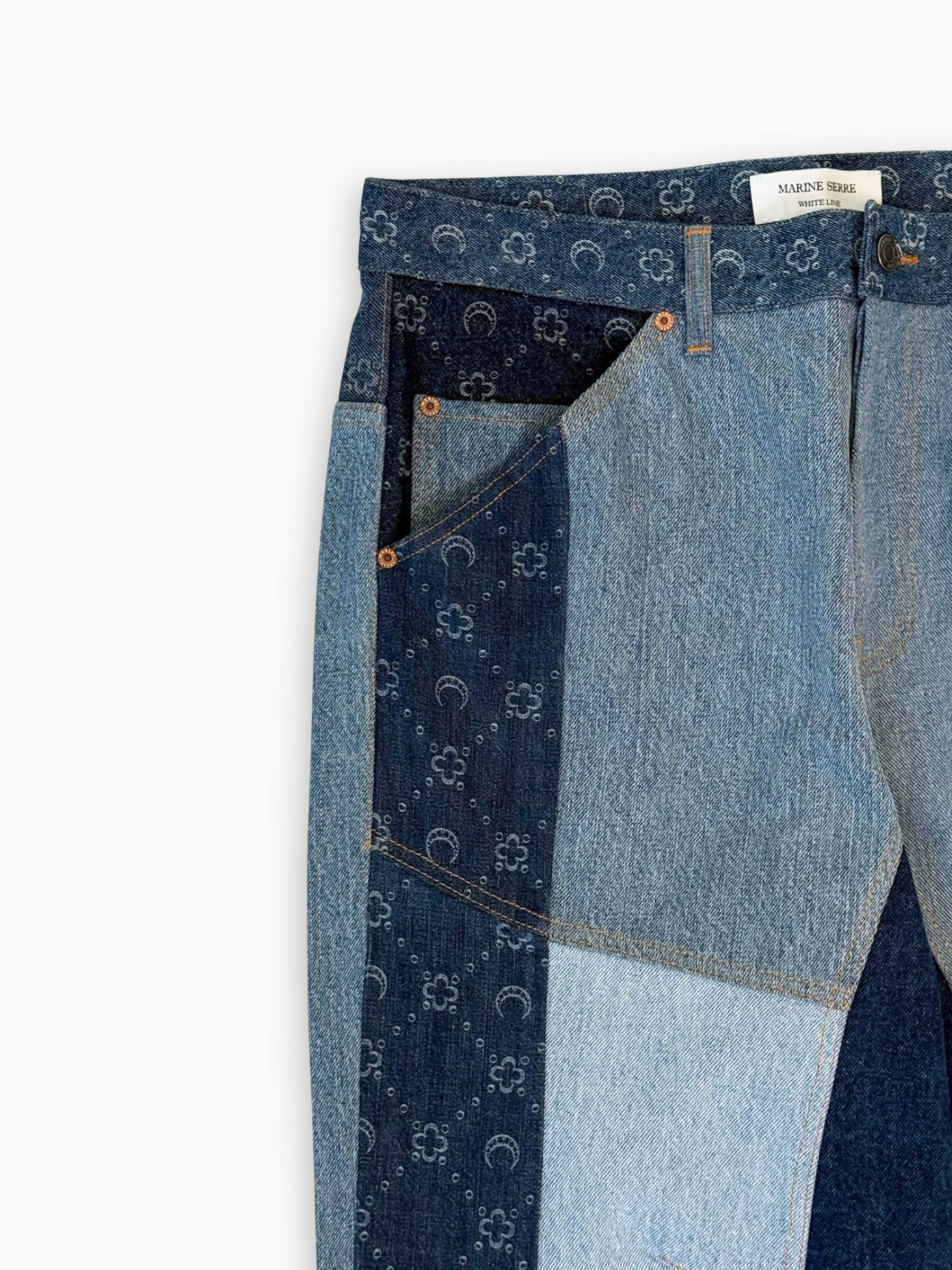 Jeans patchwork in denim multicolore dal design unico e contemporaneo. Realizzati con inserti di diversi lavaggi di jeans, presentano un gioco di tonalità dal blu chiaro al blu scuro con pannelli alternati e motivi monogram. Il taglio ampio e dritto dona comfort e stile, perfetto per chi ama un’estetica street e ricercata. Ideali per completare look casual dal forte carattere visivo.