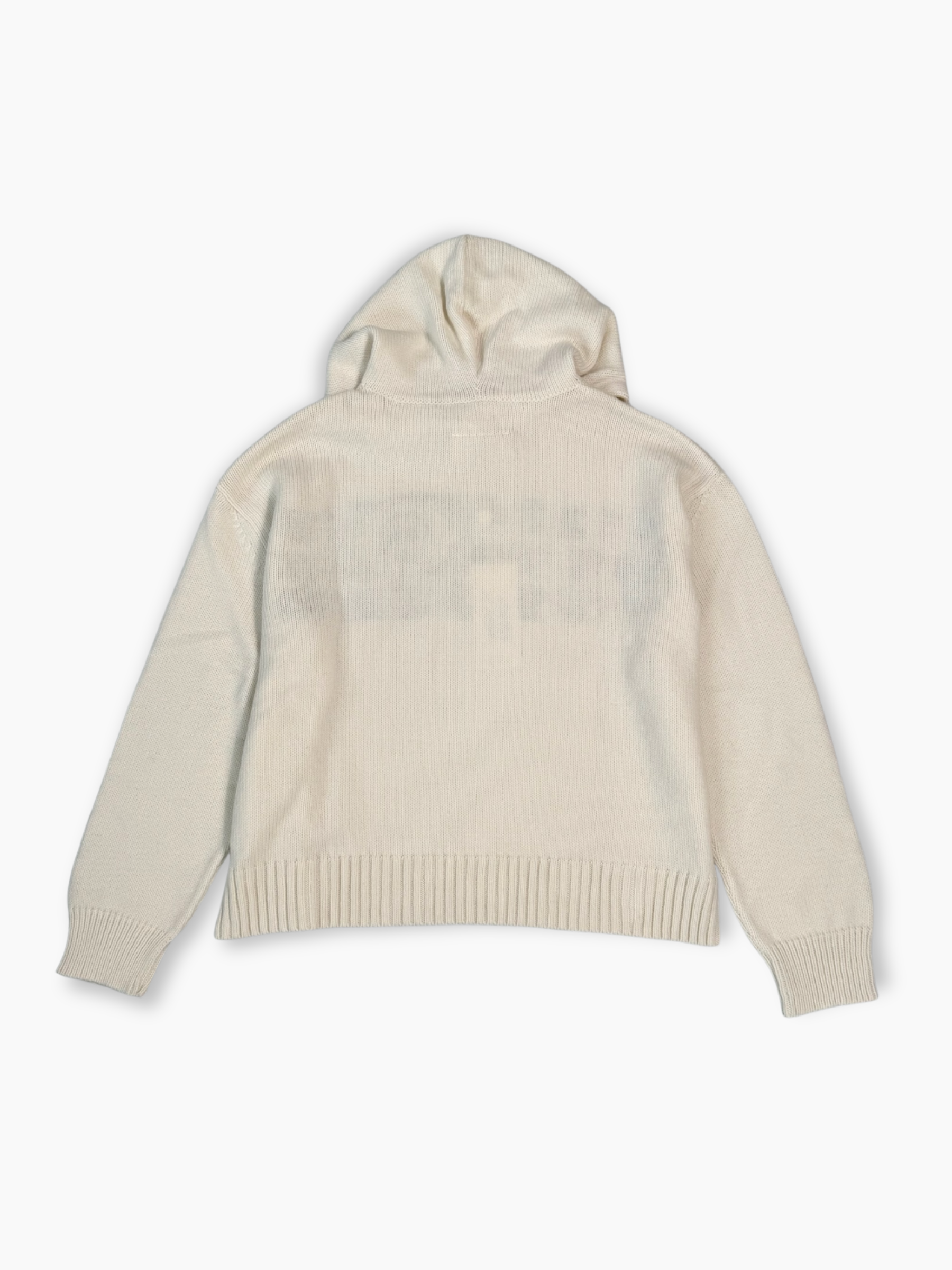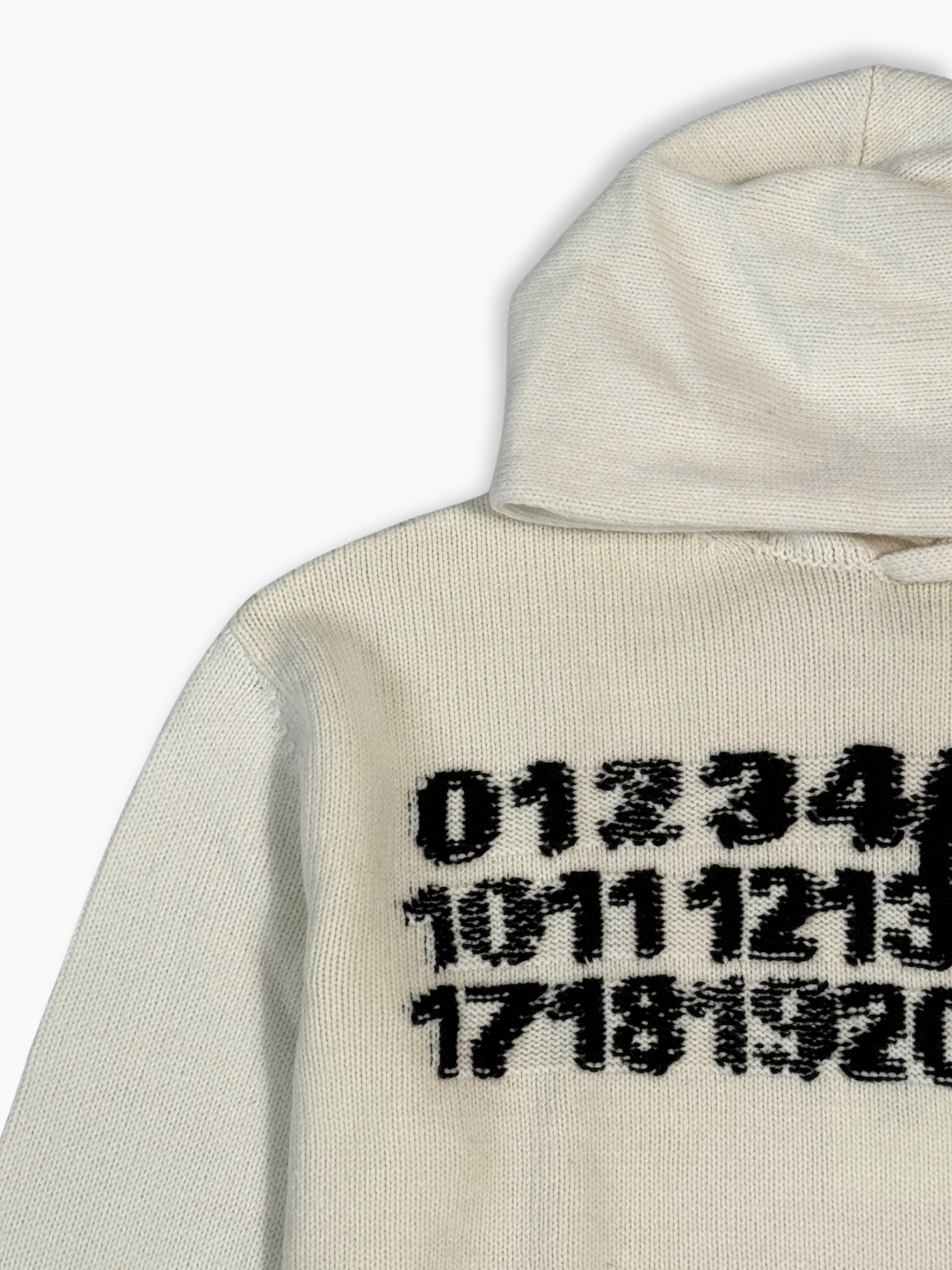 Maglione Maison Margiela MM6 in maglia bianca con cappuccio, caratterizzata dal logo numerico nero lavorato a jacquard sul retro con il numero 6 cerchiato. Un modello unico che unisce lo stile streetwear alla raffinatezza tipica della Maison.