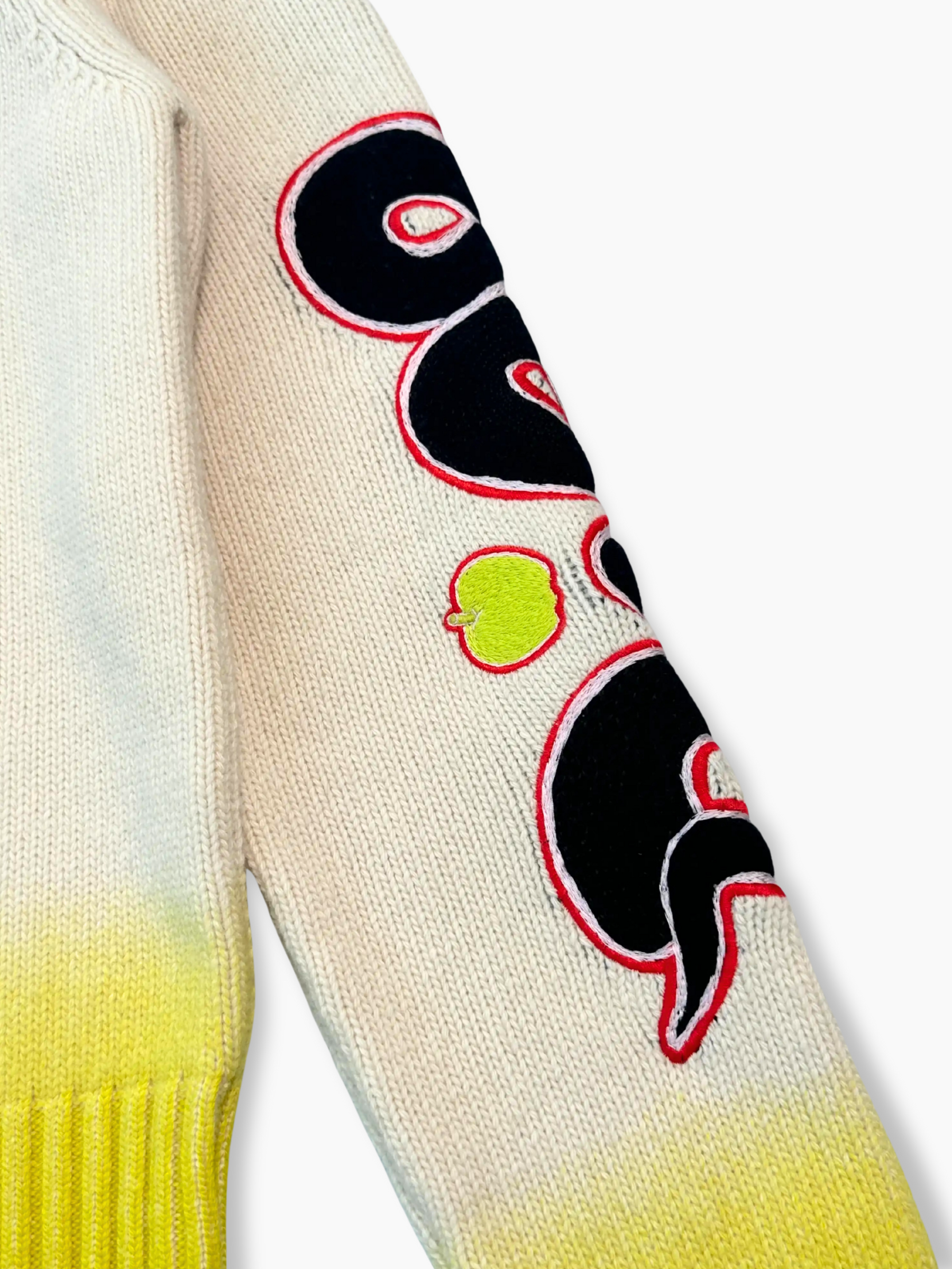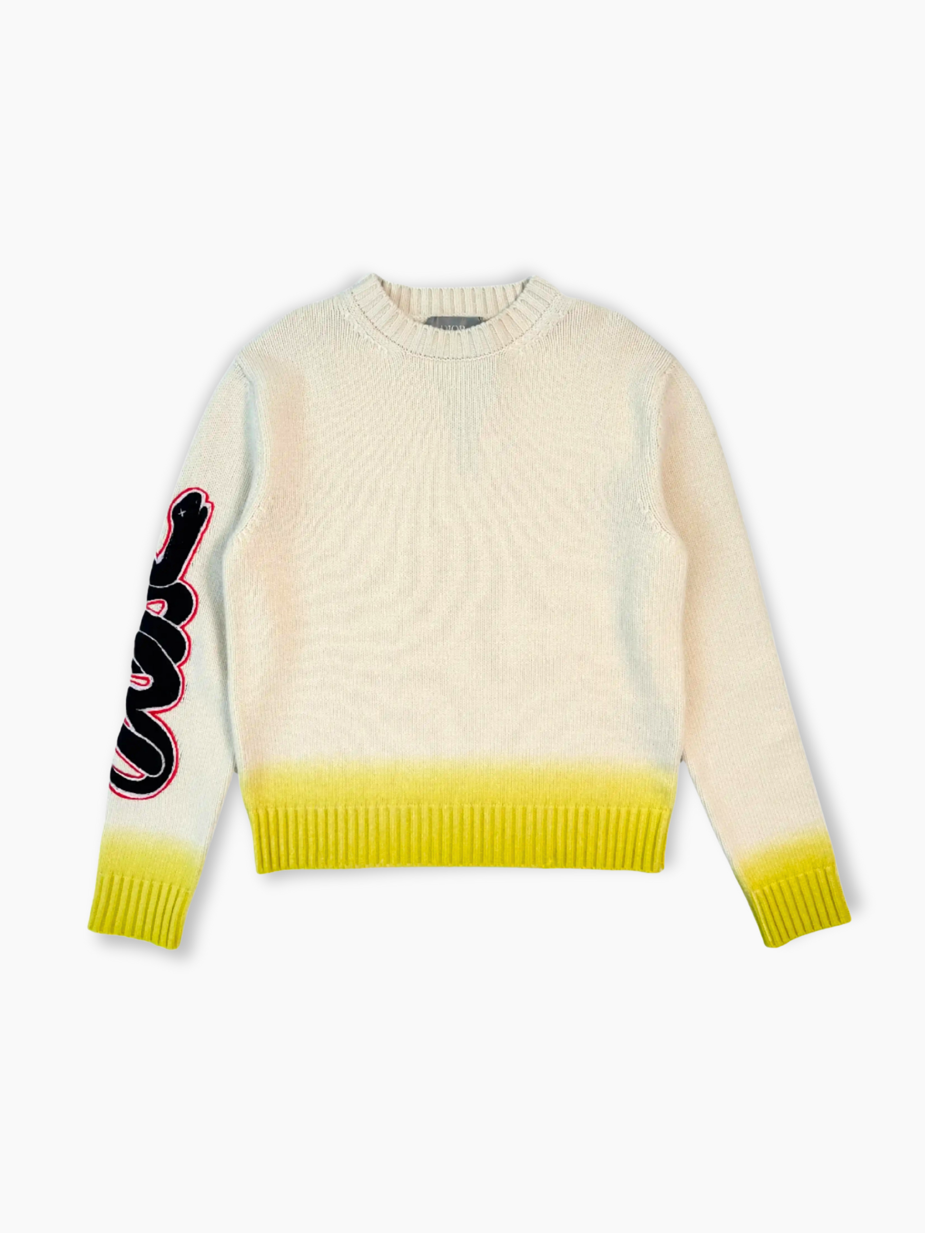 Maglione Dior in lana vergine bianca con sfumatura gialla sul fondo e ricamo serpente nero e rosso sulla manica sinistra. Il design girocollo e la vestibilità regolare rendono questo capo un perfetto equilibrio tra eleganza e originalità. Ideale per aggiungere un tocco moderno e grafico a ogni outfit casual chic.