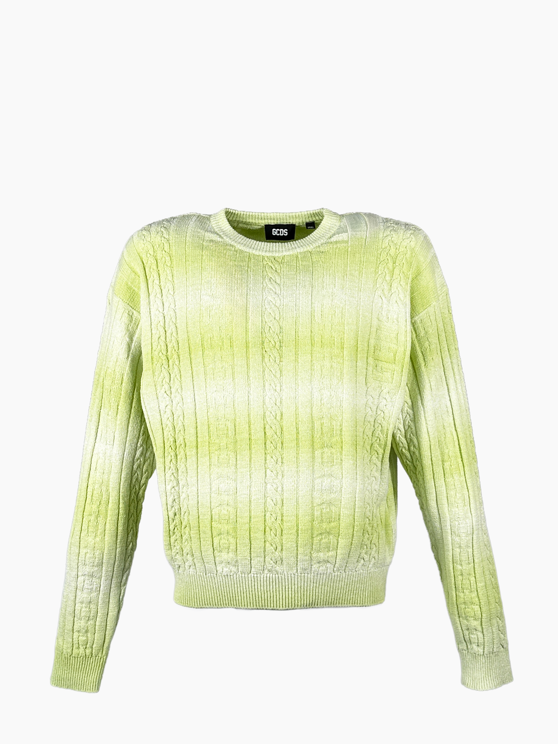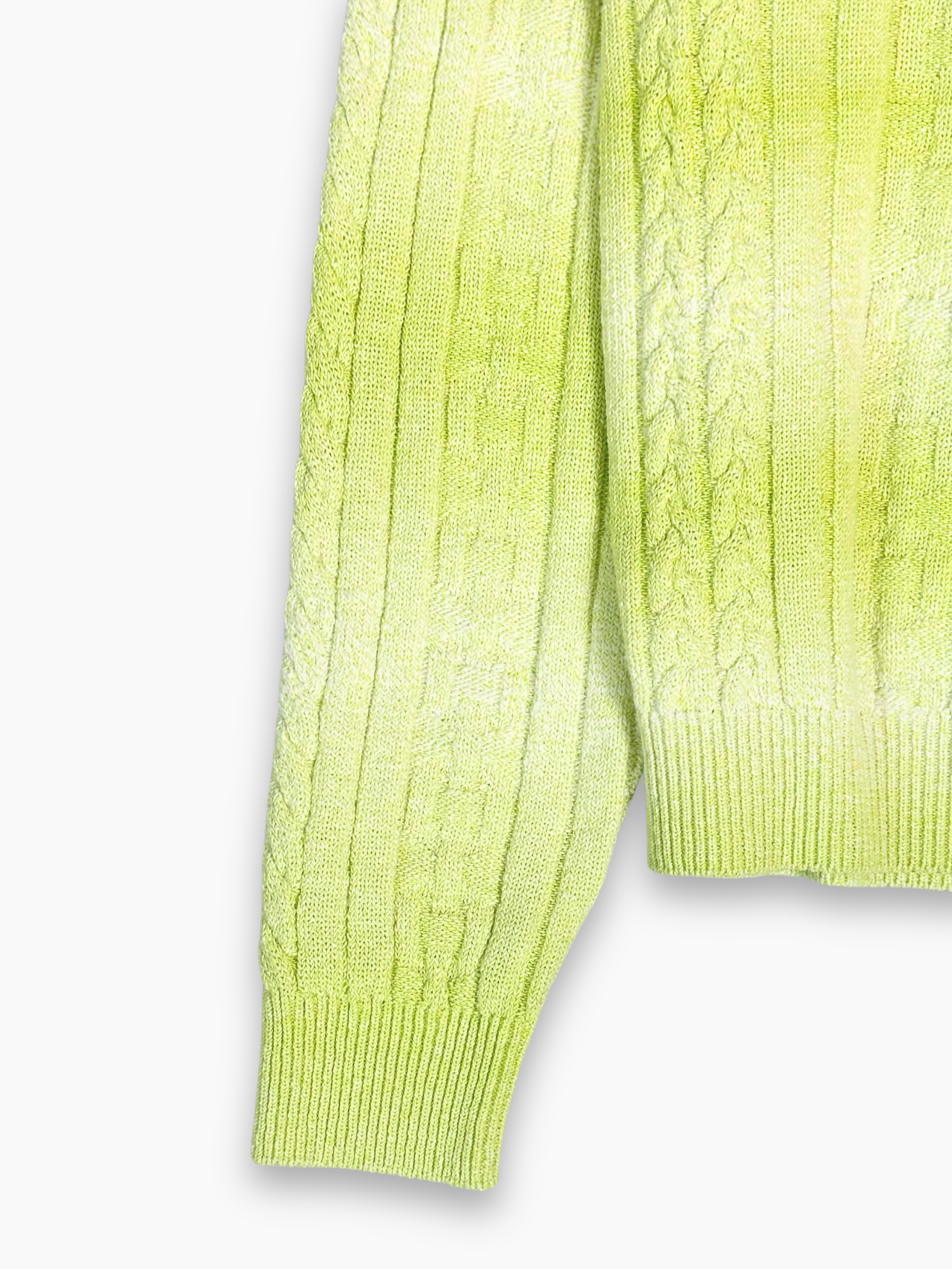 Maglia a maniche lunghe in tonalità verde lime con lavorazione a trecce e effetto sfumato. Morbida, luminosa e confortevole, perfetta per aggiungere un tocco di colore ai look quotidiani.