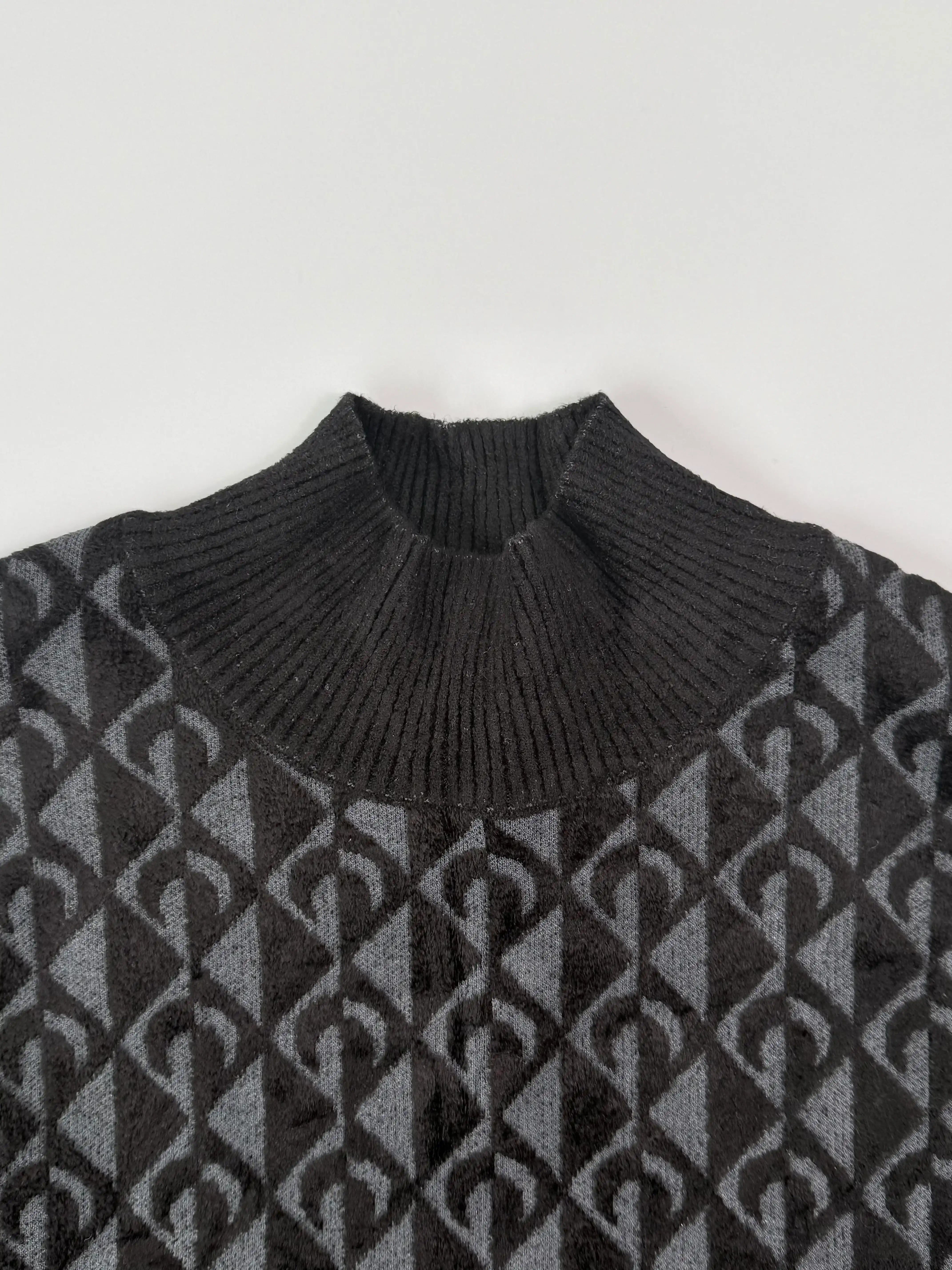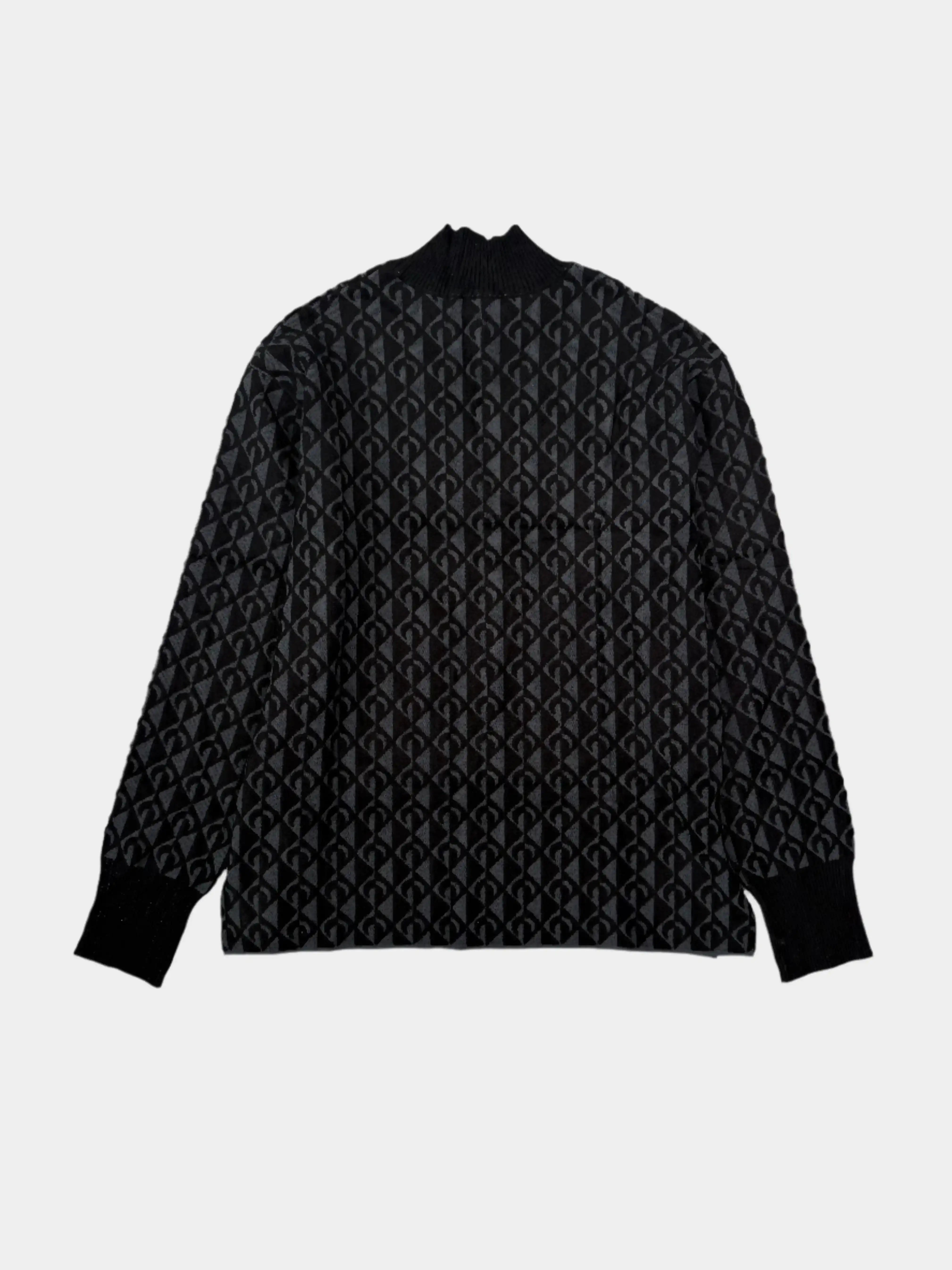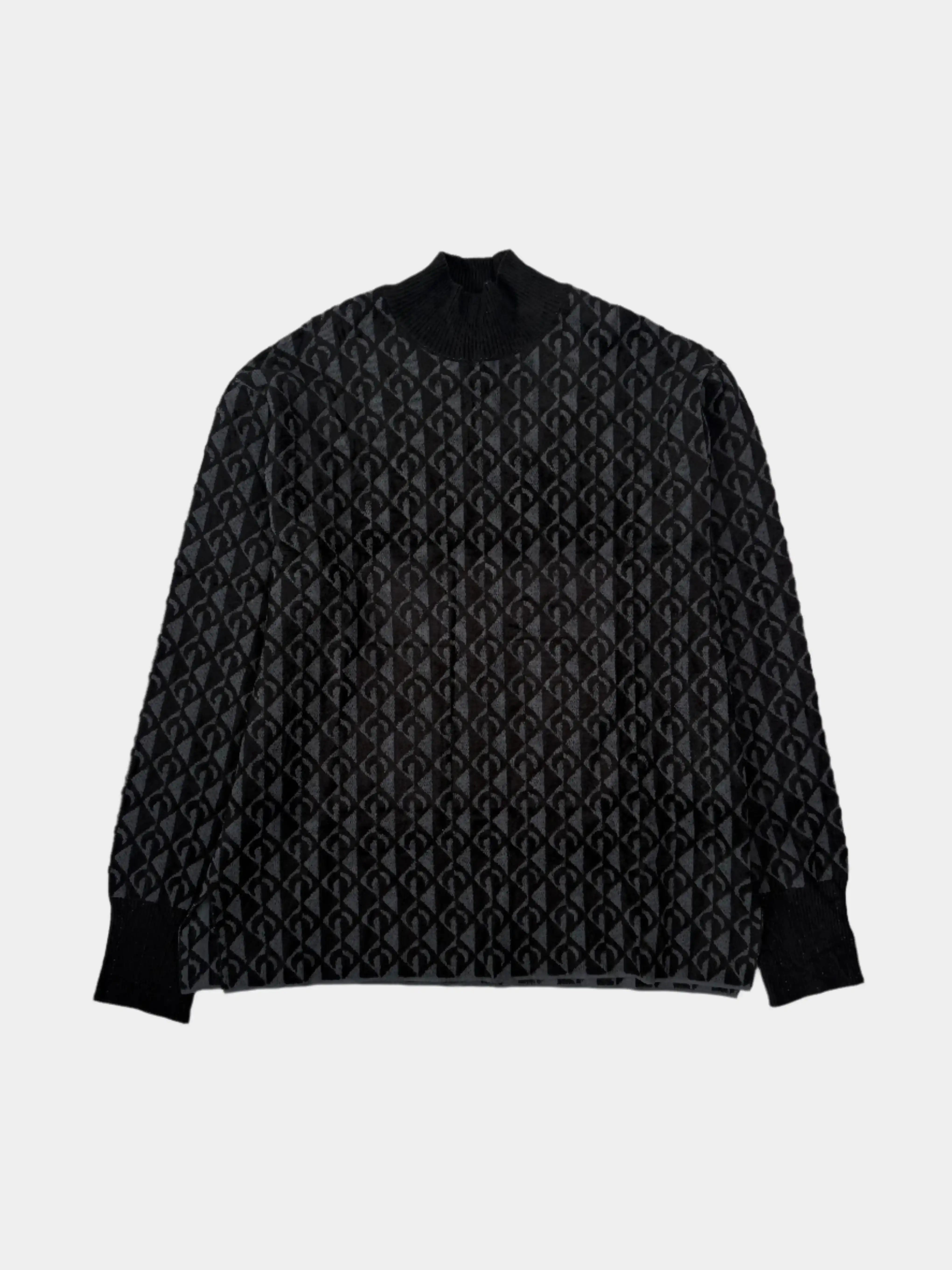 Questo maglione firmato Marine Serre esprime un’estetica distintiva e sofisticata grazie al pattern monogram all-over tono su tono. Realizzato in viscosa, il capo presenta una texture morbida e fluida che valorizza la silhouette. Il collo alto a costine e i bordi a coste su maniche e fondo completano un design contemporaneo e raffinato.