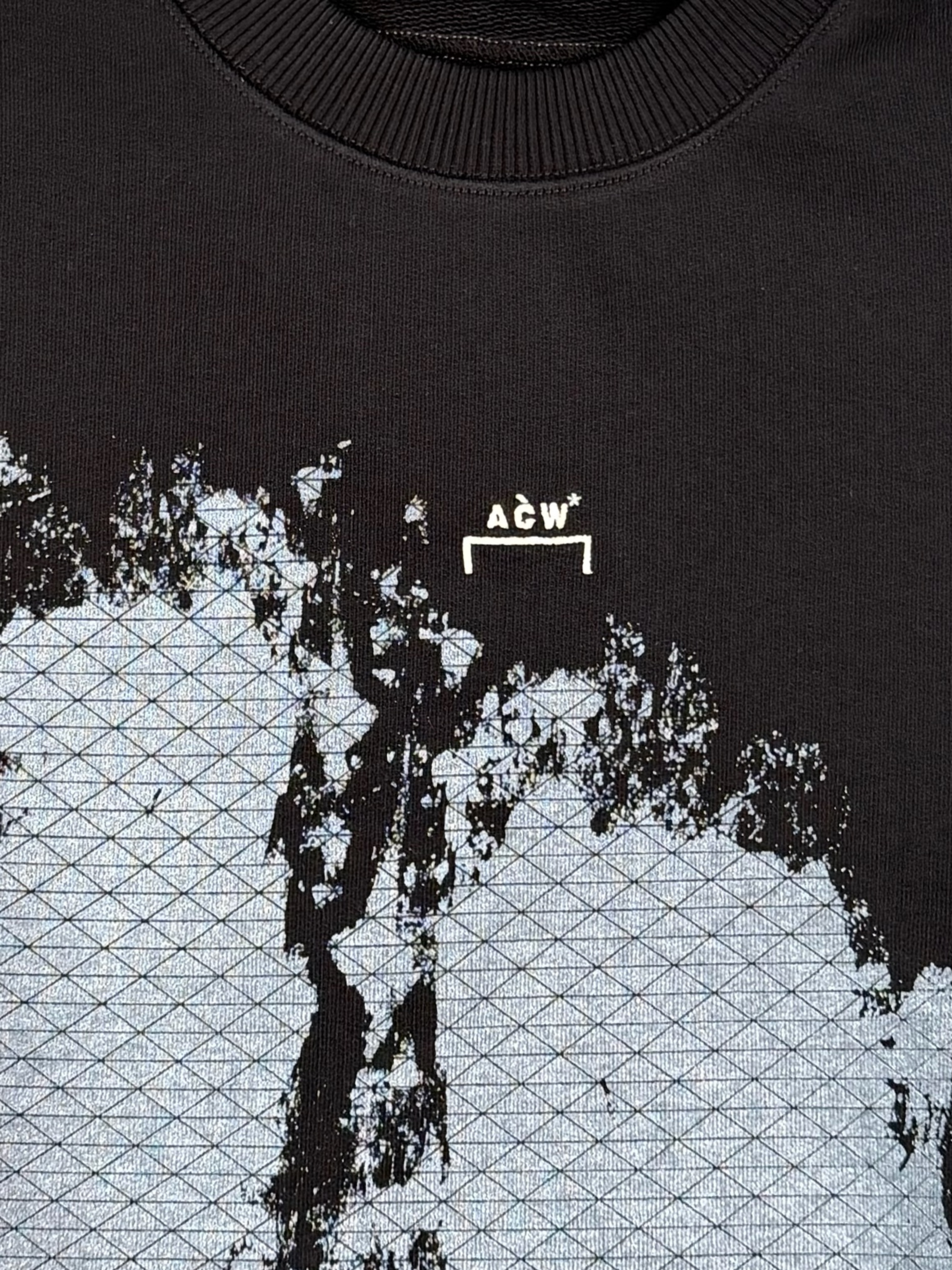 Maglione girocollo in cotone nero con pannello anteriore grigio testurizzato e stampa astratta effetto brushstroke. Un capo iconico che unisce estetica sperimentale e urban style, interpretando lo spirito creativo di A-COLD-WALL*. Ideale per look streetwear distintivi e contemporanei.