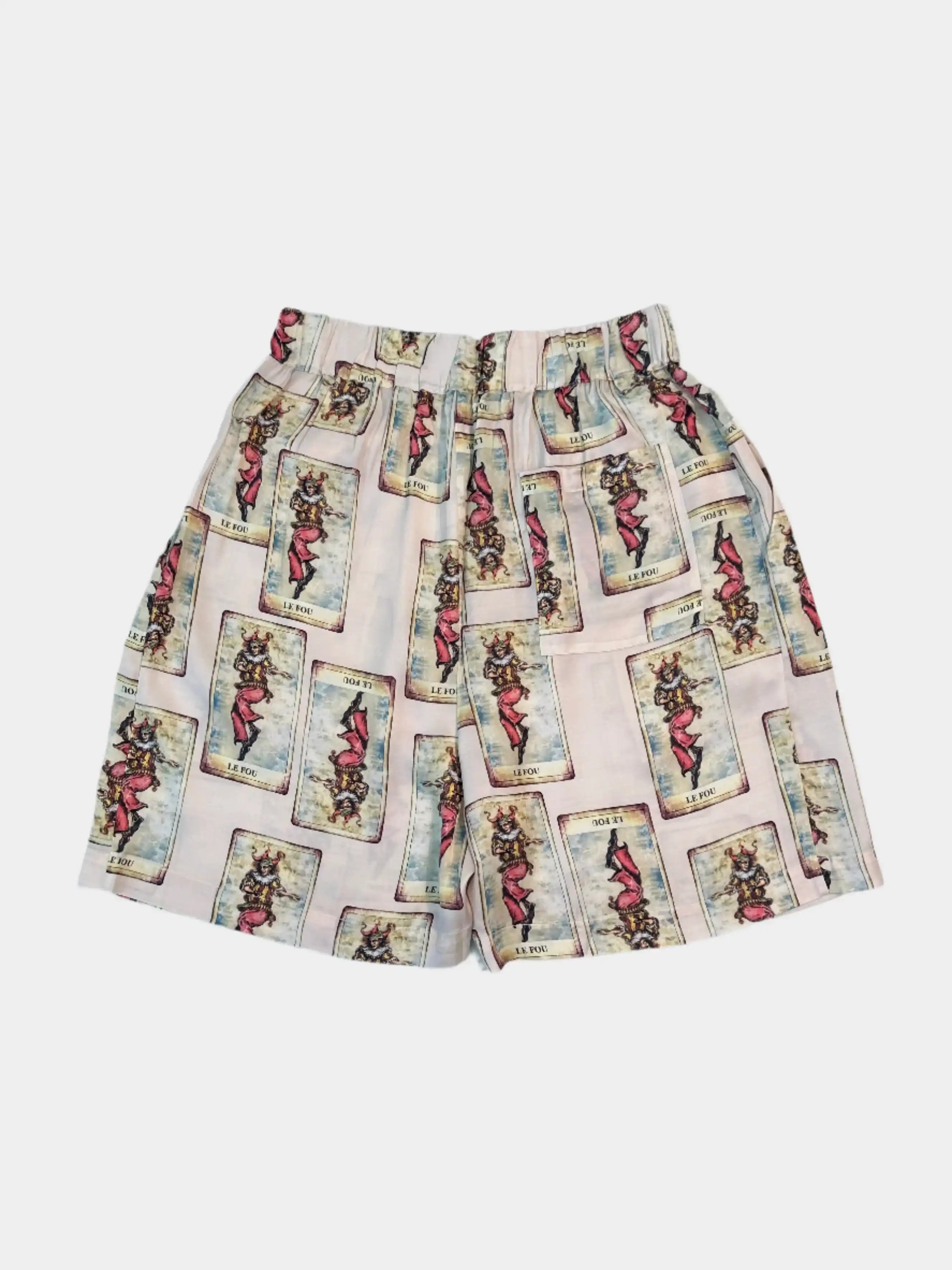 Pantaloncini firmati Laneus con originale stampa ispirata alle carte dei tarocchi, protagonista la figura de “Le Fou”. Un capo dalla personalità decisa e dal tocco artistico, perfetto per un look estivo distintivo e fuori dagli schemi.