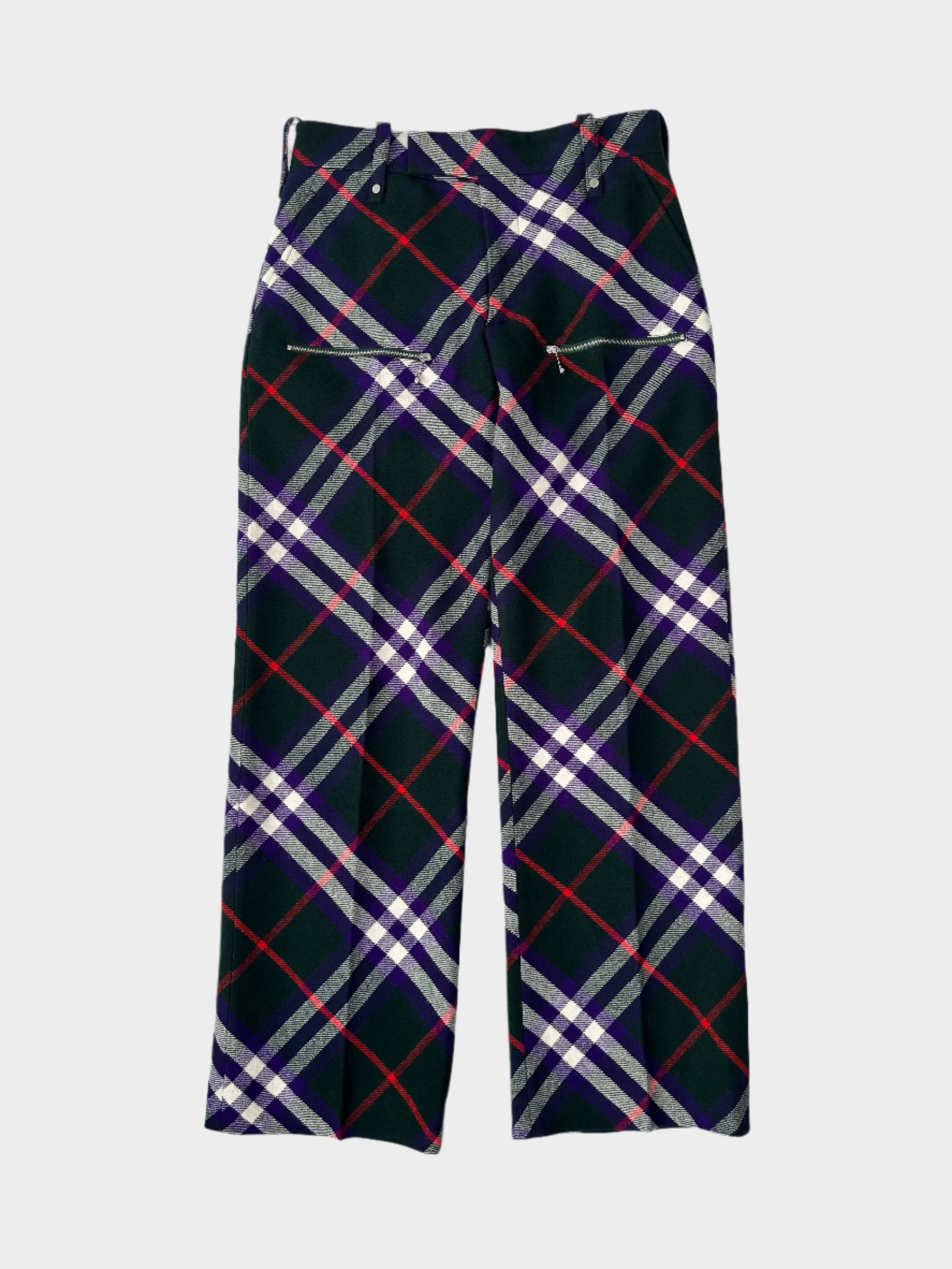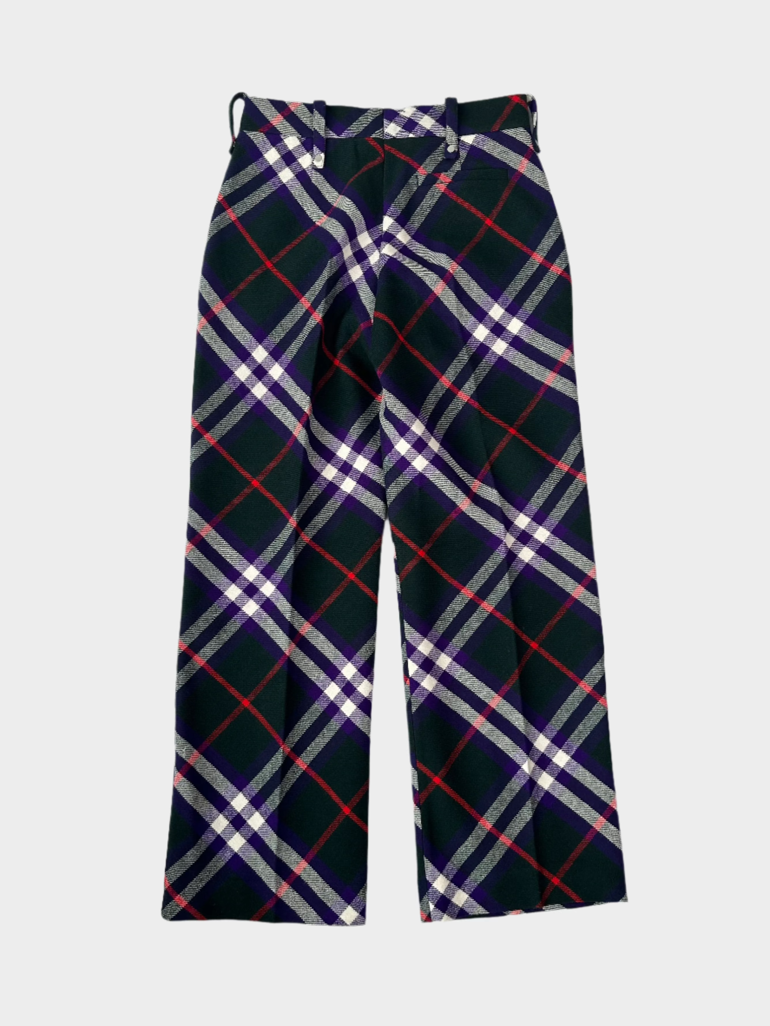 Questi pantaloni firmati Burberry uniscono un taglio sartoriale a un'estetica audace grazie al pattern check multicolore. Realizzati in pura lana, presentano una silhouette dritta con tasche a filetto posteriori e passanti per cintura. I colori a contrasto in rosso, viola e grigio rendono il capo un vero statement piece perfetto per look distintivi e contemporanei.