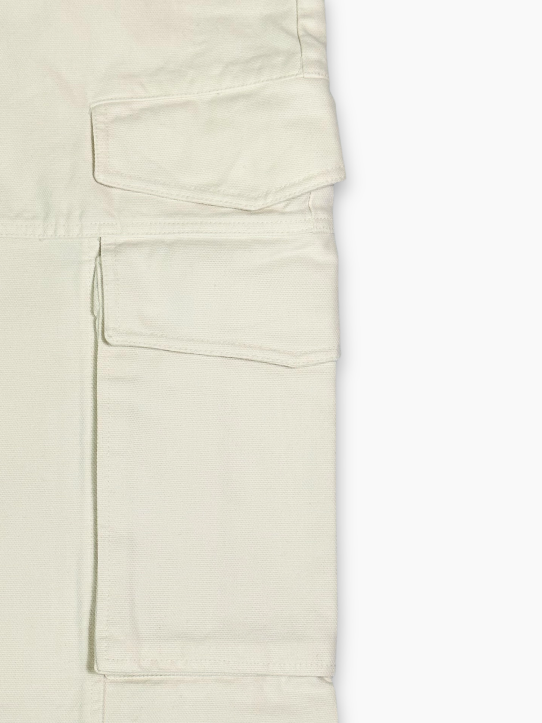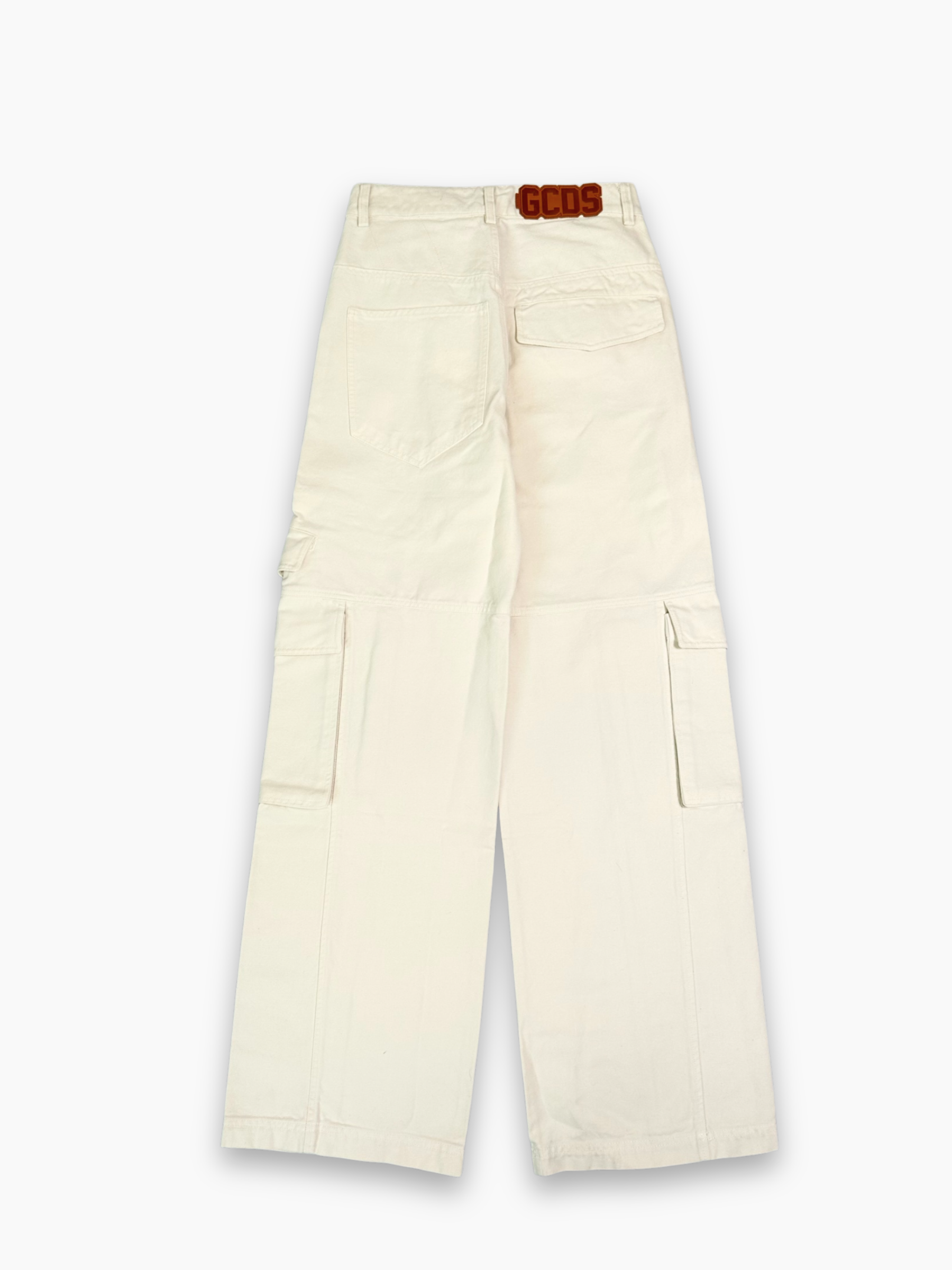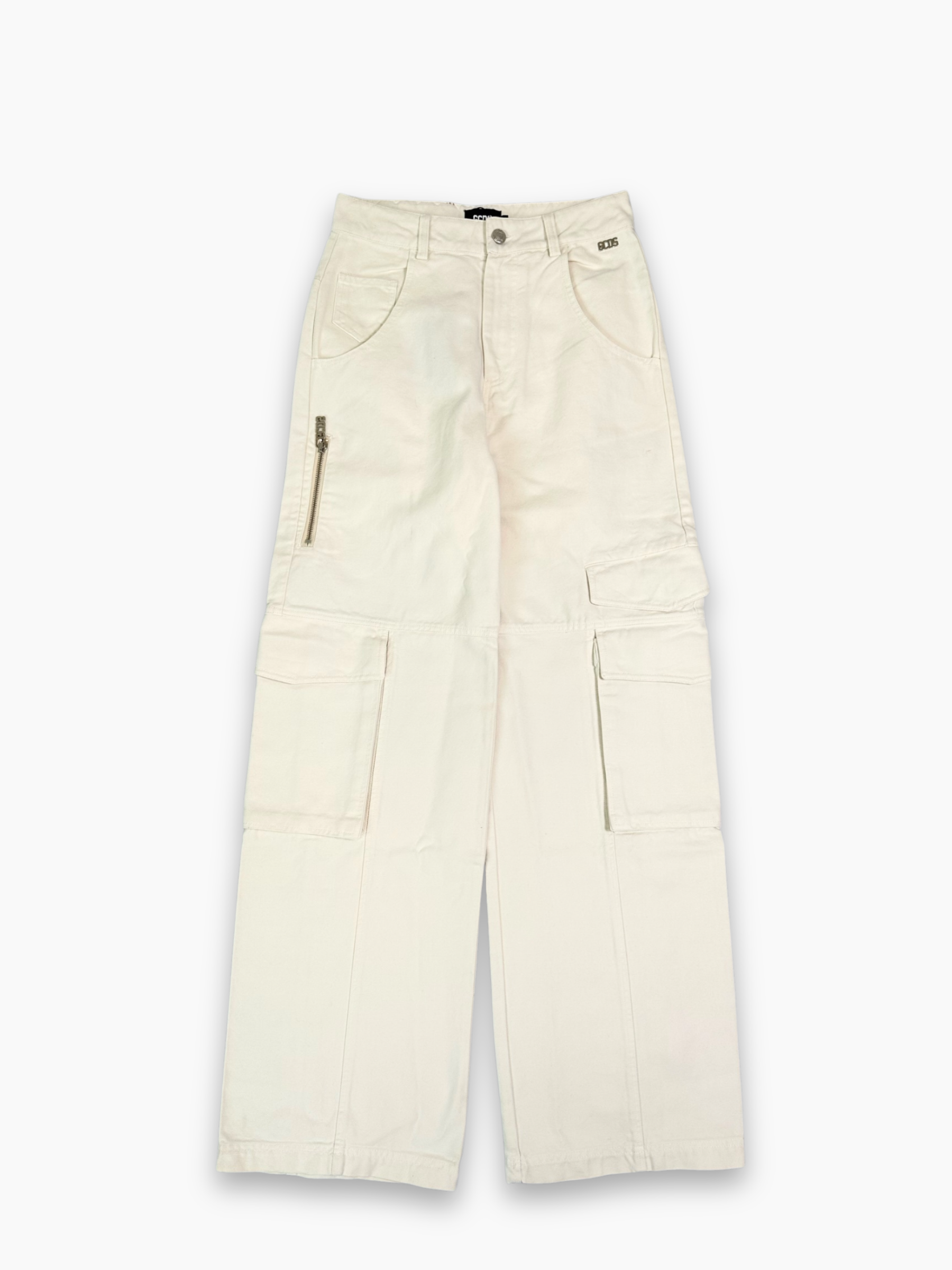 Pantaloni cargo bianchi dallo stile moderno e funzionale, caratterizzati da una gamba larga e da un fit morbido. Presentano tasche multiple applicate, una zip laterale e una costruzione strutturata che richiama l’estetica utility. Un modello versatile, ideale per look streetwear e casual.