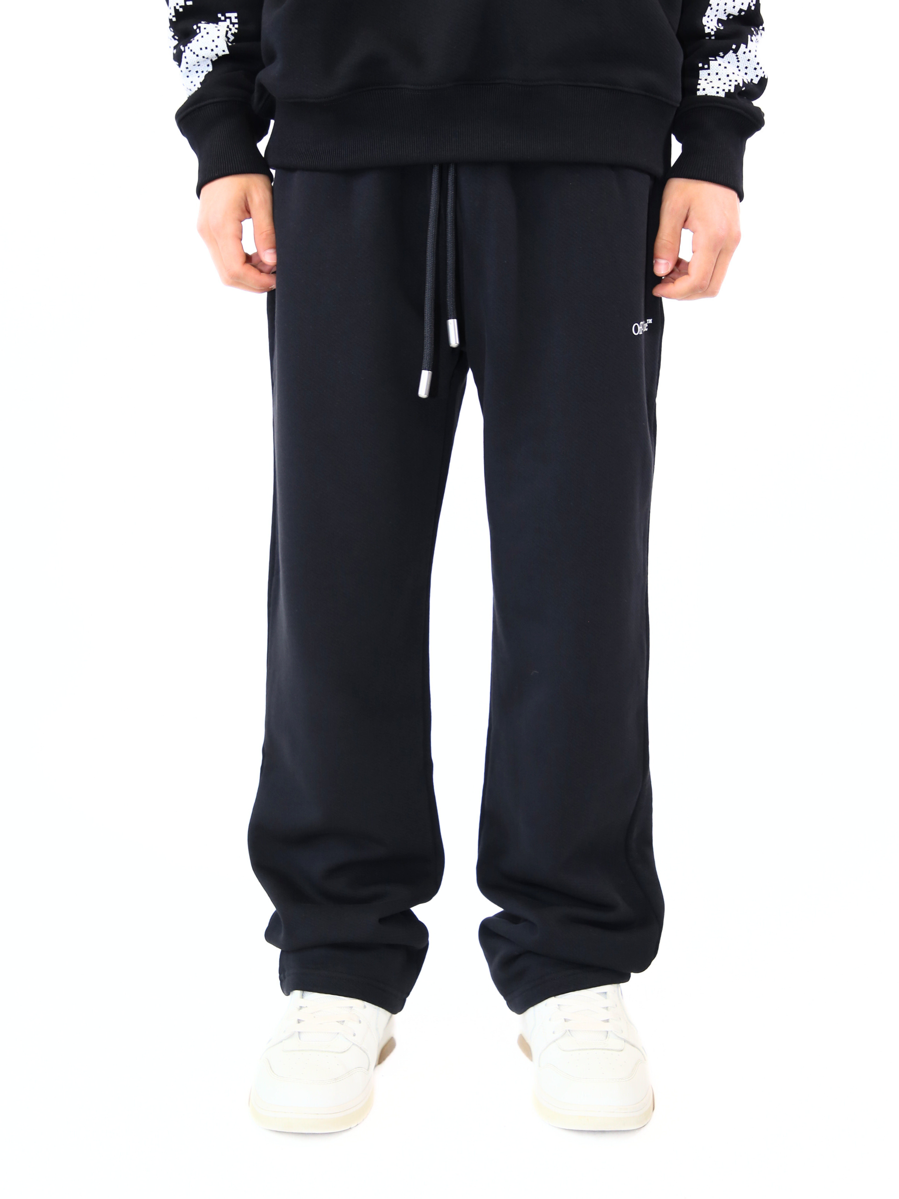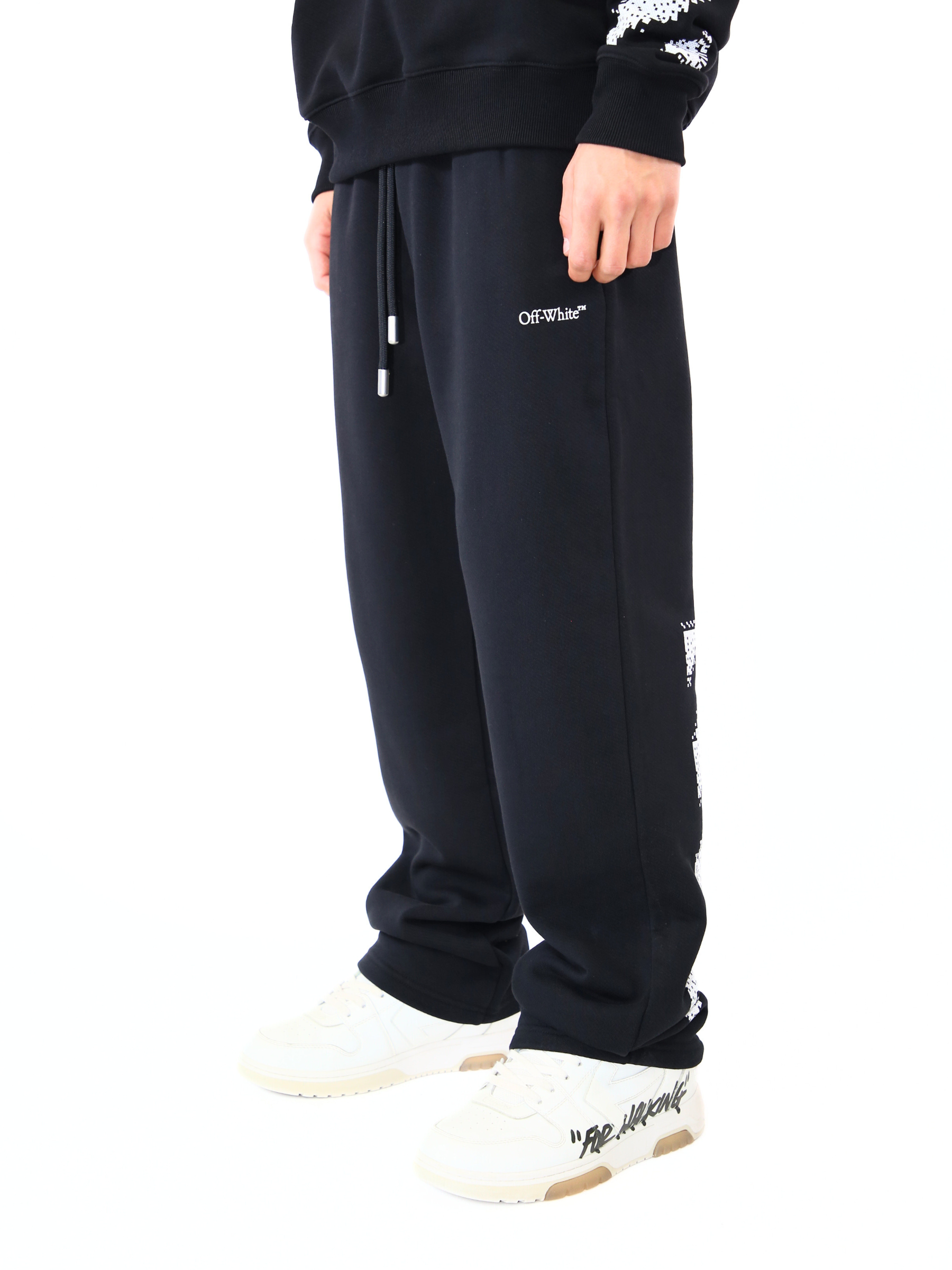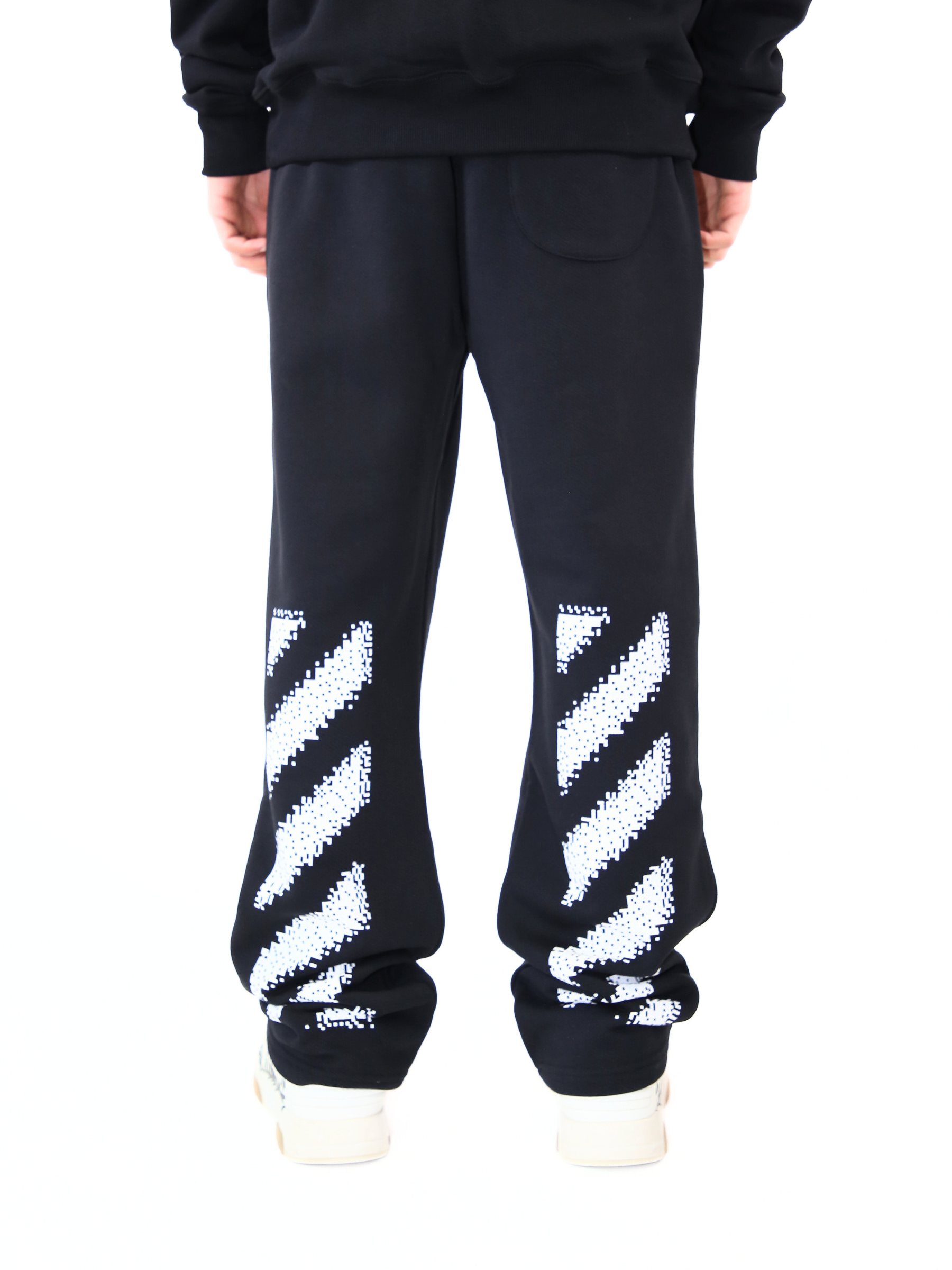 Pantaloni in cotone nero firmati Off-White™, caratterizzati da logo frontale minimal e dal distintivo motivo con righe diagonali bianche stampate sul retro delle gambe. Un capo iconico del brand, perfetto per chi cerca uno stile streetwear deciso ma raffinato.