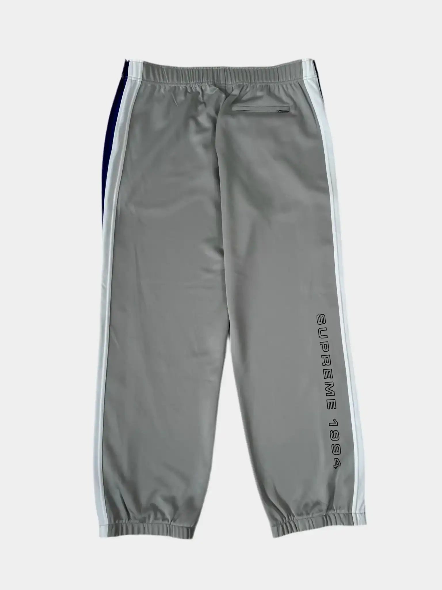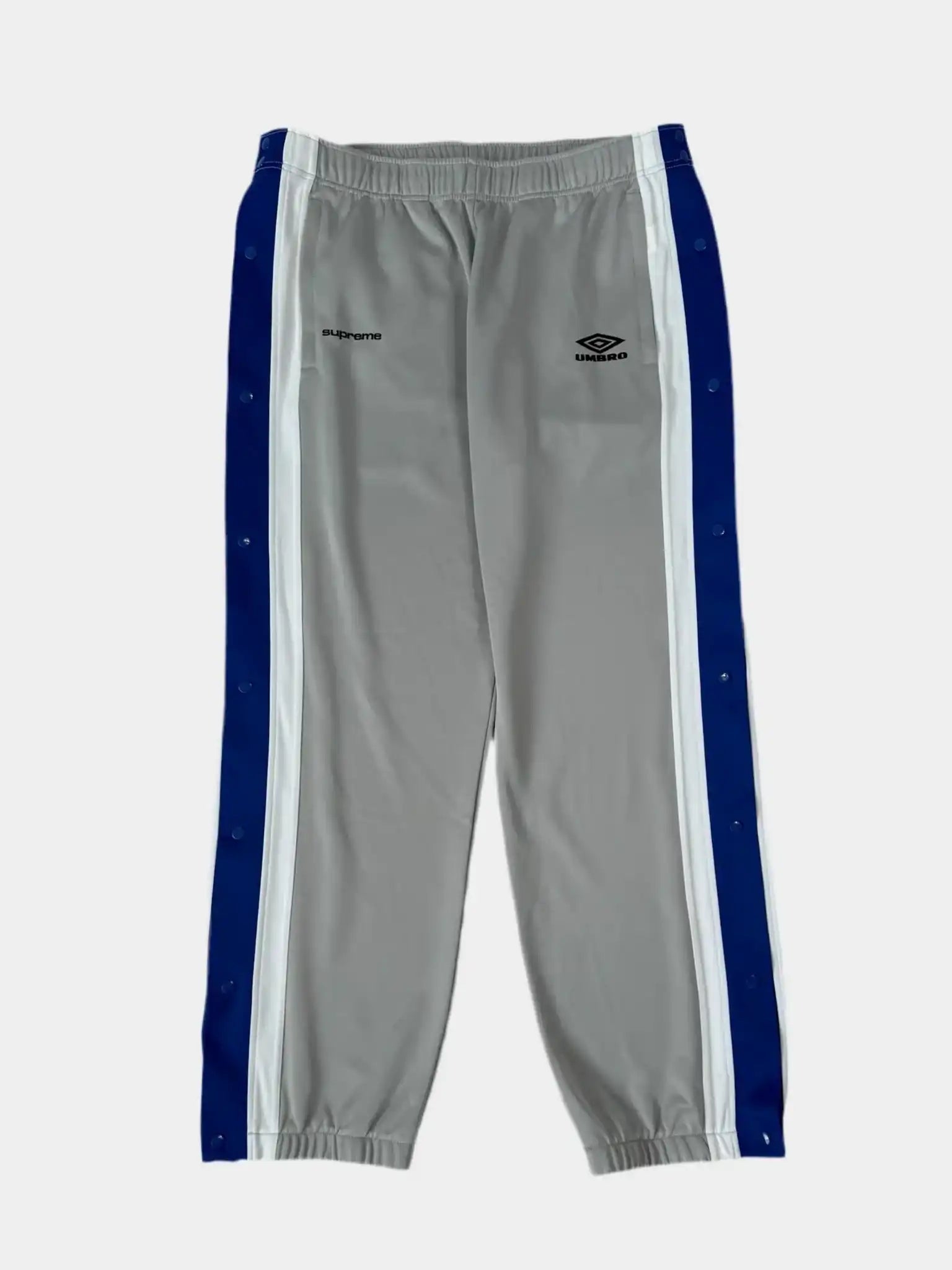 Pantaloni della tuta Umbro in collaborazione con Supreme, realizzato in acetato grigio con dettagli a contrasto per un look sportivo dal forte impatto visivo. I loghi a contrasto sono posizionati in corrispondenza delle tasche. Le gambe sono dotate di bottoni a pressione lungo tutta la lunghezza per una vestibilità modulabile e uno stile old-school. Completano il design le tasche laterali e posteriori con zip, polsini alle caviglie, elastico e cordini in vita.