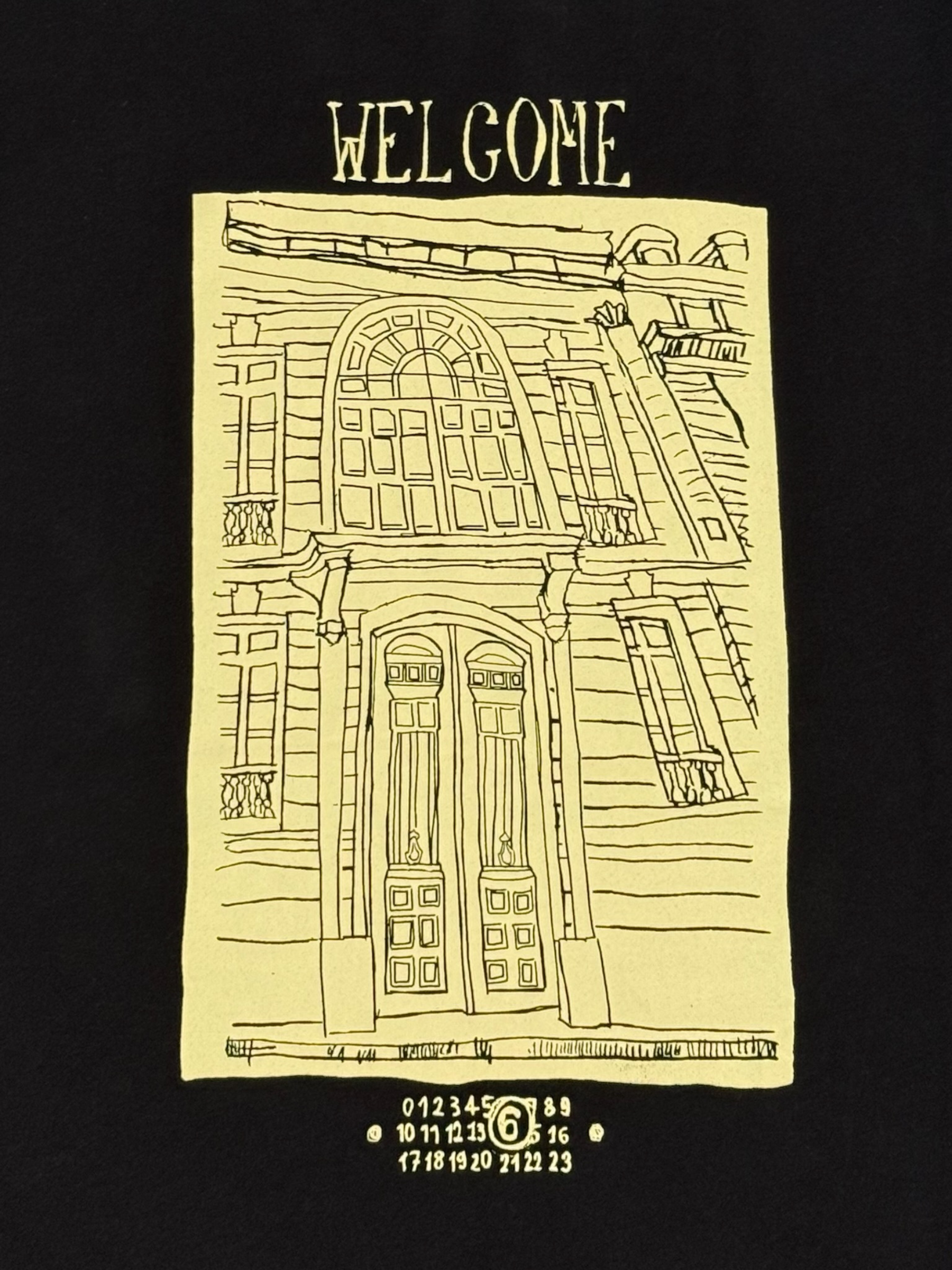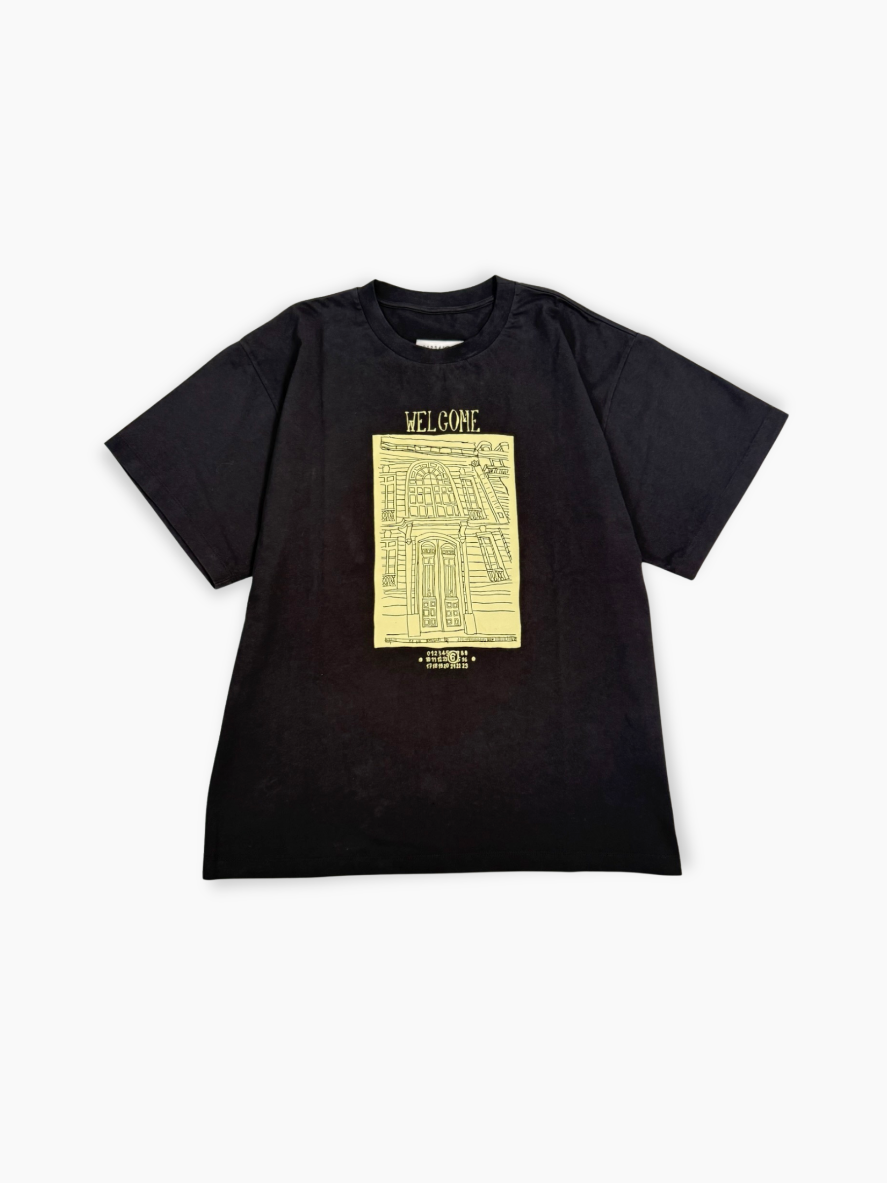 T-shirt nera in cotone con vestibilità morbida, caratterizzata da una stampa gialla frontale con scritta Welcome e grafica architettonica di un palazzo. Un capo casual che unisce estetica artistica e stile urbano, perfetto per outfit streetwear contemporanei.