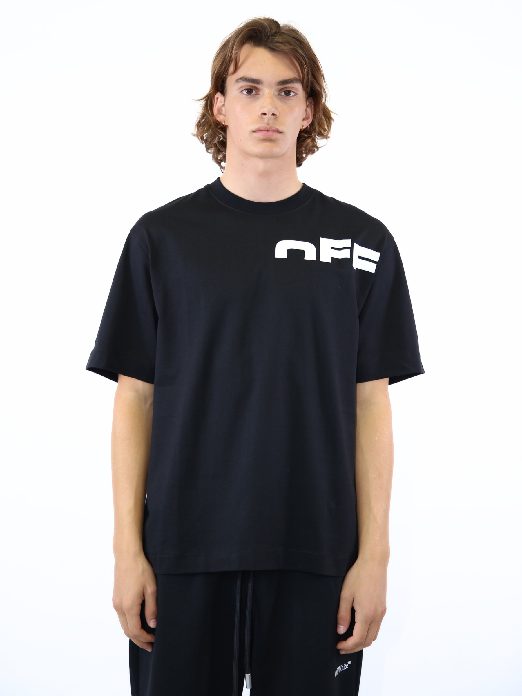 T-shirt in jersey di cotone nero con stampa Off-White “OFF/WHITE™” su fronte e retro. Il design pulito e contemporaneo riflette lo stile iconico del brand, fondendo semplicità e street attitude. Perfetta da abbinare a jeans o pantaloni cargo per un look urbano dal carattere deciso.