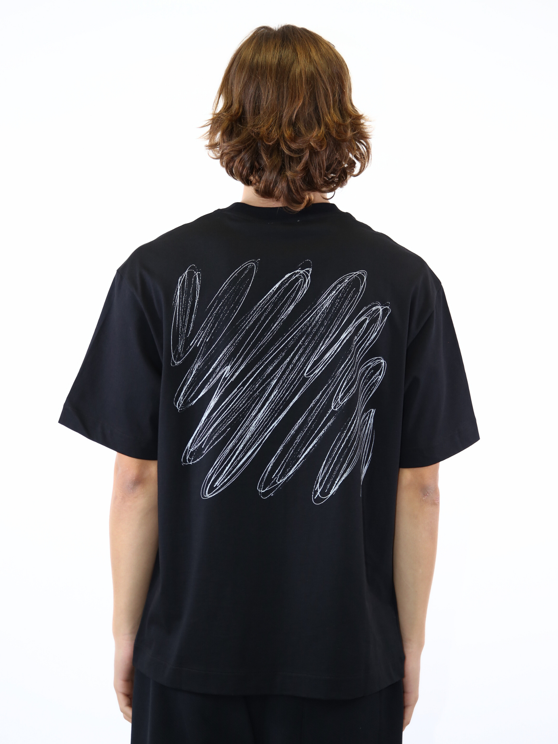 T-shirt in jersey di cotone nero firmata Off-White con logo “OFF” stampato sul petto e grafica “Scribble Diags” sul retro. Un capo dal carattere artistico e contemporaneo, che reinterpreta l’iconico motivo diagonale del brand in chiave creativa. Perfetta per chi ama lo streetwear con personalità.