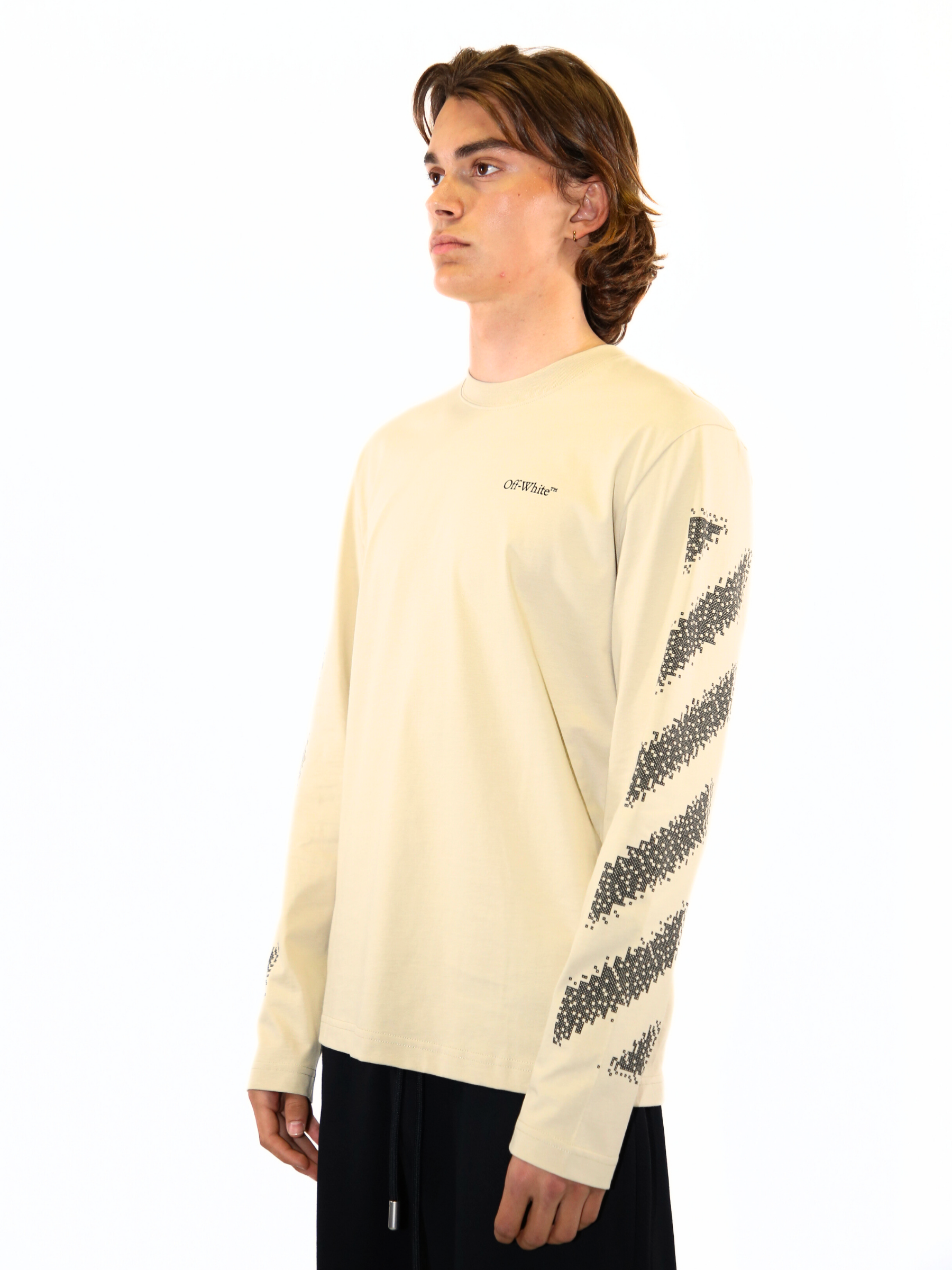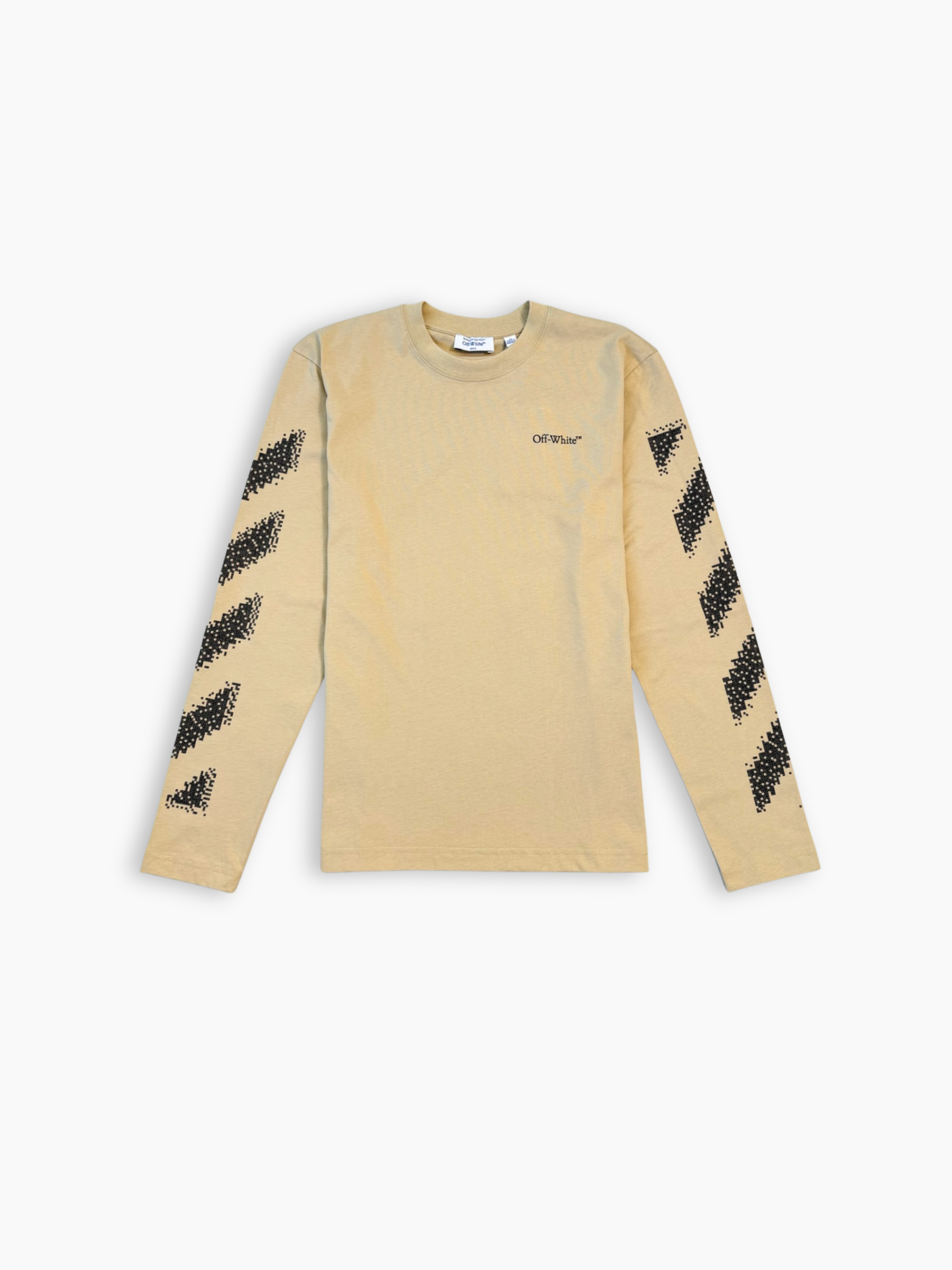 Maglia beige a maniche lunghe firmata Off-White, realizzata in morbido cotone. Il modello presenta scollo rotondo, vestibilità regolare e stampa logo “OFF” sul petto. Le bande diagonali nere lungo le maniche donano un tocco grafico deciso e inconfondibile, tipico del brand. Un capo dallo stile essenziale ma d’impatto, perfetto per un look streetwear contemporaneo.