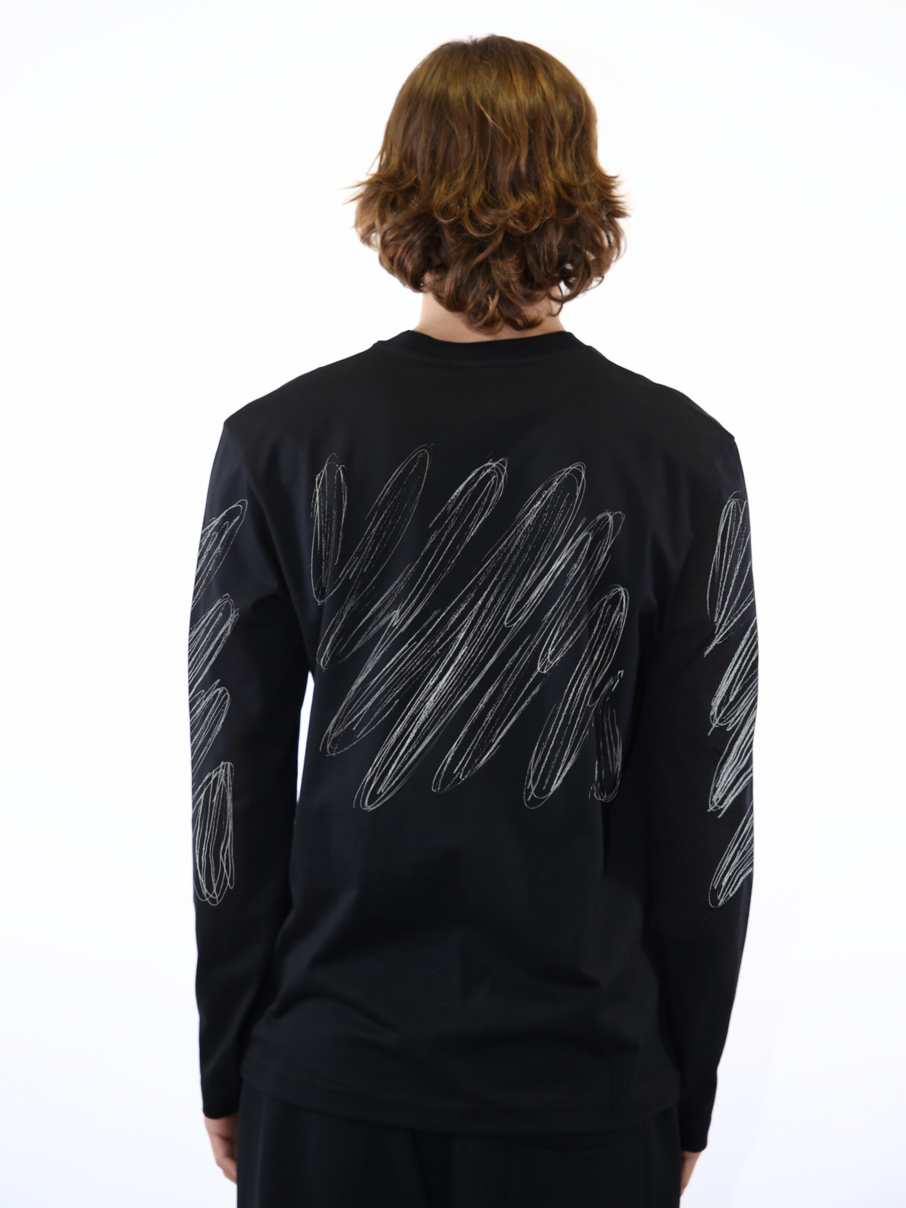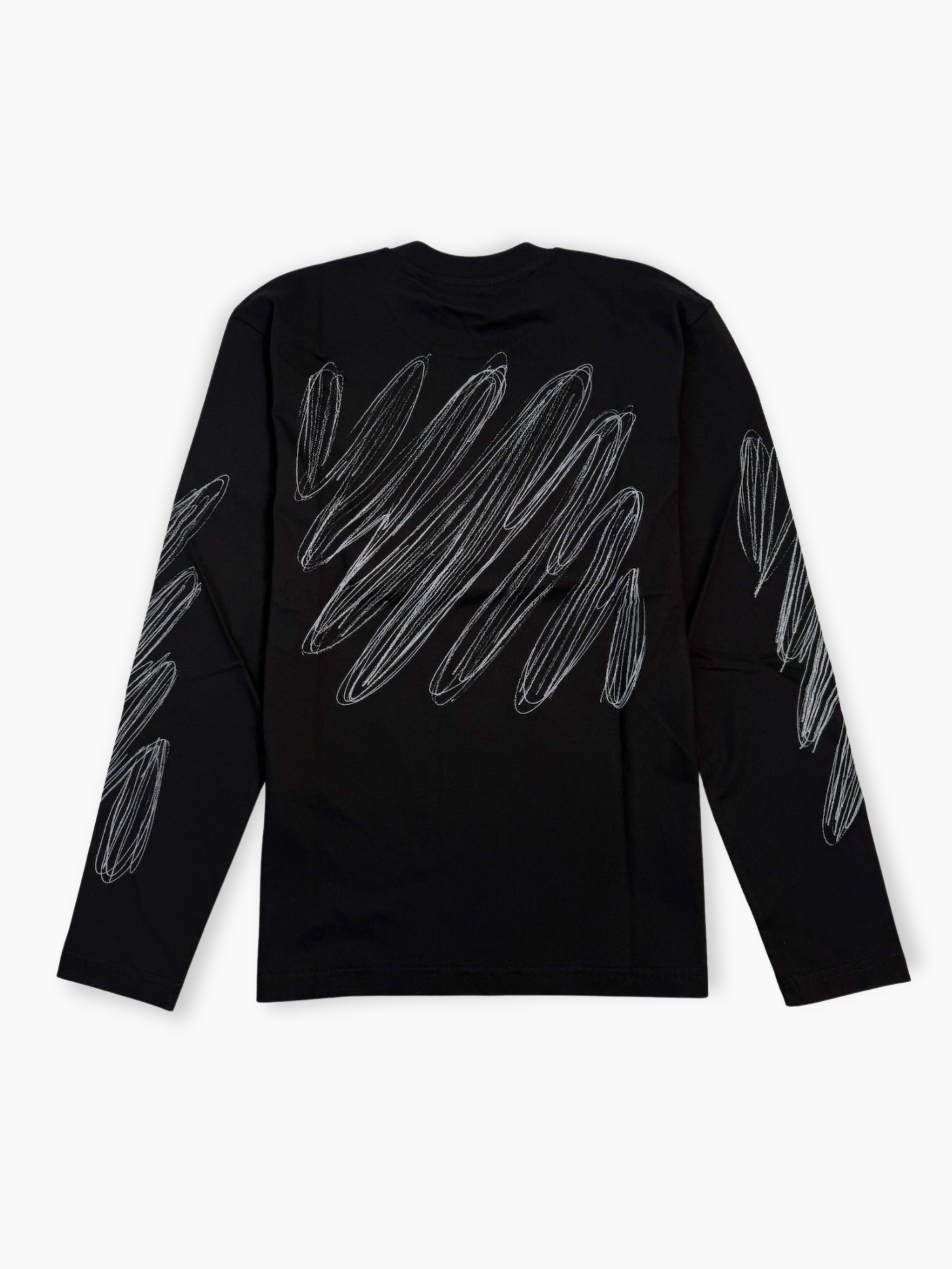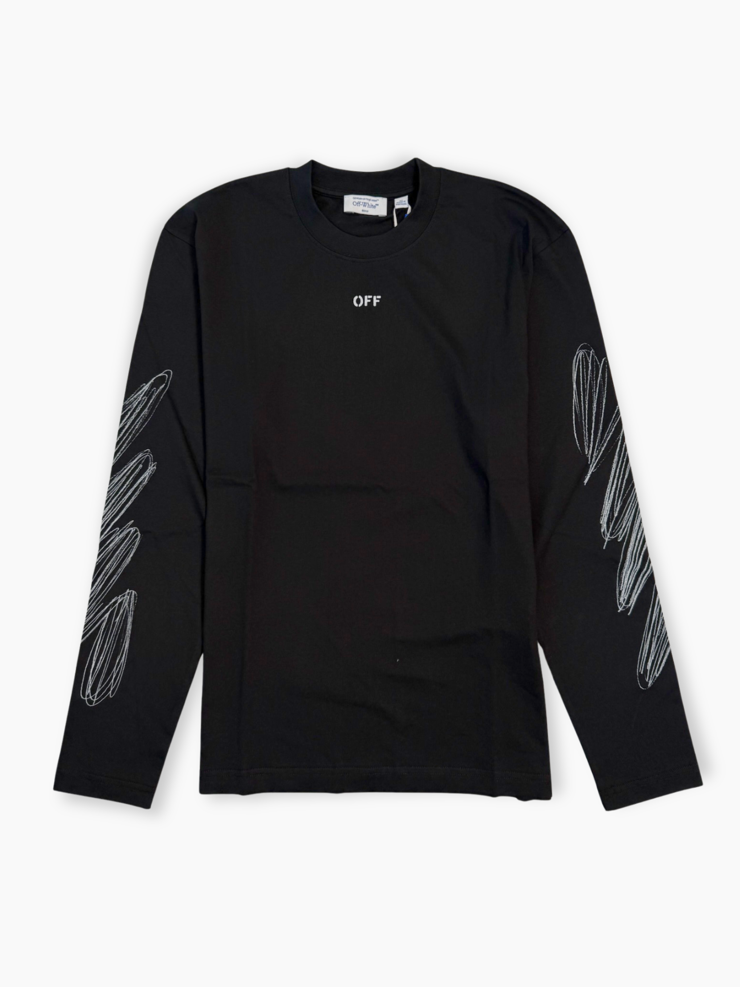 Maglia nera a maniche lunghe firmata Off-White, realizzata in morbido cotone. Il modello presenta scollo rotondo, stampa logo “OFF” sul petto e motivo sfumato tono su tono sul retro e sulle maniche. Dallo stile minimale ma d’impatto, è il capo ideale per chi cerca un’estetica urbana e contemporanea.