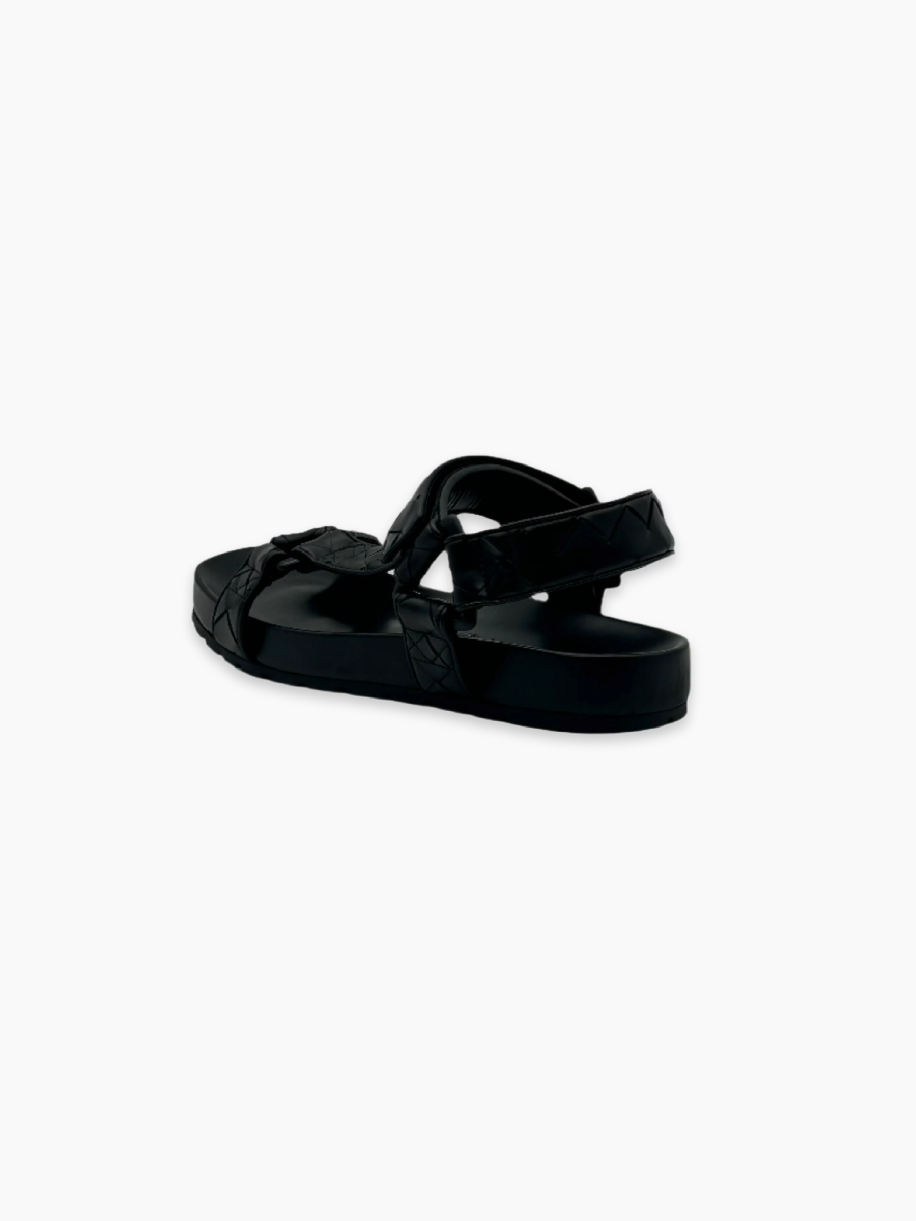 Sandali Bottega Veneta in pelle nera dal design moderno e minimalista. Caratterizzati da fasce imbottite con lavorazione trapuntata e cinturino regolabile alla caviglia, offrono una calzata confortevole e uno stile sofisticato. Perfetti per completare look estivi con un tocco di eleganza contemporanea.