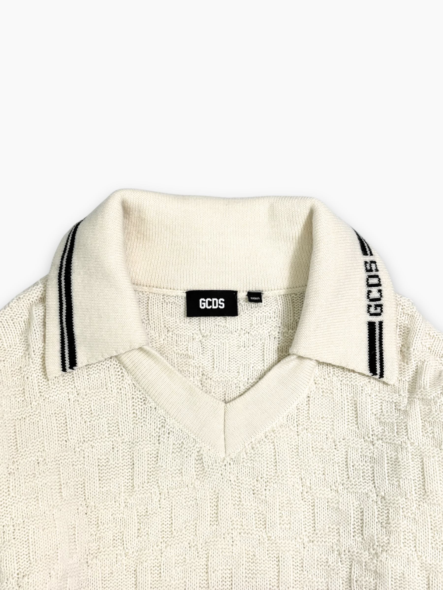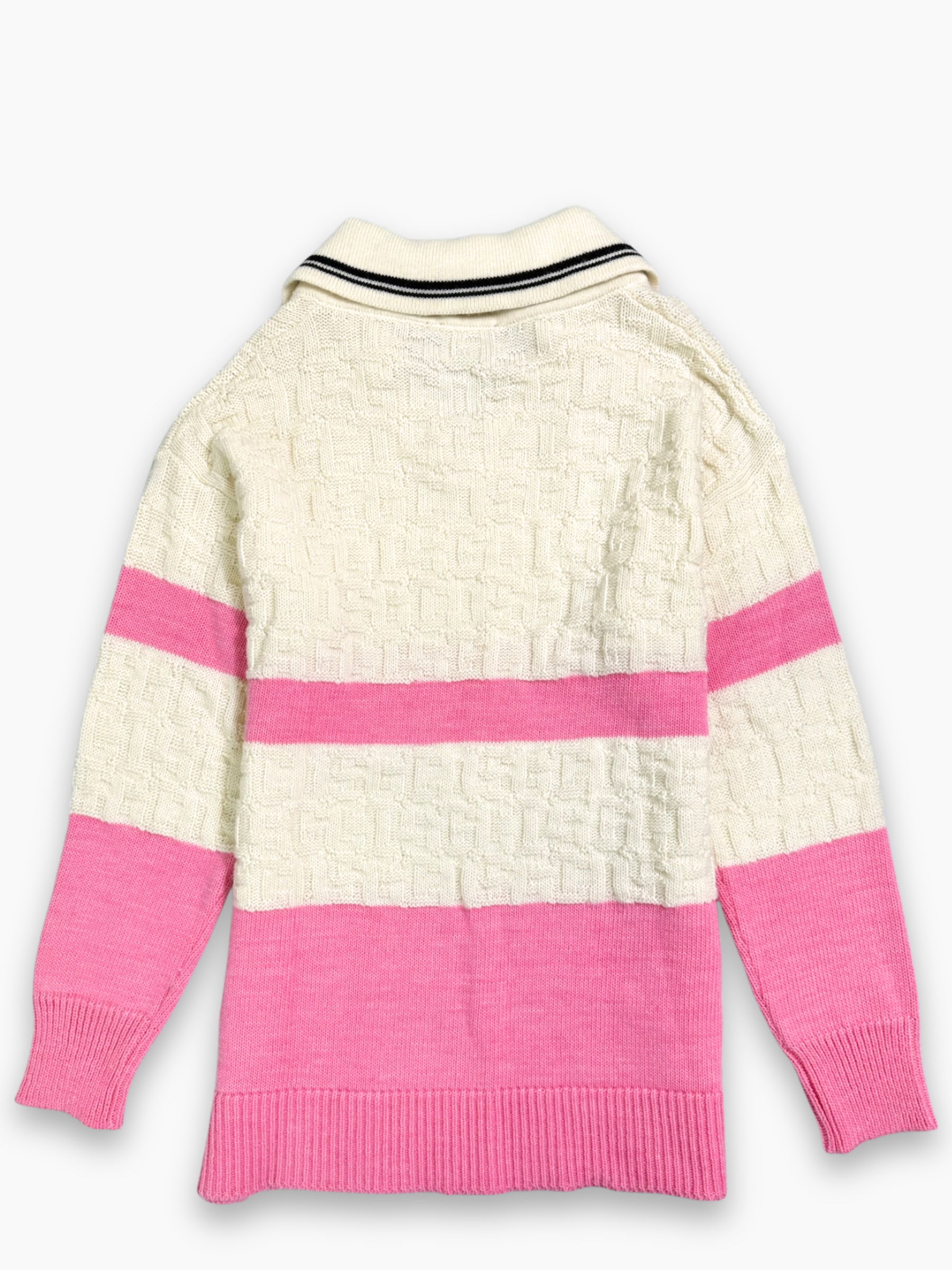 Maglione GCDS a righe bianche e rosa con lavorazione in maglia strutturata e colletto polo con logo ricamato. Il fit morbido e le linee pulite lo rendono un capo versatile, perfetto per look casual dal tocco raffinato e contemporaneo.