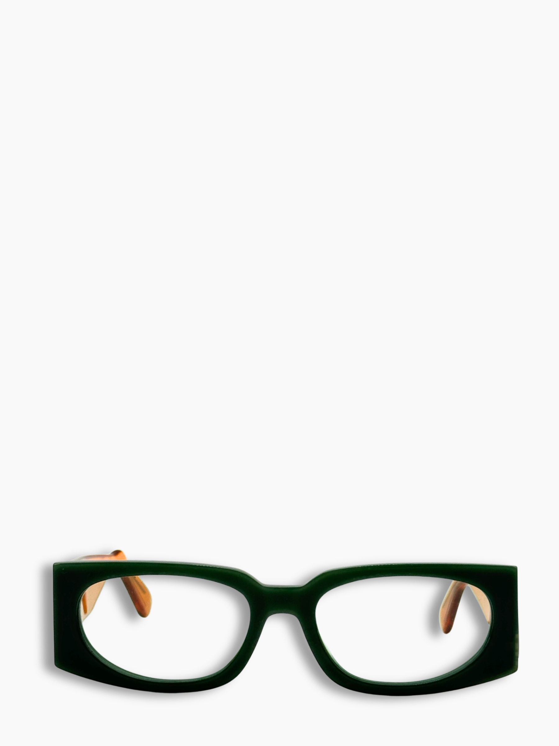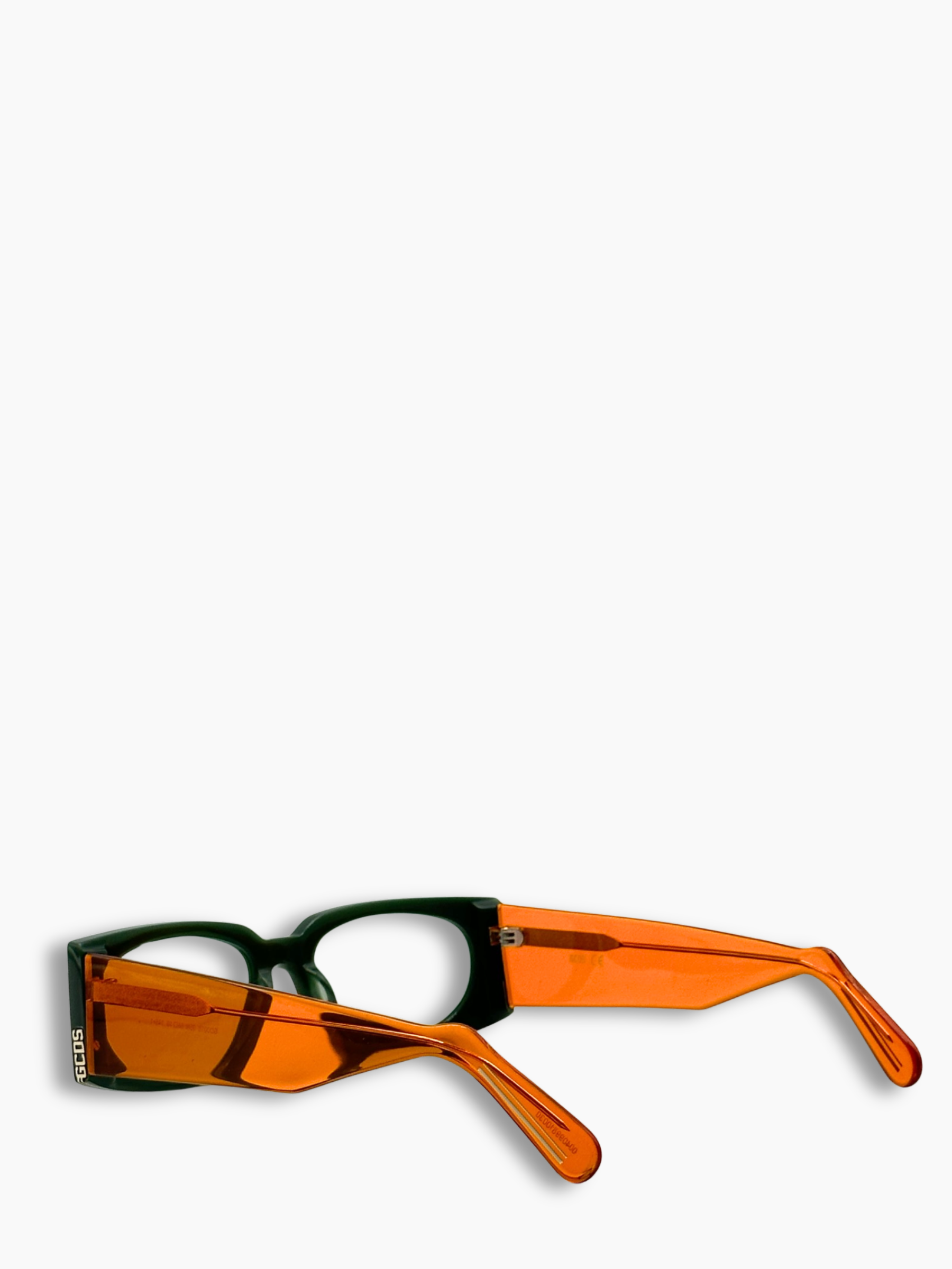Occhiali da vista dallo stile deciso, caratterizzati da una montatura frontale verde scuro e aste arancioni trasparenti, per un contrasto moderno e d’impatto. La silhouette rettangolare addolcita rende il modello versatile e distintivo, perfetto per chi ama accessori che si fanno notare senza rinunciare all’eleganza.