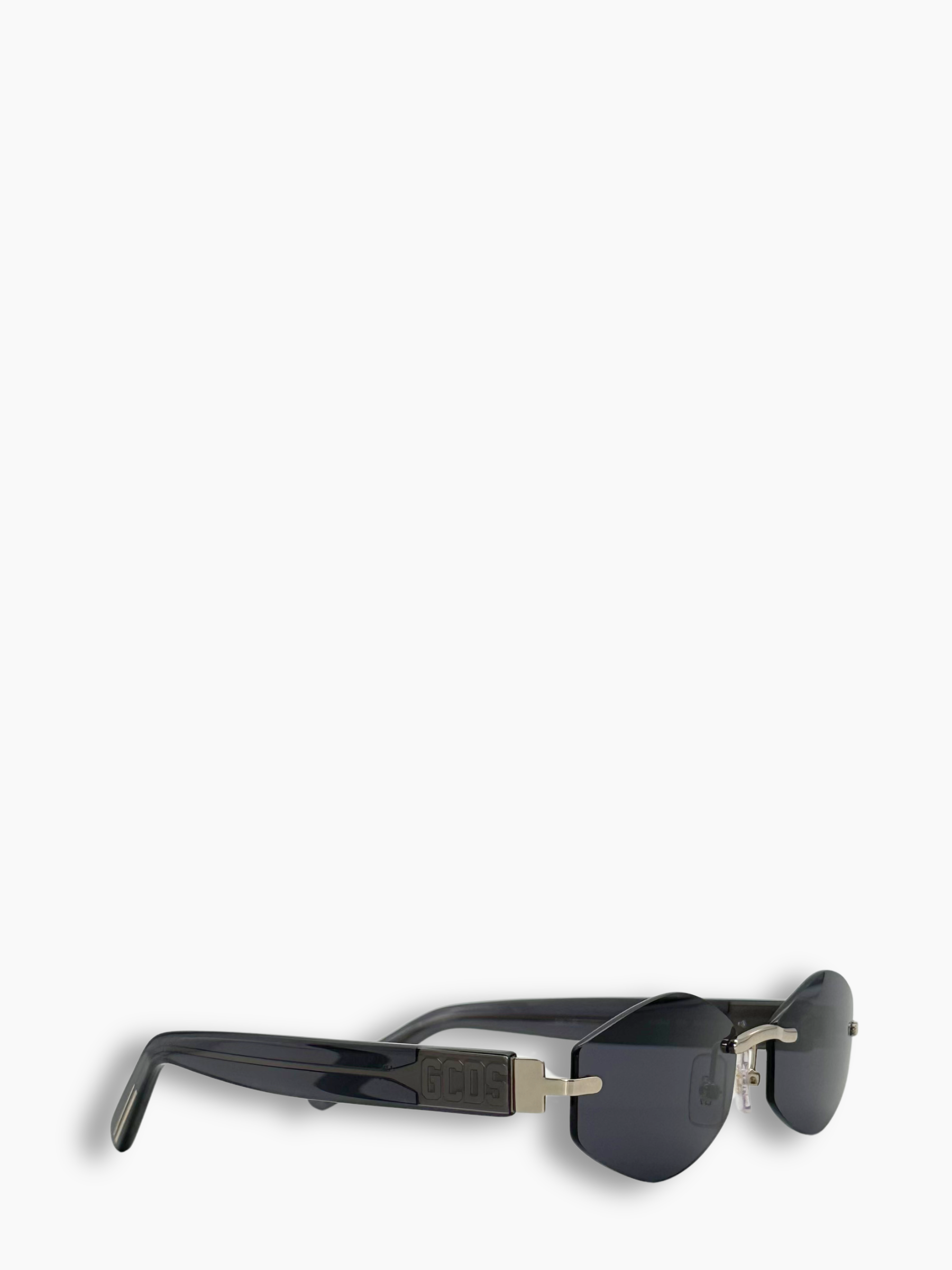 Occhiali dal design leggero e moderno, caratterizzati da lenti scure dalla forma geometrica e struttura rimless senza montatura. Lo stile minimal e futuristico li rende perfetti per chi cerca un accessorio discreto ma altamente distintivo. Il ponte e le aste in metallo aggiungono un tocco elegante e contemporaneo.