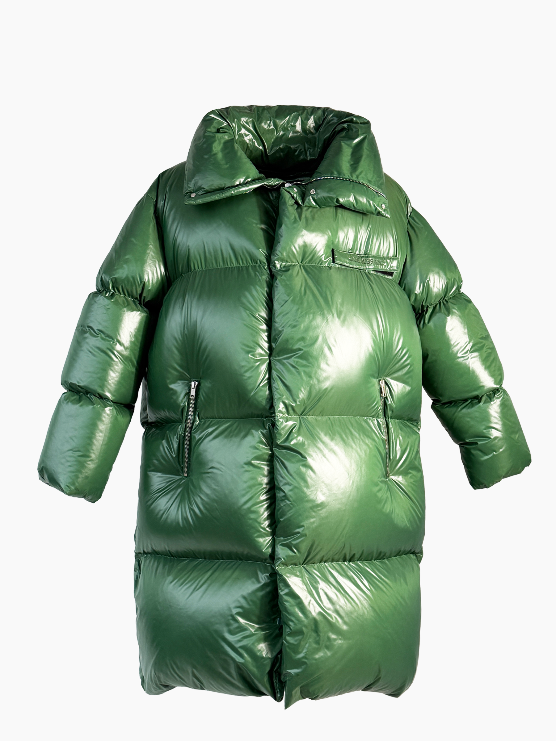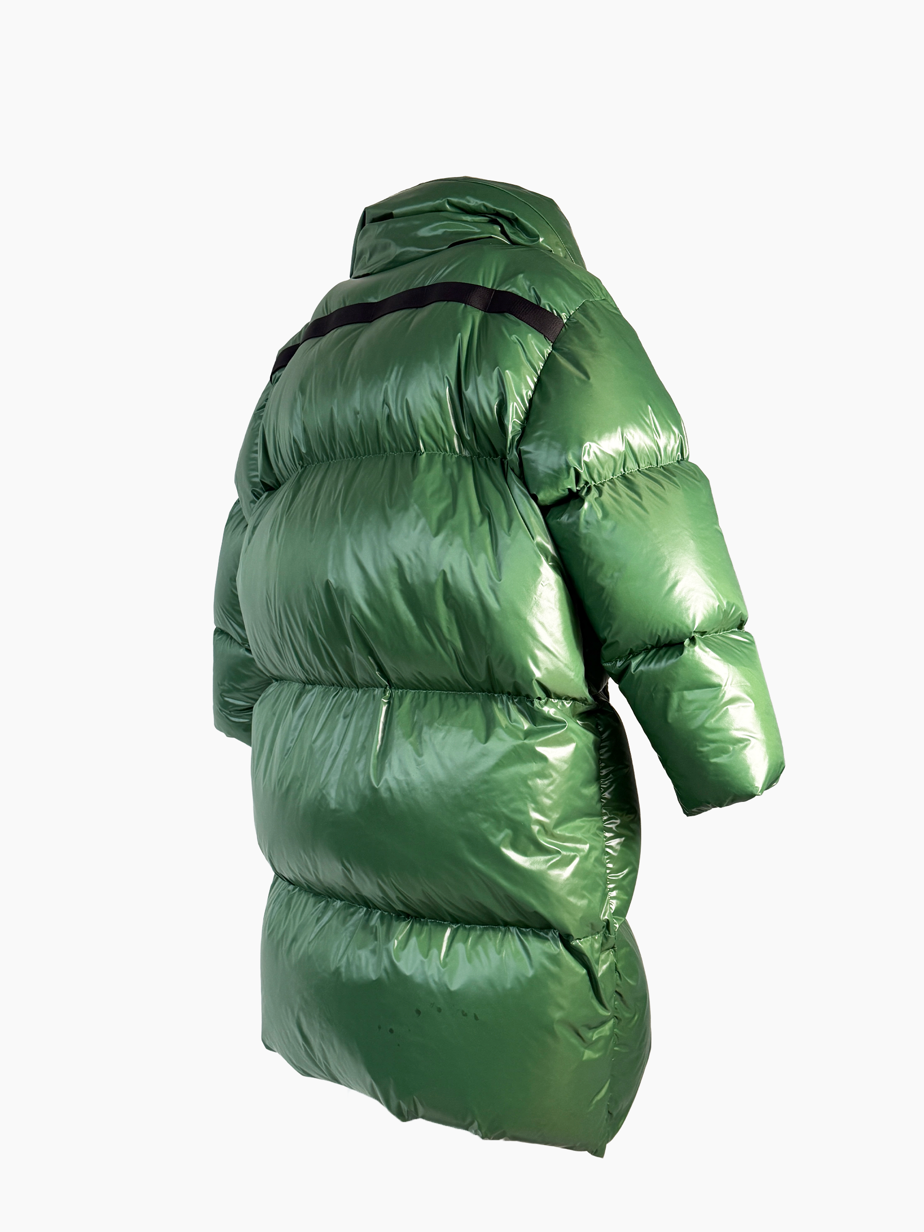 Piumino lungo dal volume importante, caratterizzato da una finitura lucida e una silhouette oversize che avvolge e protegge dal freddo. Il design presenta un ampio collo strutturato, maniche imbottite e tasche laterali con zip, per un’estetica contemporanea e funzionale. Perfetto per look decisi e urban nelle giornate più fredde.