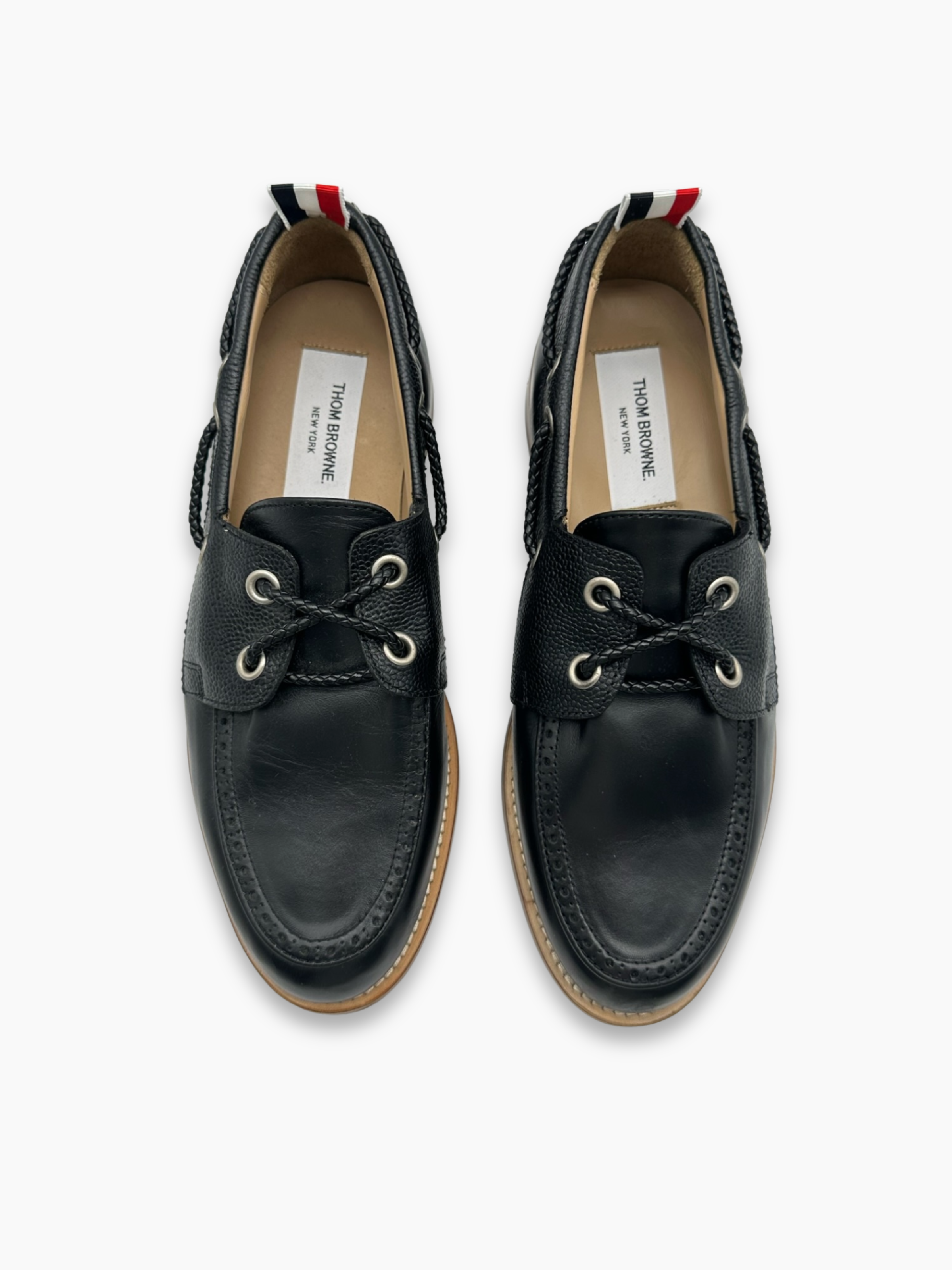 Mocassini da barca Thom Browne in pelle liscia e martellata nera, con design classico impreziosito da occhielli metallici e impunture a vista. Il dettaglio iconico del nastro tricolore posteriore aggiunge un tocco distintivo a una calzatura senza tempo, perfetta per uno stile sofisticato ma rilassato. Suola in cuoio con tacco in legno a contrasto.