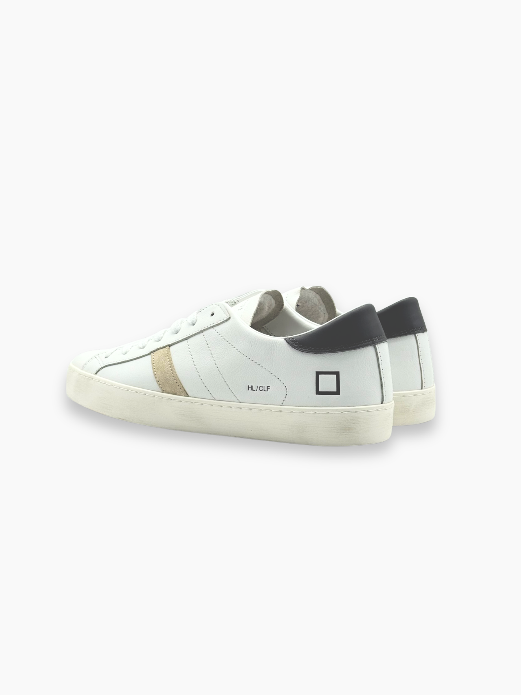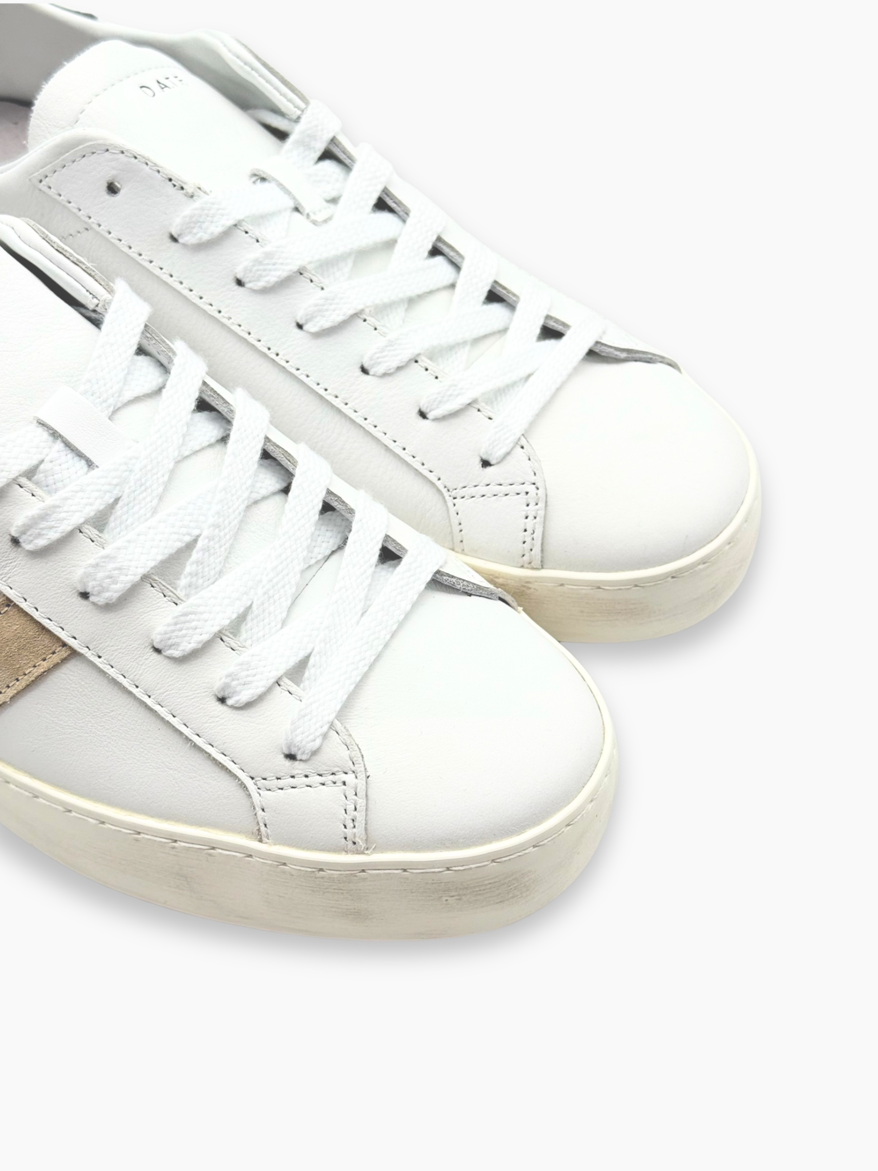 Sneakers D.A.T.E. dal design essenziale e contemporaneo. Realizzate in pelle bianca con dettagli grigi e beige, offrono un perfetto equilibrio tra stile minimal e comfort quotidiano, ideali per un look urbano raffinato.