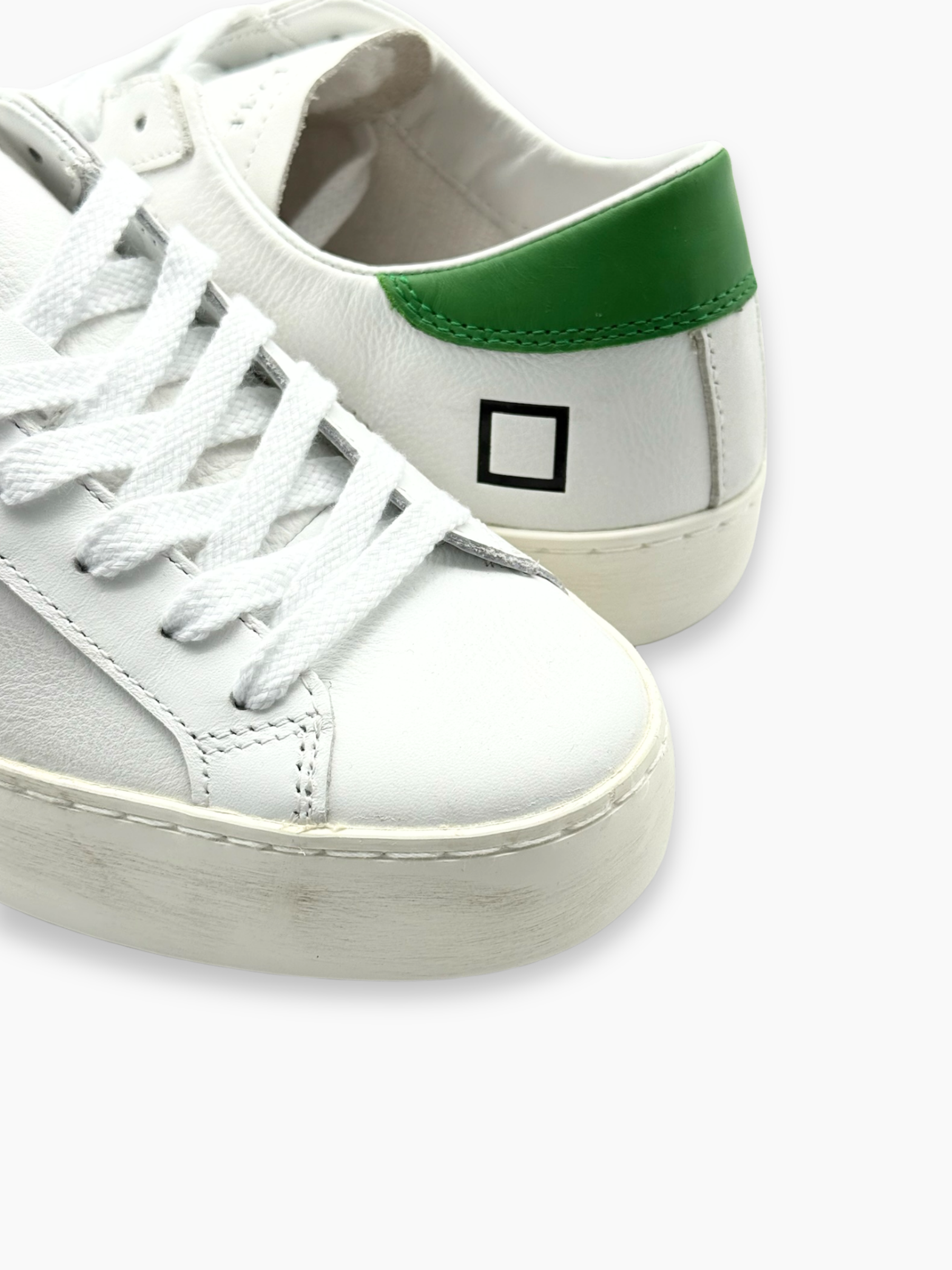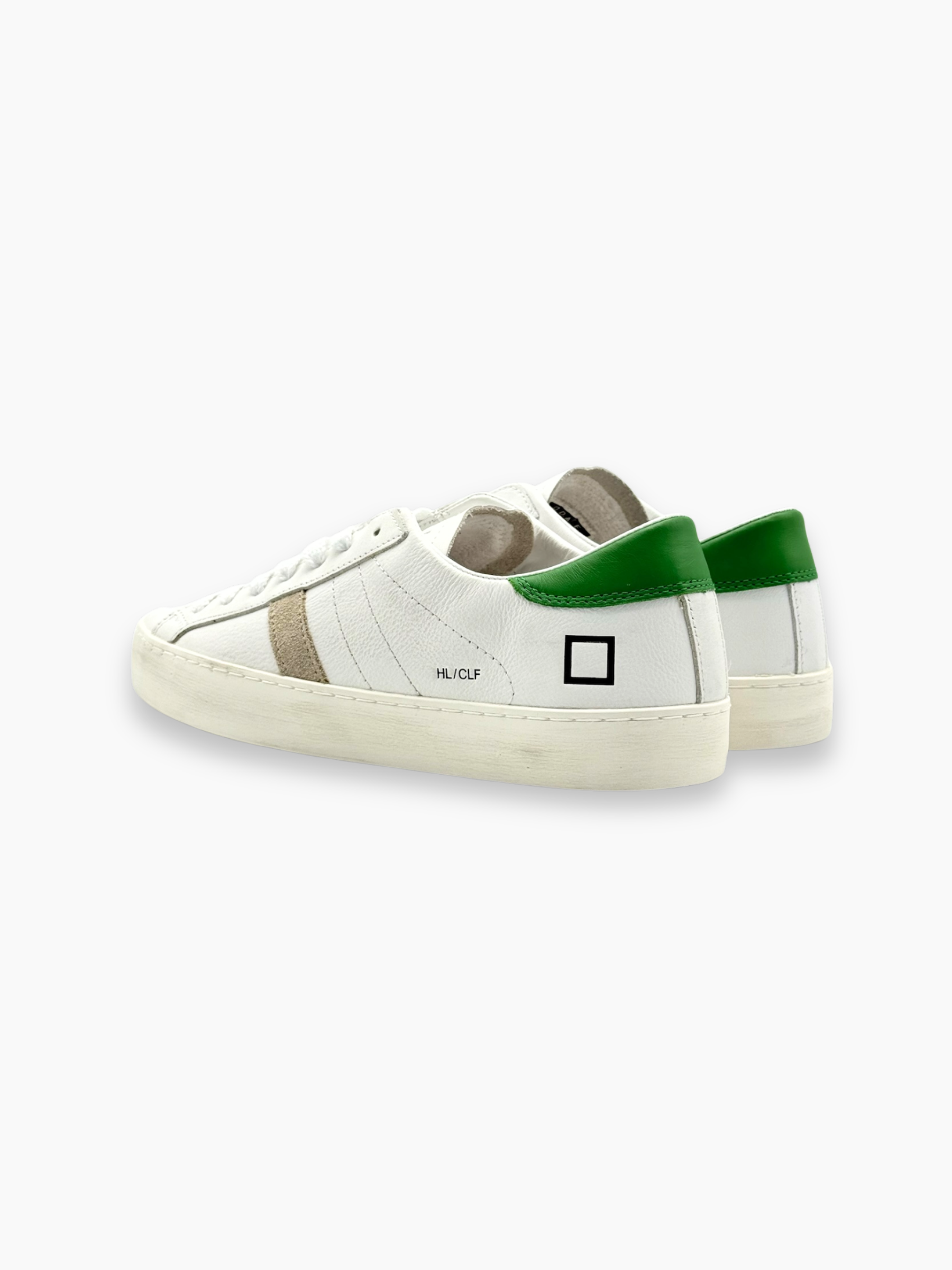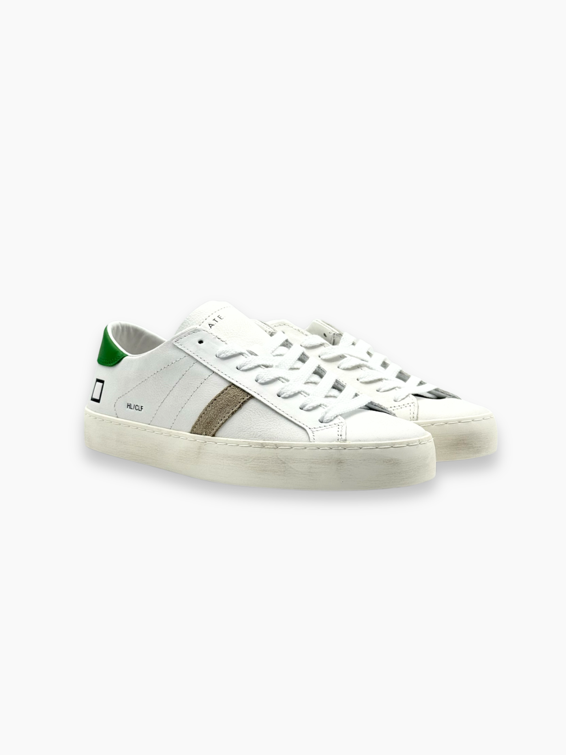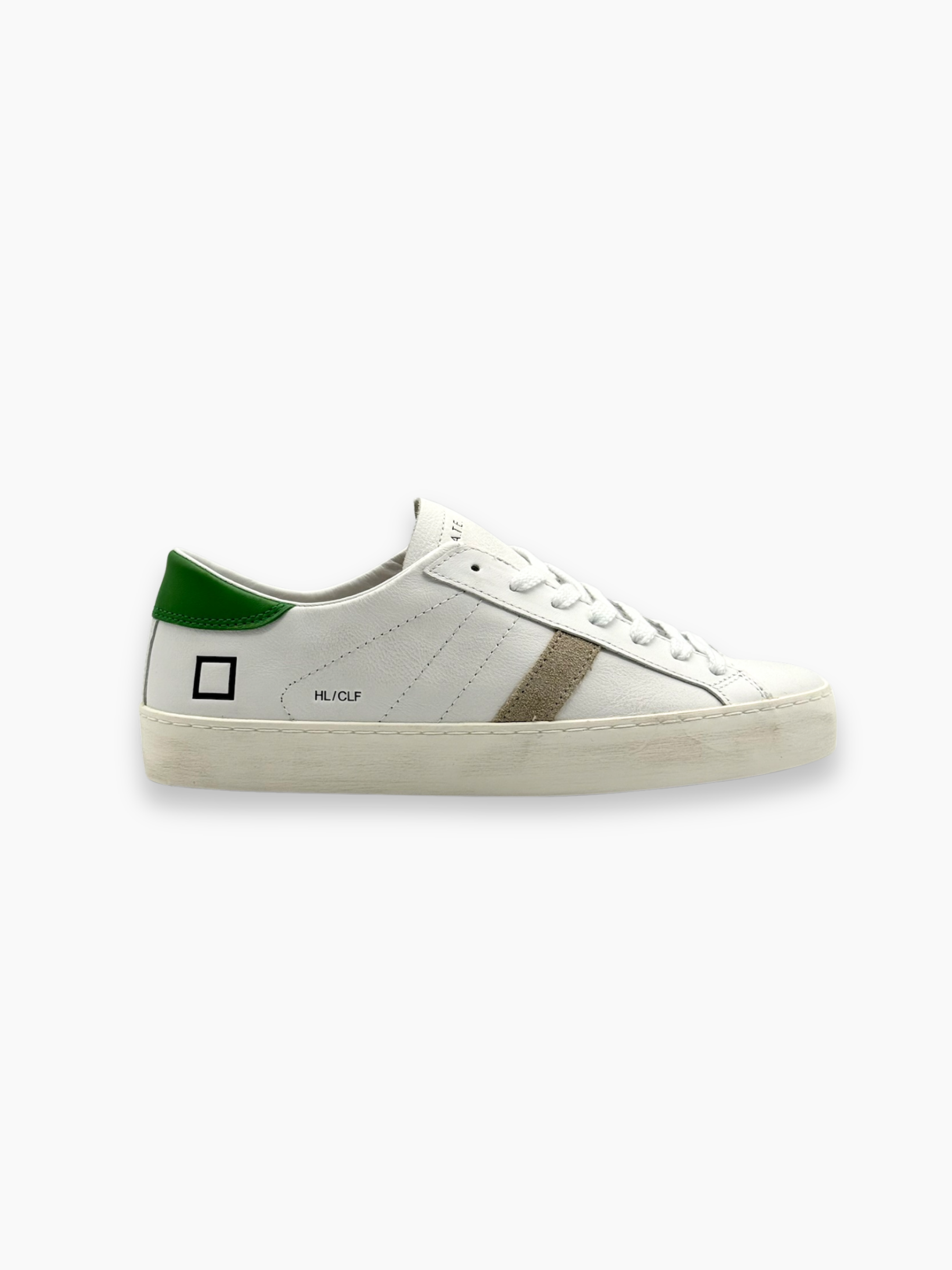 Sneakers D.A.T.E. dal design pulito e minimalista, realizzate in pelle bianca con tallone verde e dettaglio laterale in suede beige. Uno stile essenziale e versatile, perfetto per look casual e contemporanei.