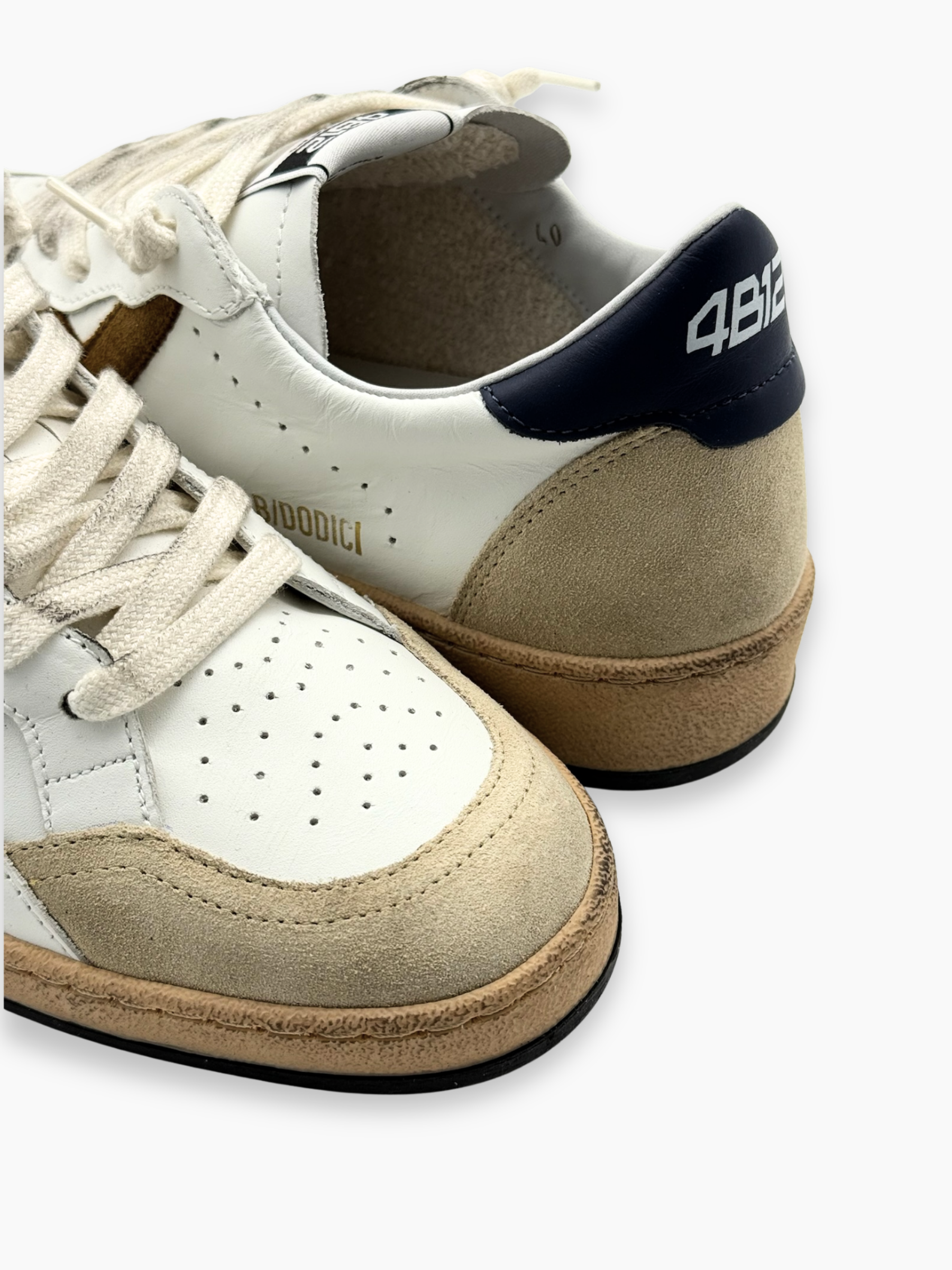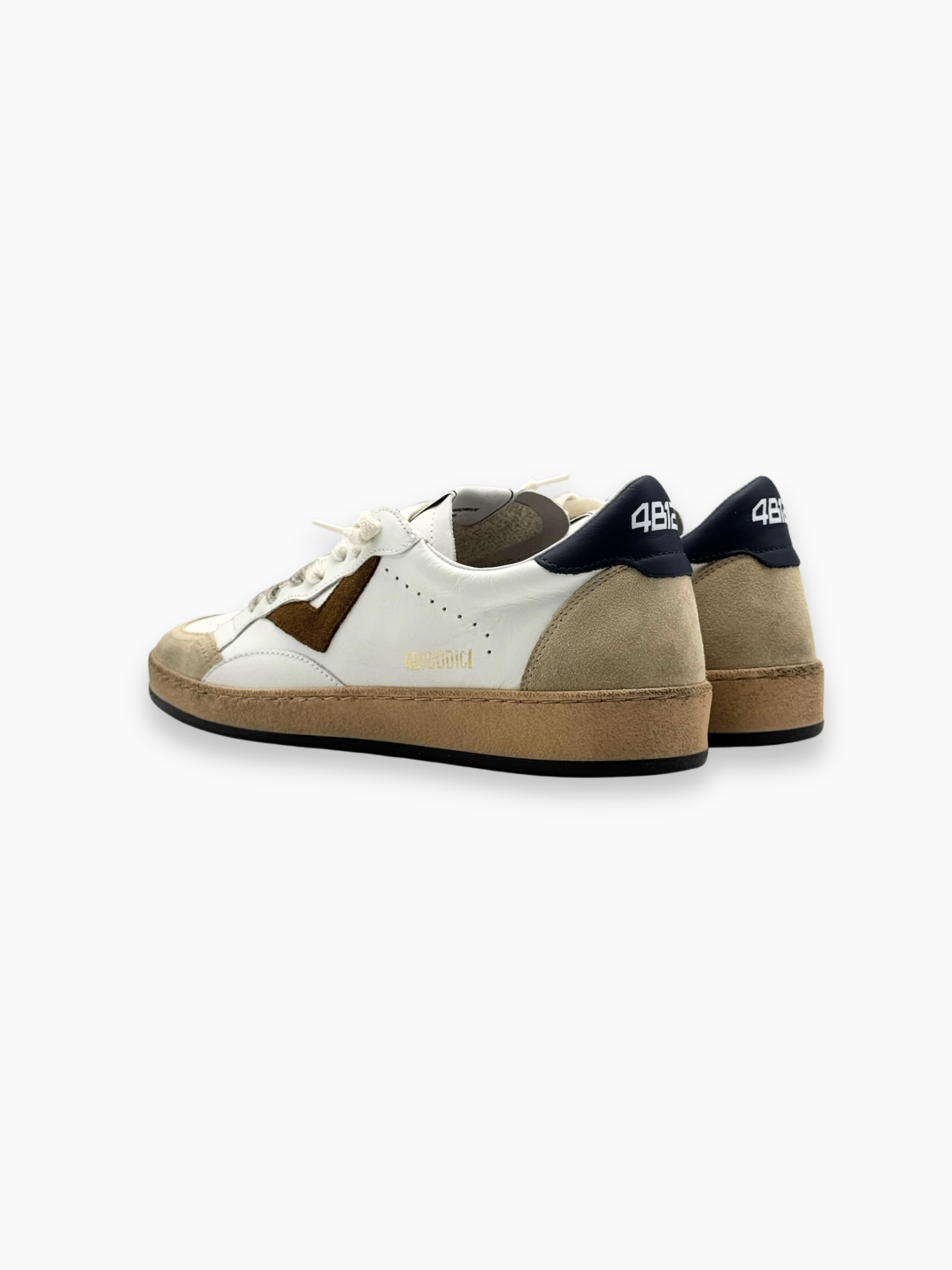 Sneakers 4B12 dal design retrò e raffinato, realizzate in pelle bianca con inserti in suede beige e dettaglio marrone sul lato. La suola effetto vintage e il tallone blu scuro aggiungono un tocco sportivo e distintivo, perfetto per ogni look casual.